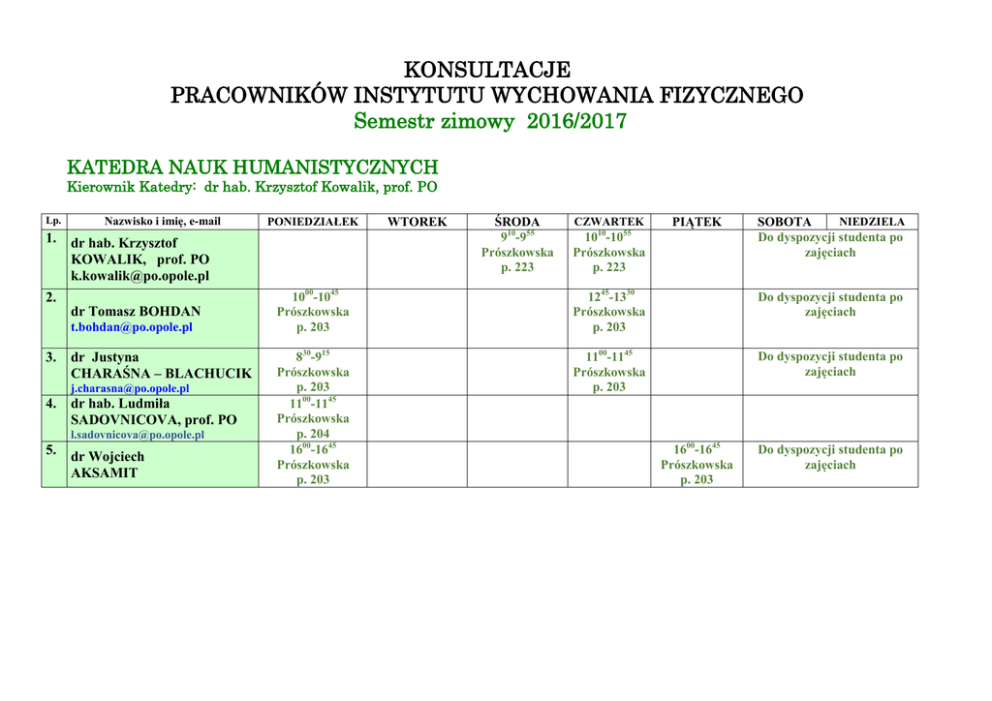 KONSULTACJE PRACOWNIKÓW INSTYTUTU WYCHOWANIA FIZYCZNEGO Semestr zimowy 2016/2017 KATEDRA NAUK HUMANISTYCZNYCH Kierownik Katedry: dr hab. Krzysztof Kowalik, prof. PO Lp. 1. Nazwisko i imię, e-mail dr hab. Krzysztof KOWALIK, prof. PO [email protected] 2. dr Tomasz BOHDAN [email protected] 3. dr Justyna CHARAŚNA – BLACHUCIK [email protected] 4. dr hab. Ludmiła SADOVNICOVA, prof. PO [email protected] 5. PONIEDZIAŁEK dr Wojciech AKSAMIT WTOREK ŚRODA 910-955 Prószkowska p. 223 CZWARTEK 10 PIĄTEK 55 10 -10 Prószkowska p. 223 NIEDZIELA SOBOTA Do dyspozycji studenta po zajęciach 1000-1045 Prószkowska p. 203 1245-1330 Prószkowska p. 203 Do dyspozycji studenta po zajęciach 830-915 Prószkowska p. 203 1100-1145 Prószkowska p. 204 1600-1645 Prószkowska p. 203 1100-1145 Prószkowska p. 203 Do dyspozycji studenta po zajęciach 1600-1645 Prószkowska p. 203 Do dyspozycji studenta po zajęciach KATEDRA BIOMECHANIKI Kierownik Katedry dr hab. Michał Kuczyński prof. PO 6. dr hab. prof. PO Michał KUCZYŃSKI [email protected] 7. [email protected] dr Bożena WOJCIECHOWSKA -MASZKOWSKA 15 dr Dorota BORZUCKA 1800 – 1845 Małopolska [email protected] 9. mgr Marcin WIELOCH [email protected] 10. mgr Zbigniew REKTOR [email protected] 00 00 9 - 10 Prószkowska p. 329 [email protected] 8. Do dyspozycji studenta po zajęciach 1525-1725 Prószkowska p. 202 1430- 1515 Prószkowska p. 310/ Wodna Nuta 45 11 - 11 Prószkowska p. 329 Do dyspozycji studenta po zajęciach 1800 – 1845 Małopolska Do dyspozycji studenta po zajęciach 1300- 1345 Prószkowska p. 310/ Wodna Nuta 1730- 1815 Małopolska Do dyspozycji studenta po zajęciach 1730- 1815 Małopolska Do dyspozycji studenta po zajęciach KATEDRA WYCHOWANIA FIZYCZNEGO I SPORTU Kierownik Katedry dr hab. Rafał TATARUCH prof. PO 11. prof. dr hab. Józef WOJNAR [email protected] 12. dr hab. Rafał Tataruch [email protected] 13. prof. dr hab. Ivan CILLIK 14. dr Dariusz NAWARECKI [email protected] 15. mgr Bożena BANIAK [email protected] 1000 – 1045 Prószkowska p. 33 1145 – 1230 Prószkowska Hala p. 35 1800-1900 Luboszycka [email protected] 17. mgr Waldemar FIRLUS 18. mgr Kordian MAZURKIEWICZ 830-915 Prószkowska p. 321 900 – 945 Luboszycka Sala gimn. P. 2 Do dyspozycji studenta po zajęciach 950-1035 Prószkowska Hala p. 120 16. mgr Roman FIRLUS 1430-1515 Prószkowska p. 205 1515- 1600 Hala p.122 Prószkowska 1315- 1415 Hala p.122 Prószkowska 1200 – 1245 Prószkowska p. 33 1035-1120 Prószkowska Hala p. 120 Do dyspozycji studenta po zajęciach Do dyspozycji studenta po zajęciach Do dyspozycji studenta po zajęciach KATEDRA SPORTÓW INDYWIDUALNYCH Kierownik Katedry prof. dr hab. Janusz Iskra 1100-1145 Prószkowska 9 p. 328 19. prof. dr hab. Janusz ISKRA [email protected] 20. 1135-1235 Prószkowska Hala p. 6 dr Katarzyna SOJKA – KRAWIEC [email protected] 830-930 Stadion Opolskich Olimpijczyków 21. dr Ryszard MARCINÓW [email protected] 22. dr inż. Magdalena TATARUCH 23. mgr Danuta PLEWNIA [email protected] Do dyspozycji studenta po zajęciach Do dyspozycji studenta po 1325 – 1435 zajęciach Prószkowska Hala p. 6 1325-1425 Od 3.10.20169.11.2016 Stadion Opolskich Olimpijczyków Od 16.11.2016 Prószkowska Hala 122/Bieżnia Do dyspozycji studenta po zajęciach URLOP WYCHOWAWCZY 1700-1745 Prószkowska Hala 122 Do dyspozycji studenta po zajęciach KATEDRA METODYKI WYCHOWANIA FIZYCZNEGO Kierownik Katedry dr hab. Cezary Kuśnierz prof. PO 24. dr hab. Jerzy POŚPIECH, prof. PO [email protected] 25. dr Stanisław SZCZEPAŃSKI s.szczepań[email protected] 1300-1345 Prószkowska p. 32 26. dr hab. Cezary KUŚNIERZ, prof. PO [email protected] 27. dr Marek JAGUSZ [email protected] 28. dr Paweł NOWAK [email protected] 29. dr Krzysztof ZIEMBA [email protected] 1000 – 1045 1620-1705 Prószkowska p. 206 830-915 Luboszycka Hala 15 9 – 1000 Prószkowska p. 26 lub p. 32 Do dyspozycji studenta po zajęciach Do dyspozycji studenta po zajęciach 1300-1430 Prószkowska p. 28 Do dyspozycji studenta po zajęciach 1345 – 1430 Prószkowska p. 28 Do dyspozycji studenta po zajęciach 800 – 900 Stadion LA Do dyspozycji studenta po 930 – 1030 zajęciach Stadion LA KATEDRA ANTROPOMOTORYKI Kierownik Katedry dr hab. Zbigniew Borysiuk, prof. PO 30. dr hab. Zbigniew BORYSIUK, prof. PO [email protected] 31. 1100 – 1145 Prószkowska p. 35 1530 – 1615 Prószkowska Hala 126 830 – 915 Prószkowska p. 305 dr Paweł PAKOSZ [email protected] 32. dr Mariusz KONIECZNY [email protected] 33. dr Anna ŁUKANOVAJAKUBOWSKA [email protected] 34. dr Monika BŁASZCZYSZYN [email protected] 35. mgr Andrzej BANEK [email protected] 36. mgr Katarzyna PIECHOTA [email protected] 1000 – 1045 Prószkowska p. 35 1340 – 1425 Prószkowska Hala 124 1015 – 1100 Prószkowska p. 230 1100- 1145 Prószkowska Hala 120 Do dyspozycji studenta po zajęciach 1130-121 5 Prószkowska Hala 126 1145 – 1230 Prószkowska p. 305 1100-1145 Prószkowska Hala 124 1430- 1515 Prószkowska Hala 120 1200 – 1245 Prószkowska p. 203 1005 – 1050 Prószkowska p. 203 Do dyspozycji studenta po zajęciach Do dyspozycji studenta po zajęciach Do dyspozycji studenta po zajęciach 1015 – 1100 Do dyspozycji studenta po Prószkowska zajęciach p. 230 Do dyspozycji studenta po zajęciach Do dyspozycji studenta po zajęciach
