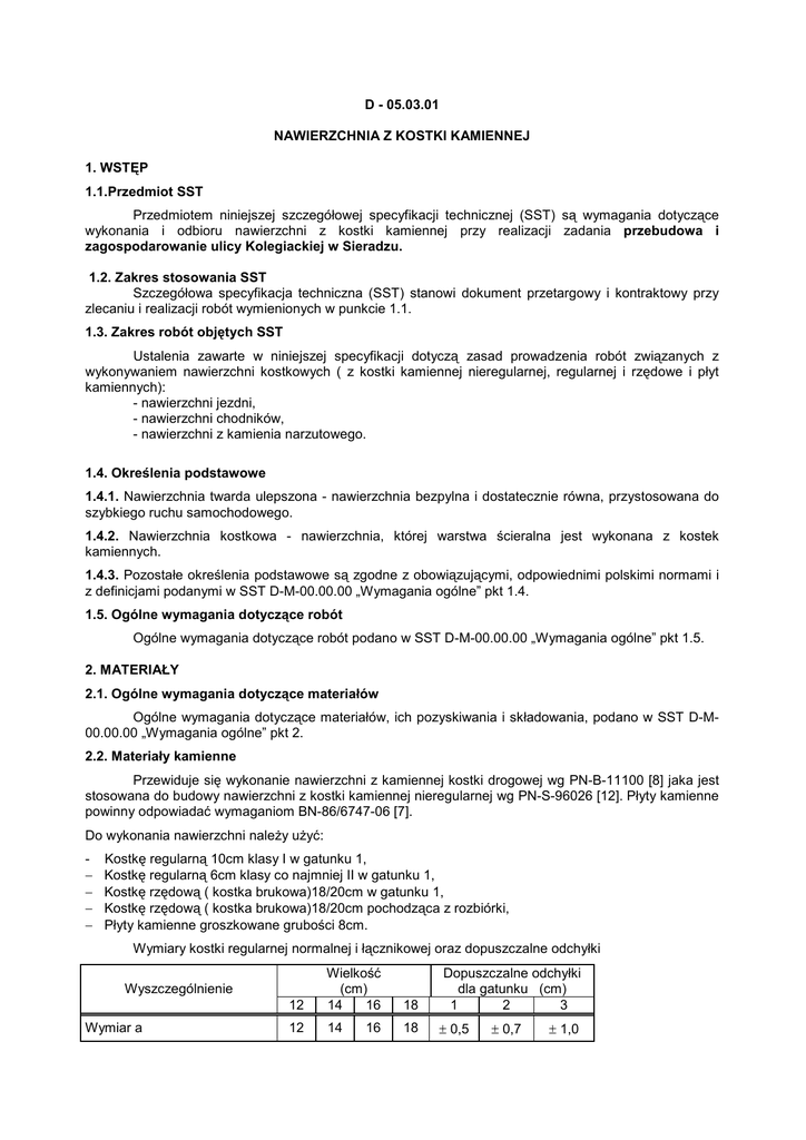 D - 05.03.01 NAWIERZCHNIA Z KOSTKI KAMIENNEJ 1. WSTĘP 1.1.Przedmiot SST Przedmiotem niniejszej szczegółowej specyfikacji technicznej (SST) są wymagania dotyczące wykonania i odbioru nawierzchni z kostki kamiennej przy realizacji zadania przebudowa i zagospodarowanie ulicy Kolegiackiej w Sieradzu. 1.2. Zakres stosowania SST Szczegółowa specyfikacja techniczna (SST) stanowi dokument przetargowy i kontraktowy przy zlecaniu i realizacji robót wymienionych w punkcie 1.1. 1.3. Zakres robót objętych SST Ustalenia zawarte w niniejszej specyfikacji dotyczą zasad prowadzenia robót związanych z wykonywaniem nawierzchni kostkowych ( z kostki kamiennej nieregularnej, regularnej i rzędowe i płyt kamiennych): - nawierzchni jezdni, - nawierzchni chodników, - nawierzchni z kamienia narzutowego. 1.4. Określenia podstawowe 1.4.1. Nawierzchnia twarda ulepszona - nawierzchnia bezpylna i dostatecznie równa, przystosowana do szybkiego ruchu samochodowego. 1.4.2. Nawierzchnia kostkowa - nawierzchnia, której warstwa ścieralna jest wykonana z kostek kamiennych. 1.4.3. Pozostałe określenia podstawowe są zgodne z obowiązującymi, odpowiednimi polskimi normami i z definicjami podanymi w SST D-M-00.00.00 „Wymagania ogólne” pkt 1.4. 1.5. Ogólne wymagania dotyczące robót Ogólne wymagania dotyczące robót podano w SST D-M-00.00.00 „Wymagania ogólne” pkt 1.5. 2. MATERIAŁY 2.1. Ogólne wymagania dotyczące materiałów Ogólne wymagania dotyczące materiałów, ich pozyskiwania i składowania, podano w SST D-M00.00.00 „Wymagania ogólne” pkt 2. 2.2. Materiały kamienne Przewiduje się wykonanie nawierzchni z kamiennej kostki drogowej wg PN-B-11100 [8] jaka jest stosowana do budowy nawierzchni z kostki kamiennej nieregularnej wg PN-S-96026 [12]. Płyty kamienne powinny odpowiadać wymaganiom BN-86/6747-06 [7]. Do wykonania nawierzchni naleŜy uŜyć: − − − − Kostkę regularną 10cm klasy I w gatunku 1, Kostkę regularną 6cm klasy co najmniej II w gatunku 1, Kostkę rzędową ( kostka brukowa)18/20cm w gatunku 1, Kostkę rzędową ( kostka brukowa)18/20cm pochodząca z rozbiórki, Płyty kamienne groszkowane grubości 8cm. Wymiary kostki regularnej normalnej i łącznikowej oraz dopuszczalne odchyłki 12 Wielkość (cm) 14 16 18 12 14 18 Wyszczególnienie Wymiar a 16 Dopuszczalne odchyłki dla gatunku (cm) 1 2 3 ± 0,5 ± 0,7 ± 1,0 Wymiar b Stosunek pola powierzchni dolnej (stopki) do górnej (czoła), nie mniejszy niŜ Nierówności powierzchni górnej (czoła), nie większe niŜ Wypukłość powierzchni bocznej, nie większa niŜ Nierówność powierzchni dolnej (stopki), nie większa niŜ Pęknięcia kostki 18 21 24 27 ± 0,7 ± 1,0 ± 1,2 - - - - 1,0 0,8 0,7 - - - - ± 0,4 ± 0,4 ± 0,6 - - - - 0,4 0,8 0,8 - - - - ± 0,4 - - - - nie bada się niedopuszczalne Krawędzie co najmniej jednej powierzchni kostki gatunku 1 powinny być bez uszkodzeń. Pozostałe krawędzie kostki mogą mieć uszkodzenie długości nie większej niŜ pół wymiaru wysokości kostki (a), natomiast łączna ich długość nie powinna przekraczać wymiaru wysokości kostki (a). Uszkodzenia któregokolwiek z naroŜy kostki gatunku 1 i naroŜy powierzchni górnej (czoła) kostki gatunku 2 i 3 są niedopuszczalne. Szerokość lub głębokość uszkodzenia krawędzi lub naroŜy nie powinna być większa niŜ 0,6 cm. Kostka rzędowa powinna mieć kształt zbliŜony do prostopadłościanu o równoległej powierzchni dolnej do górnej. Cała bryła kostki powinna mieścić się w prostopadłościanie zbudowanym na powierzchni górnej jako podstawie. Kształt kostki rzędowej przedstawia rysunek 2. Rysunek 2. Kształt kostki rzędowej Uszkodzenia krawędzi i naroŜy kostki powinny być nie większe niŜ podane dla gatunku 2 i 3 kostki regularnej. Szerokość lub głębokość uszkodzenia krawędzi lub naroŜy nie powinna być większa niŜ 0,6 cm. Wymiary kostki rzędowej oraz dopuszczalne odchyłki Wielkość (cm) Wyszczególnienie Dopuszczalne odchyłki dla gatunku (cm) 1 2 3 12 14 16 18 Wymiar a 12 14 16 18 ± 0,5 ± 0,7 ± 1,0 Wymiar b od 12 do 24 od 14 do 28 od 16 do 32 od 18 do 36 - - - - - - - 0,8 0,7 0,6 - - - - ± ± 0,6 ± 0,8 Stosunek pola powierzchni dolnej (stopki) do górnej (czoła), nie mniej niŜ Nierówności powierzchni górnej (czoła), nie większe niŜ Pęknięcia kostki 0,4 - - - - niedopuszczalne Inwestor przewiduje iŜ wykonawca dokona ponownego wbudowania materiału kamiennego z rozbiórki po uprzednim czyszczeniu, obróbce i doprowadzeniu do wymaganego I gatunku kostki. Wykonawca winien w trakcie budowy przedstawić rozliczenie się z rozebranego materiału. W przypadku nadmiaru kostki wykonawca przekaŜe oraz przetransportuje ją w wyznaczone miejsce przez inwestora na koszt własny w odległości nie większej niŜ 5km. Natomiast 10% kostki nowej zostanie potrącone od kwoty wynagrodzenia wykonawcy. W przypadku niedoboru materiału kamiennego Inwestor rozliczy się z wykonawcą na podstawie ceny materiału z oferty." Płyty chodnikowe kamienne oraz kostka kamienna powinny być wykonywane z granitu, sjenitu lub bazaltu zgodnie z ustaleniami w dokumentacji projektowej. Materiałami stosowanymi przy wykonaniu nawierzchni brukowcowej, wg PN-B-06101 [19], są: − brukowiec nieobrobiony, obrobiony lub brukowiec płytowany, wg PN-B-11104 [14], − kliniec, wg PN-B-11112 [15], 2.3. Cement Cement stosowany do podsypki i wypełnienia spoin powinien być cementem portlandzkim klasy 32,5, odpowiadający wymaganiom PN-B-19701 [9]. Transport i przechowywanie cementu powinny być zgodne z BN-88/6731-08 [13]. 2.4. Kruszywo Kruszywo na podsypkę i do wypełniania spoin powinno odpowiadać wymaganiom normy PN-B06712 [7]. Na podsypkę stosuje się mieszankę kruszywa naturalnego o frakcji od 0 do 8 mm, a do zaprawy cementowo-piaskowej piaski o frakcji od 0 do 4 mm. Zawartość pyłów w kruszywie na podsypkę cementowo-piaskową nie moŜe przekraczać 3%. Do wypełnienia szczelin naleŜy uŜ