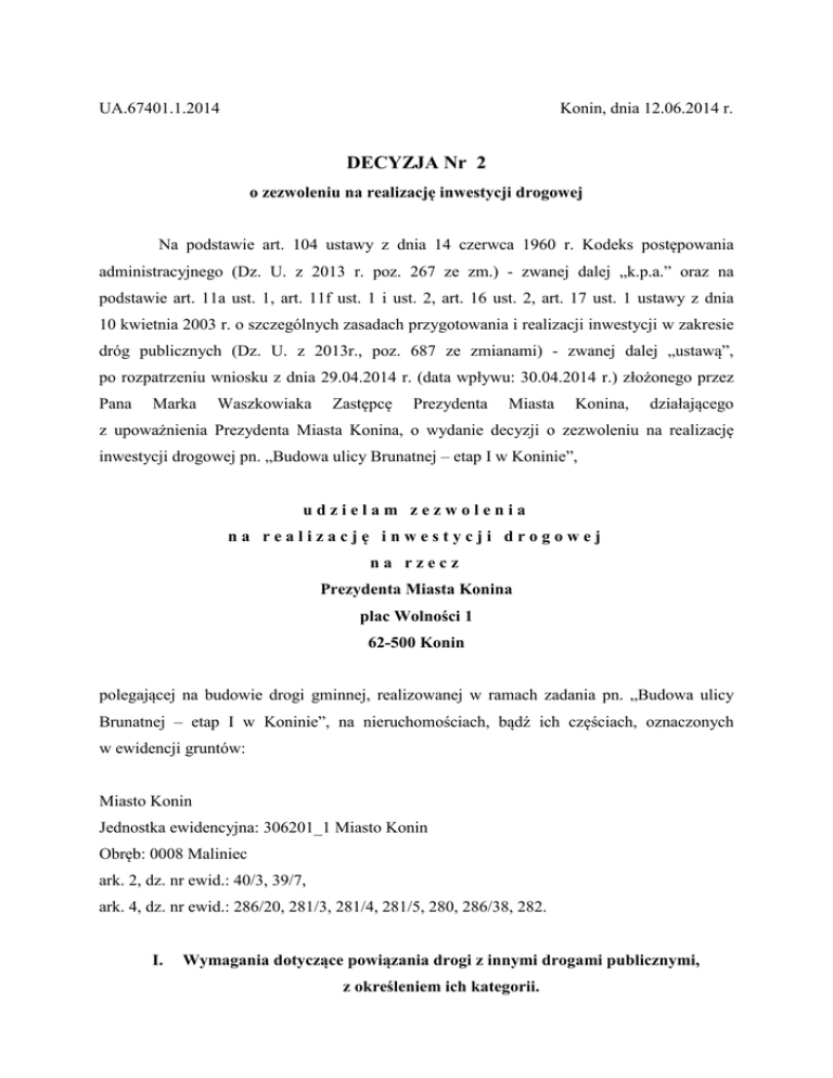UA.67401.1.2014 Konin, dnia 12.06.2014 r. DECYZJA Nr 2 o zezwoleniu na realizację inwestycji drogowej Na podstawie art. 104 ustawy z dnia 14 czerwca 1960 r. Kodeks postępowania administracyjnego (Dz. U. z 2013 r. poz. 267 ze zm.) - zwanej dalej „k.p.a.” oraz na podstawie art. 11a ust. 1, art. 11f ust. 1 i ust. 2, art. 16 ust. 2, art. 17 ust. 1 ustawy z dnia 10 kwietnia 2003 r. o szczególnych zasadach przygotowania i realizacji inwestycji w zakresie dróg publicznych (Dz. U. z 2013r., poz. 687 ze zmianami) - zwanej dalej „ustawą”, po rozpatrzeniu wniosku z dnia 29.04.2014 r. (data wpływu: 30.04.2014 r.) złożonego przez Pana Marka Waszkowiaka Zastępcę Prezydenta Miasta Konina, działającego z upoważnienia Prezydenta Miasta Konina, o wydanie decyzji o zezwoleniu na realizację inwestycji drogowej pn. „Budowa ulicy Brunatnej – etap I w Koninie”, udzielam zezwolenia na realizację inwestycji drogowej na rzecz Prezydenta Miasta Konina plac Wolności 1 62-500 Konin polegającej na budowie drogi gminnej, realizowanej w ramach zadania pn. „Budowa ulicy Brunatnej – etap I w Koninie”, na nieruchomościach, bądź ich częściach, oznaczonych w ewidencji gruntów: Miasto Konin Jednostka ewidencyjna: 306201_1 Miasto Konin Obręb: 0008 Maliniec ark. 2, dz. nr ewid.: 40/3, 39/7, ark. 4, dz. nr ewid.: 286/20, 281/3, 281/4, 281/5, 280, 286/38, 282. I. Wymagania dotyczące powiązania drogi z innymi drogami publicznymi, z określeniem ich kategorii. 1. Inwestycję należy realizować tak, aby zapewnić powiązanie wszystkich istniejących dróg publicznych położonych na terenie objętym inwestycją, z zapewnieniem dostępu nieruchomości do dróg publicznych. 2. Należy utrzymać istniejące powiązanie drogi gminnej (ul. Brunatna) z drogą krajową nr 25 (ul. Przemysłowa). II. Określenie linii rozgraniczających teren. 1. Ustalam linie rozgraniczające teren inwestycji (linia przerywana koloru czerwonego) na mapie zasadniczej w skali 1:500 (mapa przyjęta przez Prezydenta Miasta Konina do zasobu miejskiego w dniu 21 czerwca 2013r. i zaewidencjonowana pod nr 458/2013), stanowiącej załącznik nr 1 do niniejszej decyzji. 2. Ustalam, że liniami rozgraniczającymi teren inwestycji objęte są następujące nieruchomości: 2.1. działka o nr ewid. 286/20 ark. 4 obr. 0008 Maliniec nie podlegająca podziałowi stanowiąca już własność Miasta Konin, 2.2. nieruchomości powstałe w wyniku podziału oznaczone tłustym drukiem w Tabeli 1 w pkt V niniejszej decyzji. III. Warunki wynikające z potrzeb ochrony środowiska, ochrony zabytków i dóbr kultury współczesnej oraz potrzeb obronności państwa 1. Warunki wynikające z potrzeb ochrony środowiska: 1.1. Ustalam, że w trakcie prac budowlanych inwestor jest zobowiązany uwzględnić ochronę środowiska na obszarze prowadzenia prac, a w szczególności ochronę gleby, zieleni, naturalnego ukształtowania terenu i stosunków wodnych poprzez wykorzystanie i przekształcenie wymienionych elementów przyrodniczych wyłącznie w takim zakresie, w jakim jest to objęte zatwierdzonym projektem budowlanym, wymogami uzgodnień i decyzji organów oraz instytucji opiniujących i uzgadniających projekt budowlany. 1.2. Gospodarkę odpadami należy prowadzić zgodnie z ustawą z dnia 14 grudnia 2012 r. o odpadach (Dz. U. z 2013r., poz.21 ze zm.) 2. Warunki wynikające z potrzeb ochrony zabytków i dóbr kultury współczesnej - nie ustalam. 3. Warunki wynikające z potrzeb obronności państwa - nie ustalam. 2 IV. 1. Wymagania dotyczące ochrony uzasadnionych interesów osób trzecich. Ostateczna decyzja o zezwoleniu na realizację inwestycji drogowej, stanowi podstawę do dokonania wpisów w księdze wieczystej i w katastrze nieruchomości. 2. Nieruchomości lub ich części, o których mowa w punkcie VI decyzji stają się z mocy prawa własnością Miasta Konin z dniem, w którym niniejsza decyzja stała się ostateczna. 3. Decyzje ustalające wysokość odszkodowania za nieruchomości przejęte z mocy prawa niniejszą decyzją, wydaje Prezydent Miasta Konina, w terminie 30 dni od dnia, w którym niniejsza decyzja stała się ostateczna. 4. Wysokość odszkodowania ustala się według stanu nieruchomości w dniu wydania niniejszej decyzji oraz według jej wartości z dnia, w którym następuje ustalenie wysokości odszkodowania. 5. Jeżeli na nieruchomości lub prawie użytkowania wieczystego tej nieruchomości zostały ustanowione ograniczone prawa rzeczowe z dniem, w którym niniejsza decyzja stała się ostateczna, prawa te wygasają. 6. Jeżeli przeznaczona na pasy drogowe nieruchomość gruntowa stanowiąca własność Skarbu Państwa albo jednostki samorządu terytorialnego została oddana w użytkowanie wieczyste, użytkowanie to wygasa z dniem, w którym niniejsza decyzja stała się ostateczna. Przepis stosuje się odpowiednio do użytkowania wieczystego nabytego w sposób inny niż w drodze umowy zawartej w formie aktu notarialnego. 7. Odszkodowanie, za nieruchomości przejęte z mocy prawa niniejszą decyzją, przysługuje dotychczasowym właścicielom nieruchomości, użytkownikom wieczystym nieruchomości oraz osobom, którym przysługuje do nieruchomości ograniczone prawo rzeczowe. 8. Do ustalenia wysokości i wypłacenia odszkodowania, za nieruchomości przejęte z mocy prawa niniejszą decyzją, stosuje się odpowiednio przepisy o gospodarce nieruchomościami, z zastrzeżeniem art. 18 ustawy. 9. Nieruchomości, które z mocy prawa staną się własnością Miasta Konin, mogą być użytkowane nieodpłatnie przez dotychczasowych właścicieli lub użytkowników wieczystych do upływu terminu, o którym mowa w pkt. IX.1 niniejszej decyzji. 10. Jeżeli przejęta z mocy prawa na rzecz Miasta Konin jest część nieruchomości, a pozostała część nie nadaje się do prawidłowego wykorzystania na dotychczasowe cele, Prezydent Miasta Konina jest zobowiązany do nabycia, na wniosek właściciela 3 lub użytkownika wie