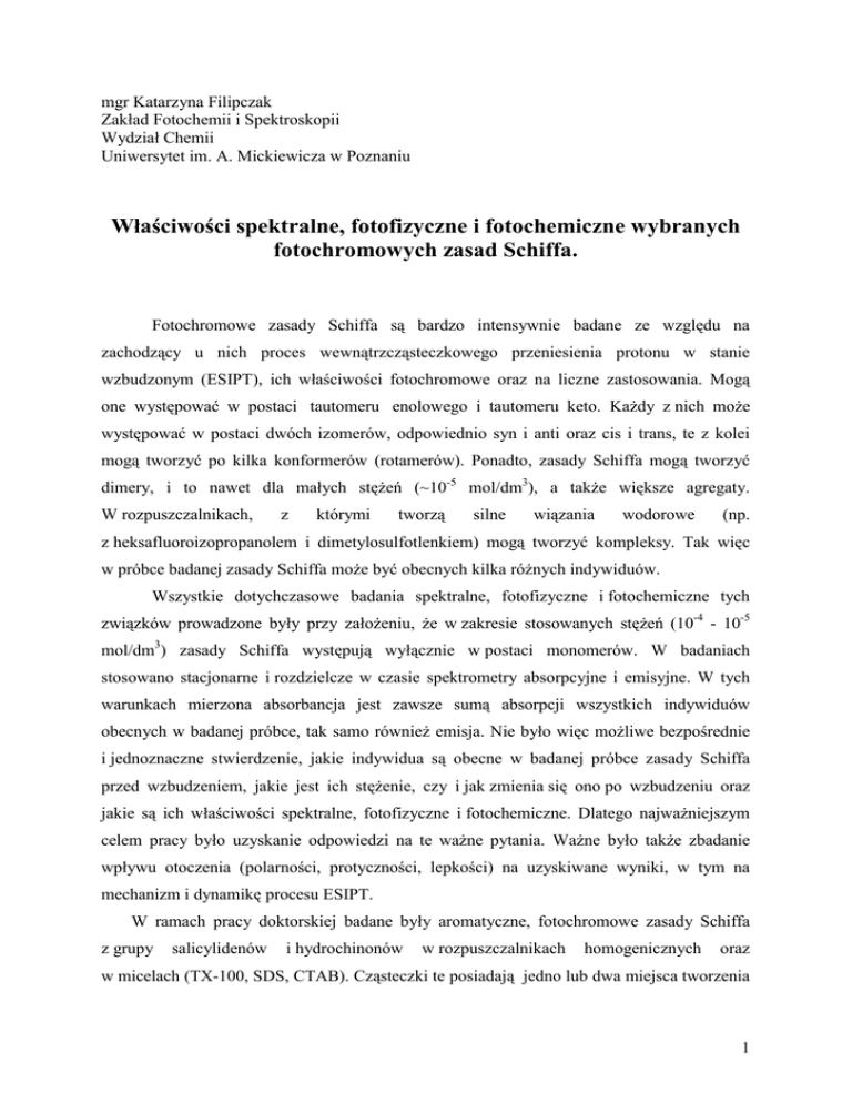 mgr Katarzyna Filipczak Zakład Fotochemii i Spektroskopii Wydział Chemii Uniwersytet im. A. Mickiewicza w Poznaniu Właściwości spektralne, fotofizyczne i fotochemiczne wybranych fotochromowych zasad Schiffa. Fotochromowe zasady Schiffa są bardzo intensywnie badane ze względu na zachodzący u nich proces wewnątrzcząsteczkowego przeniesienia protonu w stanie wzbudzonym (ESIPT), ich właściwości fotochromowe oraz na liczne zastosowania. Mogą one występować w postaci tautomeru enolowego i tautomeru keto. Każdy z nich może występować w postaci dwóch izomerów, odpowiednio syn i anti oraz cis i trans, te z kolei mogą tworzyć po kilka konformerów (rotamerów). Ponadto, zasady Schiffa mogą tworzyć dimery, i to nawet dla małych stężeń (~10-5 mol/dm3), a także większe agregaty. W rozpuszczalnikach, z którymi tworzą silne wiązania wodorowe (np. z heksafluoroizopropanolem i dimetylosulfotlenkiem) mogą tworzyć kompleksy. Tak więc w próbce badanej zasady Schiffa może być obecnych kilka różnych indywiduów. Wszystkie dotychczasowe badania spektralne, fotofizyczne i fotochemiczne tych związków prowadzone były przy założeniu, że w zakresie stosowanych stężeń (10-4 - 10-5 mol/dm3) zasady Schiffa występują wyłącznie w postaci monomerów. W badaniach stosowano stacjonarne i rozdzielcze w czasie spektrometry absorpcyjne i emisyjne. W tych warunkach mierzona absorbancja jest zawsze sumą absorpcji wszystkich indywiduów obecnych w badanej próbce, tak samo również emisja. Nie było więc możliwe bezpośrednie i jednoznaczne stwierdzenie, jakie indywidua są obecne w badanej próbce zasady Schiffa przed wzbudzeniem, jakie jest ich stężenie, czy i jak zmienia się ono po wzbudzeniu oraz jakie są ich właściwości spektralne, fotofizyczne i fotochemiczne. Dlatego najważniejszym celem pracy było uzyskanie odpowiedzi na te ważne pytania. Ważne było także zbadanie wpływu otoczenia (polarności, protyczności, lepkości) na uzyskiwane wyniki, w tym na mechanizm i dynamikę procesu ESIPT. W ramach pracy doktorskiej badane były aromatyczne, fotochromowe zasady Schiffa z grupy salicylidenów i hydrochinonów w rozpuszczalnikach homogenicznych oraz w micelach (TX-100, SDS, CTAB). Cząsteczki te posiadają jedno lub dwa miejsca tworzenia 1 równocennych wiązań wodorowych, co umożliwia, w stanie wzbudzonym, przeniesienie jednego lub dwóch protonów w procesie ESIPT. Realizacja postawionych celów była możliwa dzięki zastosowaniu szeregu dobrze uzupełniających się metod badawczych. Część badań została przeprowadzona przy użyciu absorpcyjnych i emisyjnych spektrometrów, zarówno stacjonarnych, jak i rozdzielczych w czasie. Jednak kluczowe dla realizacji badań było wszechstronne wykorzystanie układu UPLC-Abs-Em składającego się z aparatu UPLC® bezpośrednio sprzężonego ze spektrofotometrem fotodiodowym (zarazem detektorem absorpcyjnym) i bardzo czułym spektrofluorymetrem (zarazem detektorem emisyjnym). Zastosowanie wspomnianego układu gwarantowało najczęściej całkowite, a przynajmniej bardzo znaczne rozseparowanie pików chromatograficznych, a tym samym bezpośrednie stwierdzenie, ile indywiduów jest obecnych w badanej zasadzie Schiffa i jakie jest ich stężenie, nawet wtedy, gdy jest ono bardzo małe (10-7 mol/dm3). Opracowana metodyka badań i analizy wyników uzyskanych metodą UPLCAbs-Em zapewniła poprawne przypisanie indywiduów do obserwowanych pików chromatograficznych oraz wyeliminowanie wpływu zanieczyszczeń na uzyskiwane wyniki. Umożliwiła także podanie poprawnego diagramu Jabłońskiego, który zawiera istniejące indywidua, charakterystykę ich właściwości, w tym czasy życia, wydajności kwantowe fluorescencji i innych zachodzących procesów. Co istotne, zrozumienie złożonych właściwości zasad Schiffa jest konieczne z punktu widzenia badań zorientowanych aplikacyjnie i potencjalnych praktycznych zastosowań. Warto podkreślić, że znaczenie badań wykracza poza właściwości zasad Schiffa, a stosowany układ UPLC-Abs-Em oraz opracowana metodyka badań i analizy wyników będą szerzej stosowane, w szczególności do badania innych związków o podobnie złożonych właściwościach. 2