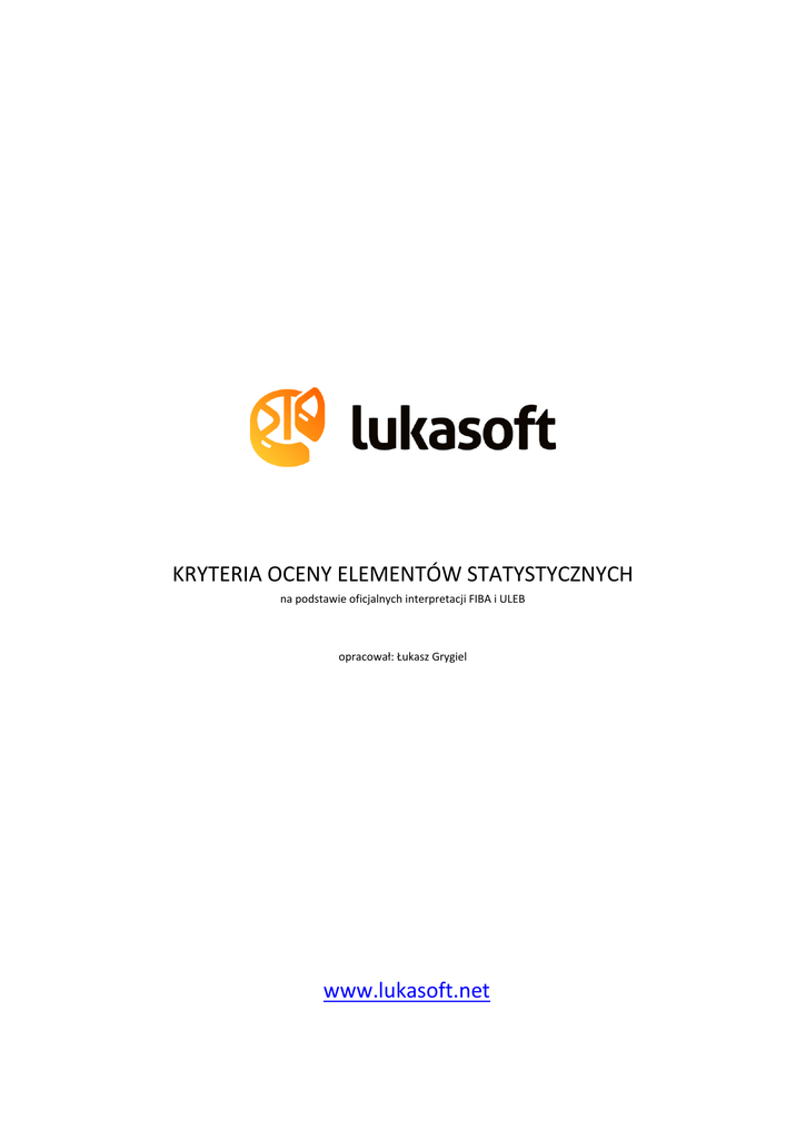 KRYTERIA OCENY ELEMENTÓW STATYSTYCZNYCH na podstawie oficjalnych interpretacji FIBA i ULEB opracował: Łukasz Grygiel www.lukasoft.net 2 RZUTY Z GRY Próba rzutu jest świadomą próbą zdobycia punktów przez gracza zespołu ataku polegającą na rzuceniu, pchnięciu lub uderzeniu piłki w kierunku kosza drużyny przeciwnej, z wyjątkiem tych sytuacji, gdy zawodnik podczas tego ruchu jest faulowany przez gracza obrony i piłka nie wpadła do kosza. Próba rzutu nie jest też zapisywana, jeżeli rzut został anulowany przez nielegalne dotknięcie piłki (offensive goal tending) przez gracza ataku. Próbą rzutu jest też włożenie piłki do kosza niezależnie czy zakończone zostało powodzeniem. Próba rzutu za trzy punkty jest próbą rzutu z gry wykonaną spoza linii 6,75 sygnalizowaną przez sędziego uniesieniem ręki z wyprostowanymi trzema palcami. Celny rzut jest to próba rzutu zakończona zdobyciem punktów, zarówno przez trafienie do kosza jak i przez nielegalne zagranie gracza obrony (goal tending). Celny rzut jest też zaliczany, gdy faulowany gracz trafi do kosza. UWAGA 1. Przy zaliczaniu prób rzutów oraz celnych rzutów należy zwracać uwagę na sygnalizację sędziów. Dotyczy to szczególnie sytuacji: => rzutu za trzy punkty - sygnalizowanego przez sędziego boiskowego; => dobitki piłki będącej na obręczy - sprawdzenie, komu punkty zapisał sekretarz; = faulu przed i po rzucie - czy faul został popełniony przed rzutem i próba rzutu została anulowana; czy rzut został popełniony po rzucie i próba rzutu została zaliczona; = punktów zdobytych przez gracza obrony - zapisywane są kapitanowi zespołu ataku (będącemu na parkiecie!) - skontrolować zapis z sekretarzem zawodów. 2. Próbę rzutu zalicza się graczowi, który w sposób świadomy kieruje piłkę w stronę kosza poprzez jej dotknięcie w powietrzu (tip in). W przypadku, gdy jest to dobitka poprzedniego rzutu zalicza się także zbiórkę w ataku. 3. W przypadku zablokowania piłki przez gracza obrony, próbę rzutu zalicza się, jeżeli statystyk ocenił, że gracz ataku wykonywał rzut do kosza. Jeżeli są, co do tego wątpliwości należy założyć, że próby rzutu nie było. Dotyczy to w szczególności blokowania podań z wyskoku. 4. Jako próby rzutu nie należy zapisywać sytuacji, gdy intencją gracza było dogranie piłki partnerowi, a nie zdobycie punktów. Dotyczy to w szczególności sytuacji, gdy gracz ataku podaje w ostatniej chwili z wyskoku do partnera oraz części zagrań „ally-oop". 5. W przypadku faulu przy rzucie nie zaliczamy graczowi rzutu niecelnego natomiast zaliczamy rzut celny jeżeli piłka wpadnie do kosza. To samo dotyczy sytuacji gdy rzut wykonywany jest z przypadkowej pozycji pod presją kończącego się czasu gry (nie dotyczy to upływającego czasu 24 sekund). 6. Przypadkowo zdobyty kosz przez graczy obrony zapisuje się kapitanowi zespołu przebywającemu na boisku - proponuję szybki kontakt ze stolikiem sędziowskim. RZUTY WOLNE Próba rzutu jest zaliczana w momencie, gdy zawodnik wykonuje rzut wolny i nie zostaje przy nim popełniony błąd powodujący powtórzenie rzutu. Celny rzut jest zaliczany, jeżeli po próbie rzutu piłka wpadła do kosza lub została nielegalnie dotknięta przez graczy obrony w sposób powodujący zaliczenie rzutu o wartości jednego punktu. 3 UWAGA 1. Próba rzutu wolnego, która z powodu błędu obrony została powtórzona jest ignorowana. Do statystyk zapisuje się wynik powtórzonego rzutu. 2. W przypadku, gdy przy rzucie wolnym piłkę w legalny sposób dotyka gracz obrony lub ataku powodując jej wpadnięcie do kosza i zaliczenie dwóch punktów -wykonującemu rzut zalicza się niecelny rzut wolny. 3. Jeżeli piłka po rzucie wolnym nie dotknie obręczy lub gracz wykonujący rzut popełni inny błąd powodujący, iż piłkę zza linii bocznej wprowadzać będą do gry rywale - wykonującemu rzut zapisywany jest niecelny rzut wolny. ZBIÓRKA Zbiórka jest zaliczana zawsze, gdy bezpośrednio po próbie rzutu zawodnik wchodzi w posiadanie żywej piłki. Zbiórka piłki jest związana z jej kontrolą przez gracza. Zbiórka może zostać zapisana zawodnikowi, który zbija piłkę do partnera, jeżeli robi to w sposób świadomy. Po próbie rzutu zawsze następuje zbiórka niezależnie czy piłka po rzucie dotknęła parkietu lub innych graczy (nie będąc w ich posiadaniu). Zbiórka piłki w ataku zaliczana jest w momencie, gdy dokonuje jej gracz zespołu atakującego. Zbiórka piłki w obronie zaliczana jest w momencie wejścia w posiadanie piłki po rzucie gracza obrony. UWAGA 1. Zbiórką w ataku jest dotknięcie piłki przez gracza ataku powodujące jej skierowanie w stronę kosza (tip in). 2. Zbiórka jest zaliczana graczowi, który po rzucie złapał piłkę razem z rywalem i wywalczył jej posiadanie dla zespołu w ramach procedury naprzemiennego posiadania piłki. 3. Zbiórka może być przyznana w sytuacji, gdy piłki nie dotknęła obręczy ani tablicy o ile wcześniej przyznano próbę rzutu. 4. W przypadku, gdy podczas walki o piłkę została ona zbita „na oślep" zbiórkę zalicza się zawodnikowi, który wszedł w jej posiadanie. 5. Jeżeli rzut został zablokowany przez gracza obrony, zbiórka jest przyznawana zawodnikowi, który pierwszy wszedł w posiadanie piłki bezpośrednio po bloku jeżeli wcześniej zaliczono próbę rzutu zawodnikowi zablokowanemu. 6. Zbicie piłki z obręczy przez obrońcę o ile było to zagranie świadome i zakończyło się wejściem w posiadanie piłki zespołu obrony należy zapisać obrońcy jako zbiórkę. 7. Zbiórka jest zaliczana wyłącznie w sytuacjach gdy gracz wejdzie w posiadanie piłki. Nie są zbiórką sytuacje, gdy gracz świadomie doprowadza (np. poprzez zastawienie) do opuszczenia przez piłkę parkietu. ASYSTA Asysta jest to podanie piłki do partnera stwarzające mu możliwość bezpośredniego zdobycia punktów. Z jedną akcją „punktową" może być zwią