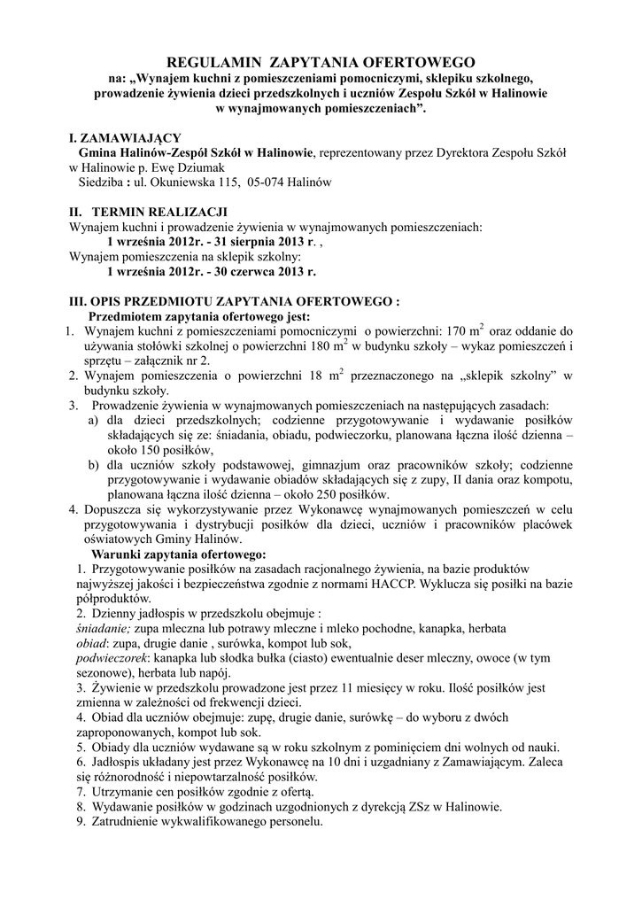 REGULAMIN ZAPYTANIA OFERTOWEGO na: „Wynajem kuchni z pomieszczeniami pomocniczymi, sklepiku szkolnego, prowadzenie żywienia dzieci przedszkolnych i uczniów Zespołu Szkół w Halinowie w wynajmowanych pomieszczeniach”. I. ZAMAWIAJĄCY Gmina Halinów-Zespół Szkół w Halinowie, reprezentowany przez Dyrektora Zespołu Szkół w Halinowie p. Ewę Dziumak Siedziba : ul. Okuniewska 115, 05-074 Halinów II. TERMIN REALIZACJI Wynajem kuchni i prowadzenie żywienia w wynajmowanych pomieszczeniach: 1 września 2012r. - 31 sierpnia 2013 r. , Wynajem pomieszczenia na sklepik szkolny: 1 września 2012r. - 30 czerwca 2013 r. III. OPIS PRZEDMIOTU ZAPYTANIA OFERTOWEGO : Przedmiotem zapytania ofertowego jest: 1. Wynajem kuchni z pomieszczeniami pomocniczymi o powierzchni: 170 m2 oraz oddanie do używania stołówki szkolnej o powierzchni 180 m2 w budynku szkoły – wykaz pomieszczeń i sprzętu – załącznik nr 2. 2. Wynajem pomieszczenia o powierzchni 18 m2 przeznaczonego na „sklepik szkolny” w budynku szkoły. 3. Prowadzenie żywienia w wynajmowanych pomieszczeniach na następujących zasadach: a) dla dzieci przedszkolnych; codzienne przygotowywanie i wydawanie posiłków składających się ze: śniadania, obiadu, podwieczorku, planowana łączna ilość dzienna – około 150 posiłków, b) dla uczniów szkoły podstawowej, gimnazjum oraz pracowników szkoły; codzienne przygotowywanie i wydawanie obiadów składających się z zupy, II dania oraz kompotu, planowana łączna ilość dzienna – około 250 posiłków. 4. Dopuszcza się wykorzystywanie przez Wykonawcę wynajmowanych pomieszczeń w celu przygotowywania i dystrybucji posiłków dla dzieci, uczniów i pracowników placówek oświatowych Gminy Halinów. Warunki zapytania ofertowego: 1. Przygotowywanie posiłków na zasadach racjonalnego żywienia, na bazie produktów najwyższej jakości i bezpieczeństwa zgodnie z normami HACCP. Wyklucza się posiłki na bazie półproduktów. 2. Dzienny jadłospis w przedszkolu obejmuje : śniadanie; zupa mleczna lub potrawy mleczne i mleko pochodne, kanapka, herbata obiad: zupa, drugie danie , surówka, kompot lub sok, podwieczorek: kanapka lub słodka bułka (ciasto) ewentualnie deser mleczny, owoce (w tym sezonowe), herbata lub napój. 3. Żywienie w przedszkolu prowadzone jest przez 11 miesięcy w roku. Ilość posiłków jest zmienna w zależności od frekwencji dzieci. 4. Obiad dla uczniów obejmuje: zupę, drugie danie, surówkę – do wyboru z dwóch zaproponowanych, kompot lub sok. 5. Obiady dla uczniów wydawane są w roku szkolnym z pominięciem dni wolnych od nauki. 6. Jadłospis układany jest przez Wykonawcę na 10 dni i uzgadniany z Zamawiającym. Zaleca się różnorodność i niepowtarzalność posiłków. 7. Utrzymanie cen posiłków zgodnie z ofertą. 8. Wydawanie posiłków w godzinach uzgodnionych z dyrekcją ZSz w Halinowie. 9. Zatrudnienie wykwalifikowanego personelu. 10. Obsługa gastronomiczna uroczystości szkolnych, gminnych i imprez sportowych na podstawie oddzielnych umów. Obowiązki Oferenta 1. Opłata czynszu miesięcznego do 10-go dnia każdego miesiąca. 2. Pokrywanie, poza czynszem kosztów opłat eksploatacyjnych takich jak: energia elektryczna, woda i ścieki, gaz (z podlicznika), centralne ogrzewanie (według kalkulacji kosztów) związanych z prowadzeniem działalności gastronomicznej. 3. Zawarcie umowy na wywóz śmieci i ponoszenie kosztów z tego tytułu. 4. Doposażenie na własny koszt wynajętych pomieszczeń w urządzenia niezbędne do prowadzenia działalności gospodarczej na okres trwania umowy. 5. Zabezpieczenie zastawy dla uczniów. 6. Udostępnianie kuchni i stołówki na uroczystości szkolne lub gminne. 7. Utrzymanie przedmiotu najmu w dobrym stanie sanitarno-porządkowym. 8. Wykonywanie drobnych napraw instalacji wodociągowej oraz elektrycznej, a w czasie wakacji niezbędnych konserwacji, napraw, remontów wynajmowanych pomieszczeń w uzgodnieniu z dyrektorem szkoły. 9. Pomieszczenie wynajmowane na sklepik szkolny wykorzystywane będzie wyłącznie do sprzedaży artykułów szkolnych oraz spożywczych od poniedziałku do piątku. 10. Wynajęte pomieszczenia nie mogą być podnajmowane innym podmiotom. 11. Przed zawarciem umowy nastąpi komisyjne przekazanie wynajmowanych pomieszczeń Oferentowi, a po jej zakończeniu komisyjny odbiór od Oferenta. Wizji lokalnej Oferent powinien dokonać indywidualnie. IV WARUNKI UCZESTNICTWA W ZAPYTANIU OFERTOWYM: Określenie warunków uczestnictwa w postępowaniu 1. Warunkiem uczestnictwa w zapytaniu ofertowym jest złożenie oferty wraz z wymaganymi dokumentami i oświadczeniami, wzór oferty stanowi załącznik nr 1 do niniejszego regulaminu.. 2. Oferta powinna być złożona w zamkniętej kopercie. Na kopercie należy umieścić napis: OFERTA na: „Wynajem kuchni z pomieszczeniami pomocniczymi, sklepiku szkolnego, prowadzenie żywienia dzieci przedszkolnych i uczniów Zespołu Szkół w Halinowie w wynajmowanych pomieszczeniach”. 3. Oferent ma prawo do zmiany swojej oferty przed upływem końcowego terminu składania ofert, jedynie w przypadku wycofania poprzednio złożonej oferty. Oferta 1. Oferta powinna zawierać: 1) imię i nazwisko oferenta będącego osobą fizyczną, lub nazwę firmy wraz z siedzibą, 2) adres do korespondencji, 3) telefon kontaktowy, 4) datę sporządzenia oferty, 5) oświadczenie oferenta o zapoznaniu się ze stanem technicznym lokalu, wzorami umów, Regulaminem zapytania ofertowego i przyjęciem go bez zastrzeżeń, 6) cenę dziennego wyżywienia w przedszkolu w zależności od liczby posiłków (przy czym cena posiłków obejmować musi wszystkie koszty związane z jego przygotowaniem): - śniadanie, obiad, podwieczorek - 10,00 zł brutto - śniadanie i obiad – 8 zł 7) cenę pełnego obiadu (zupa i drugie danie) w szkole podstawowej i gimnazjum, przy czym cena obiadu obejmować musi wszystkie koszty związane z jego przygotowaniem: - jednorazowego - 8,00 zł
