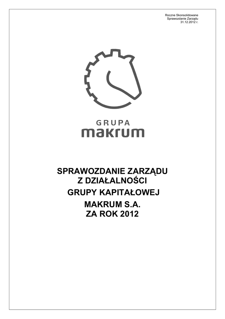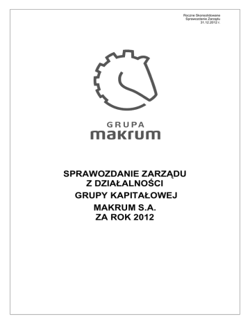 Roczne Skonsolidowane Sprawozdanie Zarządu 31.12.2012 r. SPRAWOZDANIE ZARZĄDU Z DZIAŁALNOŚCI GRUPY KAPITAŁOWEJ MAKRUM S.A. ZA ROK 2012 Roczne Skonsolidowane Sprawozdanie Zarządu 31.12.2012 r. 1. Omówienie podstawowych wielkości ekonomiczno-finansowych za 2012 rok. .................................. 4 1.1 Opis organizacji Grupy Kapitałowej MAKRUM S.A. .......................................................................................................... 4 1.2 Charakterystyka sprzedaży i źródeł zaopatrzenia........................................................................................................... 11 1.2.1 Ogólna charakterystyka sprzedaży ........................................................................................................................ 12 1.2.2 Sprzedaż krajowa .................................................................................................................................................. 15 1.2.3 Sprzedaż eksportowa ............................................................................................................................................ 16 1.2.4 Źródła zaopatrzenia ............................................................................................................................................... 16 1.3 Wyniki finansowe ........................................................................................................................................................... 17 1.3.1 Rachunek wyników ................................................................................................................................................ 17 1.3.2 Bilans..................................................................................................................................................................... 19 1.3.3. Przepływy pieniężne ............................................................................................................................................. 23 1.3.4 Analiza wskaźnikowa ............................................................................................................................................. 23 2. Opis istotnych czynników ryzyka i zagrożeń. ................................................................................ 24 3. Oświadczenie o stosowaniu ładu korporacyjnego. ........................................................................ 26 3.1 3.2 3.3 3.4 3.5 3.6 3.7 3.8 3.9 Deklaracja ładu korporacyjnego ................................................................................................................................. 26 Akcjonariat Spółki ...................................................................................................................................................... 29 Opis sposobu działania Walnego Zgromadzenia i jego zasadniczych uprawnień oraz praw akcjonariuszy i sposobu ich wykonywania ............................................................................................................................................................. 30 Skład osobowy wraz ze zmianami oraz zasady działania organów zarządzających i nadzorczych Spółki .................. 31 Zasady zmiany Statutu .............................................................................................................................................. 33 Opis podstawowych cech stosowanych w Spółce systemów kontroli wewnętrznej i zarządzania ryzykiem w odniesieniu do procesu sporządzania sprawozdań finansowych. ............................................................................... 33 Wskazanie posiadaczy wszelkich papierów wartościowych, które dają specjalne uprawnienia kontrolne ................... 34 Wskazanie wszelkich ograniczeń odnośnie wykonywania prawa głosu...................................................................... 34 Wskazanie wszelkich ograniczeń dotyczących przenoszenia prawa własności papierów wartościowych Spółki ........ 34 4. Postępowania toczące się przed sądem, organem właściwym dla postępowania arbitrażowego lub organem administracji publicznej. ............................................................................................ 34 5. Informacje o zawartych umowach znaczących dla działalności Spółki. ........................................ 34 5.1 5.2 6. Umowy znaczące zawarte przez Spółkę w 2012 roku. ............................................................................................... 34 Umowy znaczące zawarte przez Spółkę po dniu bilansowym. ................................................................................... 46 Informacja o powiązaniach organizacyjnych lub kapitałowych Spółki z innymi podmiotami oraz określenie jej głównych inwestycji krajowych i zagranicznych, w tym inwestycji kapitałowych dokonanych poza jej grupą jednostek powiązanych oraz metod ich finansowania. ..................... 48 6.1 6.2 Podmioty organizacyjnie lub kapitałowo powiązane ze Spółką................................................................................... 48 Określenie głównych inwestycji krajowych i zagranicznych Spółki, w tym inwestycji kapitałowych dokonanych poza jej grupą jednostek powiązanych oraz metod ich finansowania ...................................................................................... 49 7. Opis istotnych transakcji z podmiotami powiązanymi na warunkach innych niż rynkowe. ........... 50 8. Informacje o zaciągniętych i wypowiedzianych w danym roku obrotowym umowach dotyczących kredytów i pożyczek. ...................................................................................................................... 50 9. Informacja o udzielonych pożyczkach. .......................................................................................... 50 10. Informacja o udzielonych i otrzymanych w danym roku obrotowym poręczeń i gw