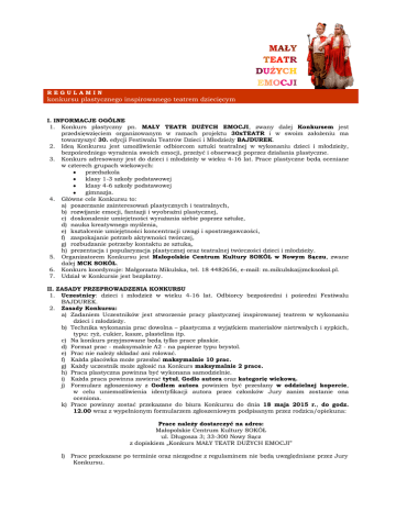 MAŁY TEATR DUŻYCH EMOCJI REGULAMIN konkursu plastycznego inspirowanego teatrem dziecięcym I. INFORMACJE OGÓLNE 1. Konkurs plastyczny pn. MAŁY TEATR DUŻYCH EMOCJI, zwany dalej Konkursem jest przedsięwzięciem organizowanym w ramach projektu 30xTEATR i w swoim założeniu ma towarzyszyć 30. edycji Festiwalu Teatrów Dzieci i Młodzieży BAJDUREK. 2. Ideą Konkursu jest umożliwienie odbiorcom sztuki teatralnej w wykonaniu dzieci i młodzieży, bezpośredniego wyrażenia swoich emocji, przeżyć i obserwacji poprzez działania plastyczne. 3. Konkurs adresowany jest do dzieci i młodzieży w wieku 4-16 lat. Prace plastyczne będą oceniane w czterech grupach wiekowych: przedszkola klasy 1-3 szkoły podstawowej klasy 4-6 szkoły podstawowej gimnazja. 4. Główne cele Konkursu to: a) poszerzanie zainteresowań plastycznych i teatralnych, b) rozwijanie emocji, fantazji i wyobraźni plastycznej, c) doskonalenie umiejętności wyrażania siebie poprzez sztukę, d) nauka kreatywnego myślenia, e) kształcenie umiejętności koncentracji uwagi i spostrzegawczości, f) zaspokajanie potrzeb aktywności twórczej, g) rozbudzanie potrzeby kontaktu ze sztuką, h) prezentacja i popularyzacja plastycznej oraz teatralnej twórczości dzieci i młodzieży. 5. Organizatorem Konkursu jest Małopolskie Centrum Kultury SOKÓŁ w Nowym Sączu, zwane dalej MCK SOKÓŁ. 6. Konkurs koordynuje: Małgorzata Mikulska, tel. 18 4482656, e-mail: [email protected]. 7. Udział w Konkursie jest bezpłatny. II. ZASADY PRZEPROWADZENIA KONKURSU 1. Uczestnicy: dzieci i młodzież w wieku 4-16 lat. Odbiorcy bezpośredni i pośredni Festiwalu BAJDUREK. 2. Zasady Konkursu: a) Zadaniem Uczestników jest stworzenie pracy plastycznej inspirowanej teatrem w wykonaniu dzieci i młodzieży. b) Technika wykonania prac dowolna – plastyczna z wyjątkiem materiałów nietrwałych i sypkich, typu: ryż, cukier, kasze, plastelina itp. c) Na konkurs przyjmowane będą tylko prace płaskie. d) Format prac - maksymalnie A2 - na papierze typu brystol. e) Prac nie należy składać ani rolować. f) Każda placówka może przesłać maksymalnie 10 prac. g) Każdy uczestnik może zgłosić na Konkurs maksymalnie 2 prace. h) Praca plastyczna powinna być wykonana samodzielnie. i) Każda praca powinna zawierać tytuł, Godło autora oraz kategorię wiekową. j) Formularz zgłoszeniowy z Godłem autora powinien być przesłany w oddzielnej kopercie, w celu uniemożliwienia identyfikacji autora przez członków Jury zanim zostanie ona oceniona. k) Prace powinny zostać przekazane do biura Konkursu do dnia 18 maja 2015 r., do godz. 12.00 wraz z wypełnionym formularzem zgłoszeniowym podpisanym przez rodzica/opiekuna: Prace należy dostarczyć na adres: Małopolskie Centrum Kultury SOKÓŁ ul. Długosza 3; 33-300 Nowy Sącz z dopiskiem „Konkurs MAŁY TEATR DUŻYCH EMOCJI” l) Prace przekazane po terminie oraz niezgodne z regulaminem nie będą uwzględniane przez Jury Konkursu. 3. 4. 5. Wyniki Konkursu zostaną ogłoszone przez Organizatora w dniu 9 czerwca 2015 r. w czasie finału 30. edycji Festiwalu Teatrów Dzieci i Młodzieży BAJDUREK, organizowanego w Nowym Sączu w Małopolskim Centrum Kultury SOKÓŁ, ul. Długosza 3 w dniach 9-11 czerwca 2015 r. Nagrodzone prace zostaną zaprezentowane w formie wystawy zorganizowanej w MCK SOKÓŁ. Laureaci Konkursu otrzymają dyplom oraz nagrodę rzeczową. III. JURY KONKURSU 1. Jury Konkursu powołane zostanie przez Organizatora i składać się będzie z min. 3 osób. 2. Jury spośród nadesłanych prac wybierze te, które zostaną nagrodzone I, II i III nagrodą konkursową oraz ewentualnymi wyróżnieniami. 3. Werdykt Jury w formie protokołu zostanie umieszczony na stronie MCK SOKÓŁ. 4. Werdykt Jury jest ostateczny. IV. KRYTERIA OCENY Prace będą oceniane pod względem oryginalności w ujęciu tematu oraz zgodności z tematyką Konkursu, kompozycji, zastosowanej techniki plastycznej, estetyki wykonania pracy. V. POSTANOWIENIA KOŃCOWE 1. Organizator nie zwraca przesłanych prac. 2. Organizator zastrzega, że uczestnicy Konkursu nieodpłatnie przenoszą na Organizatora pełne prawa autorskie i majątkowe do materiałów konkursowych, co upoważnia do ich wykorzystania na następujących polach eksploatacji bez wypłacania honorariów autorskich: a) wprowadzanie do pamięci komputera i do sieci multimedialnej, w tym do baz danych i platform komunikacyjnych, b) rozpowszechnianie, c) tworzenie kompilacji, d) publikowanie i reprodukowanie prac konkursowych, e) zamieszczanie w Internecie na stronach Małopolskiego Centrum Kultury SOKÓŁ, f) publiczne wystawianie, eksponowanie, w tym podczas seminariów, wykładów, warsztatów, konferencji. 3. Wszyscy Uczestnicy zakwalifikowani do Konkursu otrzymają poświadczenia swojego uczestnictwa w formie dyplomów. 4. Wysłanie zgłoszenia uczestnictwa w Konkursie jest równoznaczne z akceptacją niniejszego Regulaminu oraz z udzieleniem przez Uczestników/Opiekunów zgody na opublikowanie imienia i nazwiska, miejscowości zamieszkania oraz informacji o otrzymanej nagrodzie na stronie internetowej Organizatora na potrzeby związane z podaniem wyników Konkursu. 5. Organizator zastrzega sobie prawo do zmian w terminach podanych w w/w Regulaminie. 6. Dane osobowe przekazane Organizatorowi będą przez niego przetwarzane w celu realizacji Konkursu i wyłonienia jego zwycięzców. 7. Uczestnicy Konkursu przenoszą nieodpłatnie na MCK SOKÓŁ w Nowym Sączu zezwolenia na rozpowszechnianie swojego wizerunku utrwalonego za pomocą wszelkich technik fotograficznych i nagraniowych w związku z udziałem w Konkursie. 8. Każdy uczestnik posiada prawo wglądu do swoich danych osobowych, do ich poprawienia lub usunięcia. Dane osobowe przetwarzane będą zgodnie z przepisami ustawy z dnia 29 sierpnia 1997 r. o ochronie danych osobowych (i.j.; Dz. U. z 2002 r. nr 101, poz. 926 z późn. zm.). * w Regulaminie oraz w karcie zgłoszenia wykorzystano zdjęcie ze spektak