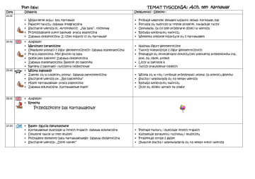 TEMAT TYGODNIA: Plan zajęć Data 23.01 24.01 25.01 26.01 Działania Wyjaśnienie pojęć: bal, karnawał Pajacyki tańczą- zabawa integracyjna Słuchanie wiersza K. Artyniewicz: „Na balu’’, rozmowa Przyozdabianie sukni balowej- praca plastyczna Zabawa dydaktyczna: Z czym kojarzy ci się karnawał? Angielski Warsztaty ceramiczne Układanie postaci z figur geometrycznych- zabawa matematyczna Praca plastyczna: Moi goście na balu Gdzie jest balonik? Zabawa dydaktyczna Zabawa matematyczna: Balonik do balonika Rakieta z balonami- ćwiczenia oddechowe Wizyta logopedy Zamień się w ulubioną postać- zabawa pantomimiczna Słuchanie wiersza pt. „Bal baloników’’ Maski karnawałowe- praca plastyczna Zabawa edukacyjna: Karnawałowe maski Ach, ten karnawał Umiejętności - Dziecko : Próbuje własnymi słowami wyjaśnić słowa: karnawał, bal Porusza się twórczo w rytmie piosenki, naśladuje ruchy Opowiada, za co były przebrane dzieci w wierszu Rozwija wyobraźnię twórczą Wymienia symbole kojarzące się z karnawałem Nazywa figury geometryczne Tworzy kompozycje z figur geometrycznych Posługuje się określeniami dotyczącymi położenia przedmiotów (na, pod, za, obok, przed) Liczy w zakresie 6 Ćwiczy prawidłowy oddech Wciela się w rolę i próbuje przedstawić postać za pomocą gestów Słucha i wypowiada się na temat wiersza Rozwija wyobraźnię twórczą Uczy się dzielić wyrazy na sylaby Poznaje kulturę i zwyczaje innych krajach Kształtuje sprawność ruchową i muzyczną Projektuje stroje z gazet Uważnie słucha i wypowiadania się na temat treści wiersza Angielski Rytmika Przedszkolny bal karnawałowy 27.01 Basen- zajęcia fakultatywne Karnawałowe zwyczaje w innych krajach- zabawa edukacyjna Dowolne tańce w rytm muzyki Poznajemy elementy balu karnawałowego- zabawa dydaktyczna Słuchanie wiersza: „Dziki taniec’’