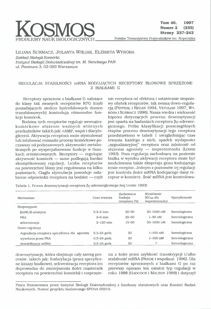 Tom 46, 1997 Numer 2 (235) Strony 237-242 Kosmos PROBLEMY NAUK BIOLOGICZNYCH____________ Polskie Towarzystwo Przyrodników im. Kopernika L il ia n a S u r m a c z , J o l a n t a W ie j a k , E l ż b ie t a W y r o b a Zakład Biologii Komórki, Instytut Biologii Doświadczalnej im. M. Nenckiego PAN ul. Pasteura 3, 02-093 Warszawa REGULACJA STABILNOŚCI mRNA KODUJĄCYCH RECEPTORY BŁONOWE SPRZĘŻONE Z BIAŁKAMI G Receptory sprzężone z białkami G należące do klasy tak zwanych receptorów R7G (czyli posiadających siedem hydrofobowych domen transbłonowych) kontrolują różnorodne fun kcje komórek. Rodzina tych receptorów reguluje wewnątrz komórkowe stężenie ważnych wtórnych przekaźników takich jak: cAMP, wapń i diacyloglicerol. Aktywacja receptora może stymulować lub inhibować rozmaite procesy komórkowe po cząwszy od podstawowych aktywności metabo licznych po wyspecjalizowane funkcje w tkan kach zróżnicowanych. Receptory — regulując aktywność komórek — same podlegają bardzo skomplikowanej regulacji. Liczba receptorów na powierzchni błony jest regulowana na kilku poziomach. Ciągła stymulacja powoduje osła bienie odpowiedzi receptora na bodziec — czyli nie receptora od efektora i ostatecznie stopnio wy ubytek receptorów, tak zwaną down-regulacją (P e p p e r l i R e g a n 1994, V e t u la n i 1997, W y r o b a i S u r m a c z 1996). Nasza wiedza i większość hipotez dotyczących procesu desensytyzacji jest oparta na badaniach receptora (32-adrenergicznego. Próbę klasyfikacji poszczególnych etapów procesu desensytyzacji tego receptora przedstawiono w tabeli 1 uwzględniając czas trwania każdego z nich, spadek wydajności „sygnalizacyjnej” receptora oraz zależność od stężenia agonisty — izoproterenolu (L o h s e 1993). Poza regulacją zachodzącą na poziomie białka w wyniku aktywacji receptora może być modulowana także ekspresja genu kodującego tenże receptor. Jednym z poziomów tej regulacji jest kontrola ilości mRNA kodującego dany re ceptor w komórce. Ilość mRNA jest kontrolowa- Tabela 1. Proces desensytyzacji receptora p2 -adrenergicznego (wg L o h s e 1993) Mechanizm Czas trwania Zachowana funkcja receptora (%) Wrażliwość (EC 50 dla izoproterenolu) Specyficzność Rozprzęganie 0,2-2 min 20-50 30-1000 nM homologiczna PKA 2-6 min 20-50 1-30 nM heterologiczna sekwestracja 2-120 min 10-60 30-1000 nM homologiczna PARK/p-arestyna Down-regulacja degradacja receptora specyficzna dla agonisty 0,5-24 godz. 20 1-100 nM homologiczna wywołana przez PKA 0,5-24 godz. 20 1-100 nM heterologiczna destabilizacja mRNA 0,5-24 godz. 50 ? heterologiczna desensytyzację, która obejmuje cały szereg pro cesów, takich jak: fosforylacja (przez specyficz ne kinazy białkowe), sekwestracja receptora (co doprowadza do zmniejszenia ilości cząsteczek receptora na powierzchni komórki) i rozprzęże- na z kolei przez szybkość transkrypcji i/albo stabilność mRNA (P e n d e i współaut. 1996). Dla receptorów sprzężonych z białkami G po raz pierwszy opisano ten ostatni typ regulacji w roku 1988 (H a d c o c k i M a lb o n 1988) i dotyczył Praca finansowana przez Instytut Biologii Doświadczalnej z funduszy statutow ych oraz Kom itet Badań Naukowych. Num er projektu badawczego 6 P 0 4 A 05910. 238 L il ia n a S u r m a c z i w s p ó ł a u t o r z y on receptora beta-adrenergicznego — najczę ściej badanego modelu działania R7G. Okazało się, że po przedłużonej stymulacji spada ilość mRNA kodującego receptor, co prowadzi do zmniejszenia całkowitej liczby receptorów w ko mórce poprzez zmniejszenie syntezy białka re ceptorowego. Cały ten proces jest uzależniony od określonych sekwencji mRNA i różnych bia łek je wiążących, co zostanie omówione w po niższym artykule. STABILNOŚĆ m RNA KODUJĄCYCH RECEPTORY R7G Kontrola ekspresji genów kodujących recep tory błonowe sprzężone z białkami G poprzez regulację stabilności mRNA została opisana niedawno (tab. 2) i stanowi przedmiot intensyw nych badań. Wskazują one, że ten mechanizm potranskiypcyjnej regulacji dotyczy różnych re ceptorów błonowych, niezależnie od typu wtór nego przekaźnika informacji generowanego w procesie przekazywania sygnałów, a więc za równo receptora (te-adrenergicznego (H a d c o c k i współaut. 1989) stymulującego cyklazę adenylanową (P e p p e r l i R e g a n 1994), jak i receptora oc2 -adrenergicznego — hamującego ten enzym (S ak au e i H o ffm a n 1991), czy też receptora muskarynowego mi aktywującego fosfolipazę C (L e e i współaut. 1994). Tabela 2. m RNA kodujące receptory sprzężone z białkam i G podlegające potranskiypcyjnej regulacji (wg P e n d e i współaut. 1996). mRNA kodujące receptor Gatunek Data fh-adrenergiczny chomik 1989 P i -adrenergiczny szczur 1992 pi -adrenergiczny człowiek 1996 (X2 - adrenergiczny człowiek 1991 aib-adrenergiczny szczur 1994 m 1-muskarynowy szczur 1994 5-HT2A-serotoniowy szczur 1994 trombinowy człowiek 1995 ATl-angiotensyny II 1994 CZYNNIKI D ETERM INUJĄCE STABILNOŚĆ m RNA Głównym czynnikiem determinującym ilość mRNA w różnych organizmach od bakterii do ssaków jest szybkość rozpadu mRNA (okres półtrwania). Związek pomiędzy ilością mRNA, ich okresem półtrwania oraz ekspresją genów jest szczególnie istotny w przypadku „krótkożyjących” mRNA, ponieważ niewielkie zmiany w ich okresie półtrwania mogą wywołać 1000krotne (lub większe) zmiany w ich ilości w krót kim okresie czasu (Ross 1995). Przy stałym poziomie transkrypcji ilość mRNA może ulec bardzo znacznym wahaniom na skutek zmiany jego stabilności, co z kolei wpływa na to jak komórka rośnie, różnicuje się i reaguje na zmia ny środowiska (Ross 1996). U bakterii niemal połowa wszystkich zsyntetyzowanych cząstek mRNA jest degradowana przez nukleazy w ciągu kilku minut, a u Eukaryota okres półtrwania różnych mRNA wykazu je znaczną zmienność od kilku g