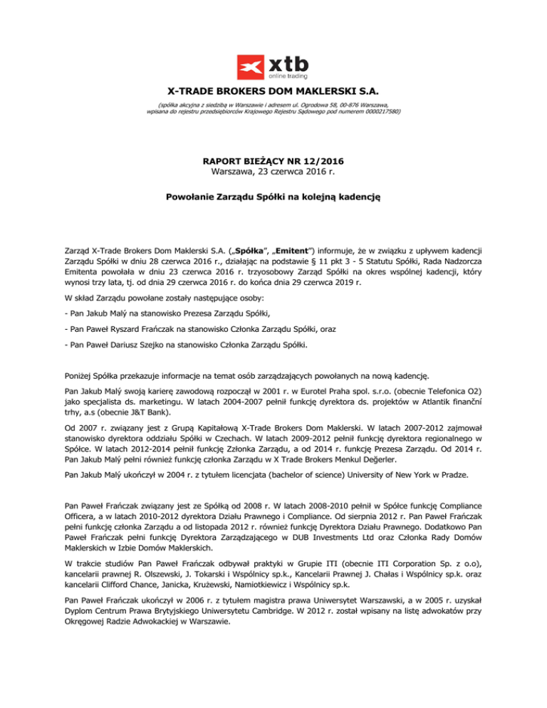 X-TRADE BROKERS DOM MAKLERSKI S.A. (spółka akcyjna z siedzibą w Warszawie i adresem ul. Ogrodowa 58, 00-876 Warszawa, wpisana do rejestru przedsiębiorców Krajowego Rejestru Sądowego pod numerem 0000217580) RAPORT BIEŻĄCY NR 12/2016 Warszawa, 23 czerwca 2016 r. Powołanie Zarządu Spółki na kolejną kadencję Zarząd X-Trade Brokers Dom Maklerski S.A. („Spółka”, „Emitent”) informuje, że w związku z upływem kadencji Zarządu Spółki w dniu 28 czerwca 2016 r., działając na podstawie § 11 pkt 3 - 5 Statutu Spółki, Rada Nadzorcza Emitenta powołała w dniu 23 czerwca 2016 r. trzyosobowy Zarząd Spółki na okres wspólnej kadencji, który wynosi trzy lata, tj. od dnia 29 czerwca 2016 r. do końca dnia 29 czerwca 2019 r. W skład Zarządu powołane zostały następujące osoby: - Pan Jakub Malý na stanowisko Prezesa Zarządu Spółki, - Pan Paweł Ryszard Frańczak na stanowisko Członka Zarządu Spółki, oraz - Pan Paweł Dariusz Szejko na stanowisko Członka Zarządu Spółki. Poniżej Spółka przekazuje informacje na temat osób zarządzających powołanych na nową kadencję. Pan Jakub Malý swoją karierę zawodową rozpoczął w 2001 r. w Eurotel Praha spol. s.r.o. (obecnie Telefonica O2) jako specjalista ds. marketingu. W latach 2004-2007 pełnił funkcję dyrektora ds. projektów w Atlantik finanční trhy, a.s (obecnie J&T Bank). Od 2007 r. związany jest z Grupą Kapitałową X-Trade Brokers Dom Maklerski. W latach 2007-2012 zajmował stanowisko dyrektora oddziału Spółki w Czechach. W latach 2009-2012 pełnił funkcję dyrektora regionalnego w Spółce. W latach 2012-2014 pełnił funkcję Zzłonka Zarządu, a od 2014 r. funkcję Prezesa Zarządu. Od 2014 r. Pan Jakub Malý pełni również funkcję członka Zarządu w X Trade Brokers Menkul Değerler. Pan Jakub Malý ukończył w 2004 r. z tytułem licencjata (bachelor of science) University of New York w Pradze. Pan Paweł Frańczak związany jest ze Spółką od 2008 r. W latach 2008-2010 pełnił w Spółce funkcję Compliance Officera, a w latach 2010-2012 dyrektora Działu Prawnego i Compliance. Od sierpnia 2012 r. Pan Paweł Frańczak pełni funkcję członka Zarządu a od listopada 2012 r. również funkcję Dyrektora Działu Prawnego. Dodatkowo Pan Paweł Frańczak pełni funkcję Dyrektora Zarządzającego w DUB Investments Ltd oraz Członka Rady Domów Maklerskich w Izbie Domów Maklerskich. W trakcie studiów Pan Paweł Frańczak odbywał praktyki w Grupie ITI (obecnie ITI Corporation Sp. z o.o), kancelarii prawnej R. Olszewski, J. Tokarski i Wspólnicy sp.k., Kancelarii Prawnej J. Chałas i Wspólnicy sp.k. oraz kancelarii Clifford Chance, Janicka, Krużewski, Namiotkiewicz i Wspólnicy sp.k. Pan Paweł Frańczak ukończył w 2006 r. z tytułem magistra prawa Uniwersytet Warszawski, a w 2005 r. uzyskał Dyplom Centrum Prawa Brytyjskiego Uniwersytetu Cambridge. W 2012 r. został wpisany na listę adwokatów przy Okręgowej Radzie Adwokackiej w Warszawie. Pan Paweł Szejko swoją karierę zawodową rozpoczął w 2003 r. w Departamencie Audytu BDO Polska sp. z o.o., w której był zatrudniony do 2006 r., m.in. na stanowisku Supervisora. W latach 2007-2008 Pan Paweł Szejko pracował na stanowisku Starszego Konsultanta w Departamencie Audytu PricewaterhouseCoopers sp. z o.o., a następnie od lipca 2008 r. do września 2014 r. pełnił funkcję Dyrektora Finansowego oraz członka Zarządu (od marca 2011 r.) w P.R.E.S.C.O. GROUP S.A. Od października 2014 r. Pan Paweł Szejko związany jest ze Spółką jako Dyrektor Finansowy, a od stycznia 2015 r. jako członek Zarządu. Pan Paweł Szejko pełni również funkcję członka Zarządu w X Trade Brokers Menkul Değerler. Od 2009 r. Pan Paweł Szejko prowadzi również jednoosobową działalność gospodarczą pod firmą Certa Audyt Paweł Szejko. Pan Paweł Szejko ukończył w 2003 r. z tytułem magistra Wyższą Szkołę Bankową w Poznaniu na specjalności – Finanse i Bankowość, oraz Akademię Ekonomiczną w Poznaniu na specjalności – Finanse i Rachunkowość Przedsiębiorstw. W 2007 r. Pan Paweł Szejko otrzymał dyplom ACCA z Międzynarodowej Sprawozdawczości Finansowej. W 2008 r. Pan Paweł Szejko został wpisany na listę biegłych rewidentów przy Krajowej Izbie Biegłych Rewidentów, a w 2009 r. uzyskał certyfikat księgowy Ministerstwa Finansów. Z zastrzeżeniem informacji zawartych powyżej, wszystkie ww. osoby powołane w skład Zarządu Spółki nowej kadencji nie prowadzą innej działalności konkurencyjnej poza przedsiębiorstwem Emitenta oraz nie uczestniczą w organach, ani nie są wspólnikami innych osób prawnych, czy spółek osobowych konkurencyjnych do Spółki oraz nie figurują w Rejestrze Dłużników Niewypłacalnych prowadzonym na podstawie ustawy o KRS. Podstawa prawna: Art. 5 ust. 1 pkt 22 rozporządzenia Ministra Finansów z dnia 19 lutego 2009 r. w sprawie informacji bieżących i okresowych przekazywanych przez emitentów papierów wartościowych oraz warunków uznawania za równoważne informacji wymaganych przepisami prawa państwa niebędącego państwem członkowskim.
