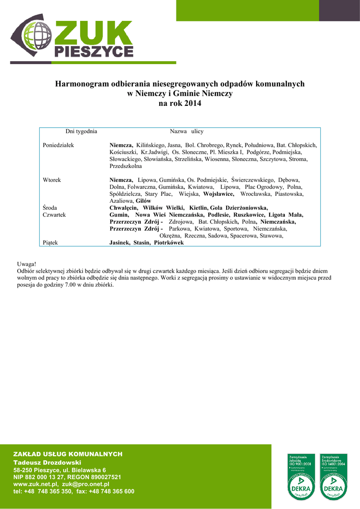 Harmonogram odbierania niesegregowanych odpadów komunalnych w Niemczy i Gminie Niemczy na rok 2014 Dni tygodnia Nazwa ulicy Poniedziałek Niemcza, Kilińskiego, Jasna, Bol. Chrobrego, Rynek, Południowa, Bat. Chłopskich, Kościuszki, Kr.Jadwigi, Os. Słoneczne, Pl. Mieszka I, Podgórze, Podmiejska, Słowackiego, Słowiańska, Strzelińska, Wiosenna, Słoneczna, Szczytowa, Stroma, Przedszkolna Wtorek Niemcza, Lipowa, Gumińska, Os. Podmiejskie, Świerczewskiego, Dębowa, Dolna, Folwarczna, Gumińska, Kwiatowa, Lipowa, Plac Ogrodowy, Polna, Spółdzielcza, Stary Plac, Wiejska, Wojsławice, Wrocławska, Piastowska, Azaliowa, Gilów Chwalęcin, Wilków Wielki, Kietlin, Gola Dzierżoniowska, Gumin, Nowa Wieś Niemczańska, Podlesie, Ruszkowice, Ligota Mała, Przerzeczyn Zdrój - Zdrojowa, Bat. Chłopskich, Polna, Niemczańska, Przerzeczyn Zdrój - Parkowa, Kwiatowa, Sportowa, Niemczańska, Okrężna, Rzeczna, Sadowa, Spacerowa, Stawowa, Jasinek, Stasin, Piotrkówek Środa Czwartek Piątek Uwaga! Odbiór selektywnej zbiórki będzie odbywał się w drugi czwartek każdego miesiąca. Jeśli dzień odbioru segregacji będzie dniem wolnym od pracy to zbiórka odbędzie się dnia następnego. Worki z segregacją prosimy o ustawianie w widocznym miejscu przed posesja do godziny 7.00 w dniu zbiórki. ZAKŁAD USŁUG KOMUNALNYCH Tadeusz Drozdowski 58-250 Pieszyce, ul. Bielawska 6 NIP 882 000 13 27, REGON 890027521 www.zuk.net.pl, [email protected] tel: +48 748 365 350, fax: +48 748 365 600