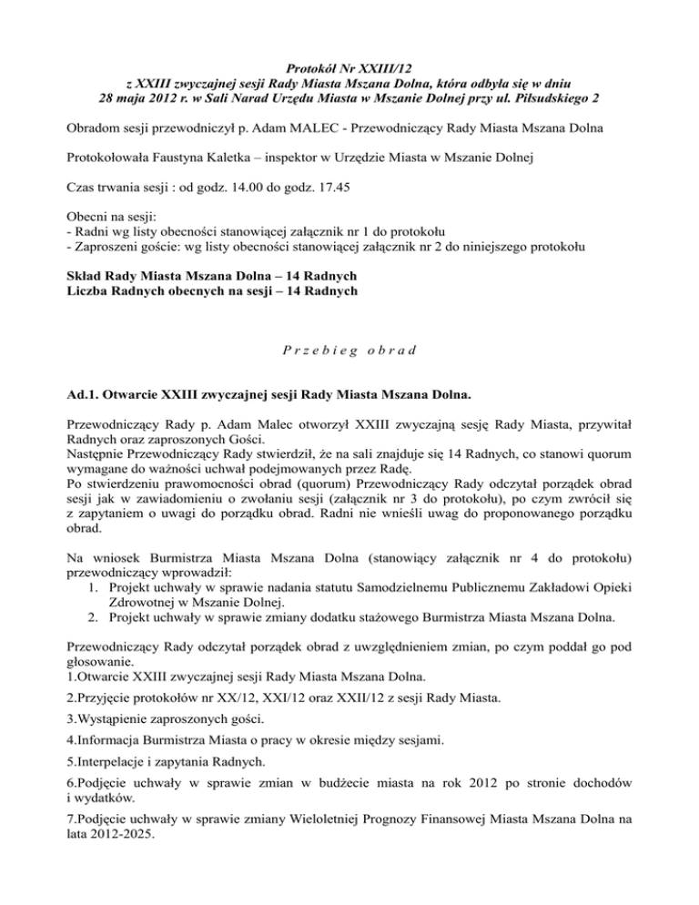 Protokół Nr XXIII/12 z XXIII zwyczajnej sesji Rady Miasta Mszana Dolna, która odbyła się w dniu 28 maja 2012 r. w Sali Narad Urzędu Miasta w Mszanie Dolnej przy ul. Piłsudskiego 2 Obradom sesji przewodniczył p. Adam MALEC - Przewodniczący Rady Miasta Mszana Dolna Protokołowała Faustyna Kaletka – inspektor w Urzędzie Miasta w Mszanie Dolnej Czas trwania sesji : od godz. 14.00 do godz. 17.45 Obecni na sesji: - Radni wg listy obecności stanowiącej załącznik nr 1 do protokołu - Zaproszeni goście: wg listy obecności stanowiącej załącznik nr 2 do niniejszego protokołu Skład Rady Miasta Mszana Dolna – 14 Radnych Liczba Radnych obecnych na sesji – 14 Radnych Przebieg obrad Ad.1. Otwarcie XXIII zwyczajnej sesji Rady Miasta Mszana Dolna. Przewodniczący Rady p. Adam Malec otworzył XXIII zwyczajną sesję Rady Miasta, przywitał Radnych oraz zaproszonych Gości. Następnie Przewodniczący Rady stwierdził, że na sali znajduje się 14 Radnych, co stanowi quorum wymagane do ważności uchwał podejmowanych przez Radę. Po stwierdzeniu prawomocności obrad (quorum) Przewodniczący Rady odczytał porządek obrad sesji jak w zawiadomieniu o zwołaniu sesji (załącznik nr 3 do protokołu), po czym zwrócił się z zapytaniem o uwagi do porządku obrad. Radni nie wnieśli uwag do proponowanego porządku obrad. Na wniosek Burmistrza Miasta Mszana Dolna (stanowiący załącznik nr 4 do protokołu) przewodniczący wprowadził: 1. Projekt uchwały w sprawie nadania statutu Samodzielnemu Publicznemu Zakładowi Opieki Zdrowotnej w Mszanie Dolnej. 2. Projekt uchwały w sprawie zmiany dodatku stażowego Burmistrza Miasta Mszana Dolna. Przewodniczący Rady odczytał porządek obrad z uwzględnieniem zmian, po czym poddał go pod głosowanie. 1.Otwarcie XXIII zwyczajnej sesji Rady Miasta Mszana Dolna. 2.Przyjęcie protokołów nr XX/12, XXI/12 oraz XXII/12 z sesji Rady Miasta. 3.Wystąpienie zaproszonych gości. 4.Informacja Burmistrza Miasta o pracy w okresie między sesjami. 5.Interpelacje i zapytania Radnych. 6.Podjęcie uchwały w sprawie zmian w budżecie miasta na rok 2012 po stronie dochodów i wydatków. 7.Podjęcie uchwały w sprawie zmiany Wieloletniej Prognozy Finansowej Miasta Mszana Dolna na lata 2012-2025. 8.Podjęcie uchwały w sprawie zatwierdzenia sprawozdania finansowego Miejskiego Ośrodka Kultury w Mszanie Dolnej. 9.Podjęcie uchwały w sprawie zatwierdzenia sprawozdania finansowego Miejskiej Biblioteki w Mszanie Dolnej. 10.Podjęcie uchwały w sprawie zatwierdzenia sprawozdania finansowego Samodzielnego Publicznego Zakładu Opieki Zdrowotnej w Mszanie Dolnej. 11. Podjęcie uchwały w sprawie nadania statutu Samodzielnemu Publicznemu Zakładowi Opieki Zdrowotnej w Mszanie Dolnej. 12. Podjęcie uchwały w sprawie zmiany dodatku stażowego Burmistrza Miasta Mszana Dolna. 13.Podjęcie uchwały w sprawie zaciągnięcia kredytu na spłatę zobowiązań z tytułu wcześniej zaciągniętych pożyczek i kredytów. 14.Podjęcie uchwały w sprawie zaciągnięcia kredytu na sfinansowanie planowanego deficytu budżetu Miasta Mszana Dolna na 2012 rok 15.Podjęcie uchwały w sprawie wyrażenia zgody na odstąpienie od obowiązku przetargowego zawarcia umowy najmu lokalu stanowiącego własność Miasta Mszana Dolna. 16.Podjęcie uchwały w sprawie zbycia niezabudowanej nieruchomości stanowiącej własność Miasta Mszana Dolna (dz. ew. nr 9985/2) 17.Podjęcie uchwały w sprawie oddania w najem na okres 10 lat lokalu użytkowego stanowiącego własność Miasta Mszana Dolna. 18.Podjęcie uchwały w sprawie zbycia nieruchomości stanowiących własność Miasta Mszana Dolna (dz. ew. nr 4904/5, 4904/10, 4904/11) 19.Podjęcie uchwały w sprawie wyrażenia zgody na zawarcie kolejnej umowy najmu lokalu stanowiącego własność Miasta Mszana Dolna (lokal użytkowy nr 3 i nr 5 przy ul. Starowiejskiej) 20.Podjęcie uchwały w sprawie zbycia niezabudowanych nieruchomości stanowiących własność Miasta Mszana Dolna (dz. ew. nr 6089/5, 6409/4, 6410/2, 6449/2) 21.Podjęcie uchwały w sprawie wyrażenia zgody na zamianę nieruchomości. 22.Podjęcie uchwały w sprawie wyrażenia zgody na zawarcie kolejnej umowy dzierżawy gruntu stanowiącego własność Miasta Mszana Dolna. 23.Podjęcie uchwały w sprawie przyjęcia programu opieki nad zwierzętami bezdomnymi oraz zapobiegania bezdomności zwierząt na terenie miasta Mszana Dolna. 24.Odpowiedzi na interpelacje i zapytania Radnych. 25.Wolne wnioski. 26.Zamknięcie obrad XXIII zwyczajnej sesji Rady Miasta Mszana Dolna. Rada Miasta w głosowaniu jawnym, jednogłośnie „za” przyjęła porządek obrad XXIII sesji Rady Miasta Mszana Dolna Ad.2. Przyjęcie protokołów nr XX/12, XXI/12 oraz XXII/12 z sesji Rady Miasta. Przewodniczący obrad poinformował, że protokół nr XX/12 z posiedzenia Rady Miasta został wyłożony do wglądu w Biurze Rady Miasta. Został on również przesłany do radnych pocztą elektroniczną. Radni nie wnieśli uwag do protokołu. Wobec powyższego, Przewodniczący Rady Miasta poddał pod głosowanie przyjęcie protokołu. Rada Miasta w głosowaniu jawnym, jednogłośnie „za”, przyjęła protokół nr XX/12 z posiedzenia Rady Miasta Mszana Dolna. Przewodniczący obrad poinformował, że protokół nr XXI/12 z posiedzenia Rady Miasta został wyłożony do wglądu w Biurze Rady Miasta. Został on również przesłany do radnych pocztą elektroniczną. Radni nie wnieśli uwag do protokołu. Wobec powyższego, Przewodniczący Rady Miasta poddał pod głosowanie przyjęcie protokołu. Rada Miasta w głosowaniu jawnym, przy 13 głosach „za” i 1 głosie „wstrzymującym się”, przyjęła protokół nr XXI/12 z posiedzenia Rady Miasta Mszana Dolna. Przewodniczący obrad poinformował, że protokół nr XXII/12 z posiedzenia Rady Miasta został wyłożony do wglądu w Biurze Rady Miasta. Został on również przesłany do radnych pocztą elektroniczną. Radni nie wnieśli uwag do protokołu. Wobec powyższe