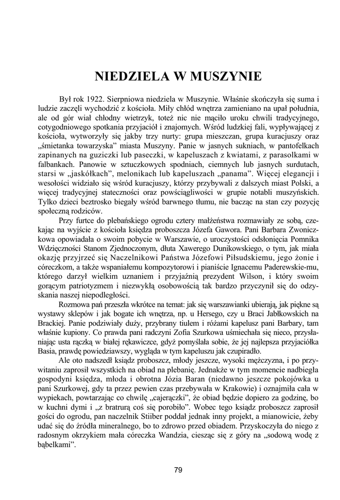 NIEDZIELA W MUSZYNIE Był rok 1922. Sierpniowa niedziela w Muszynie. Właśnie skończyła się suma i ludzie zaczęli wychodzić z kościoła. Miły chłód wnętrza zamieniano na upał południa, ale od gór wiał chłodny wietrzyk, toteż nic nie mąciło uroku chwili tradycyjnego, cotygodniowego spotkania przyjaciół i znajomych. Wśród ludzkiej fali, wypływającej z kościoła, wytworzyły się jakby trzy nurty: grupa mieszczan, grupa kuracjuszy oraz „śmietanka towarzyska” miasta Muszyny. Panie w jasnych sukniach, w pantofelkach zapinanych na guziczki lub paseczki, w kapeluszach z kwiatami, z parasolkami w falbankach. Panowie w sztuczkowych spodniach, ciemnych lub jasnych surdutach, starsi w „jaskółkach”, melonikach lub kapeluszach „panama”. Więcej elegancji i wesołości widziało się wśród kuracjuszy, którzy przybywali z dalszych miast Polski, a więcej tradycyjnej stateczności oraz powściągliwości w grupie notabli muszyńskich. Tylko dzieci beztrosko biegały wśród barwnego tłumu, nie bacząc na stan czy pozycję społeczną rodziców. Przy furtce do plebańskiego ogrodu cztery małżeństwa rozmawiały ze sobą, czekając na wyjście z kościoła księdza proboszcza Józefa Gawora. Pani Barbara Zwoniczkowa opowiadała o swoim pobycie w Warszawie, o uroczystości odsłonięcia Pomnika Wdzięczności Stanom Zjednoczonym, dłuta Xawerego Dunikowskiego, o tym, jak miała okazję przyjrzeć się Naczelnikowi Państwa Józefowi Piłsudskiemu, jego żonie i córeczkom, a także wspaniałemu kompozytorowi i pianiście Ignacemu Paderewskie-mu, którego darzył wielkim uznaniem i przyjaźnią prezydent Wilson, i który swoim gorącym patriotyzmem i niezwykłą osobowością tak bardzo przyczynił się do odzyskania naszej niepodległości. Rozmowa pań przeszła wkrótce na temat: jak się warszawianki ubierają, jak piękne są wystawy sklepów i jak bogate ich wnętrza, np. u Hersego, czy u Braci Jabłkowskich na Brackiej. Panie podziwiały duży, przybrany tiulem i różami kapelusz pani Barbary, tam właśnie kupiony. Co prawda pani radczyni Zofia Szurkowa uśmiechała się nieco, przysłaniając usta rączką w białej rękawiczce, gdyż pomyślała sobie, że jej najlepsza przyjaciółka Basia, prawdę powiedziawszy, wygląda w tym kapeluszu jak czupiradło. Ale oto nadszedł ksiądz proboszcz, młody jeszcze, wysoki mężczyzna, i po przywitaniu zaprosił wszystkich na obiad na plebanię. Jednakże w tym momencie nadbiegła gospodyni księdza, młoda i obrotna Józia Baran (niedawno jeszcze pokojówka u pani Szurkowej, gdy ta przez pewien czas przebywała w Krakowie) i oznajmiła cała w wypiekach, powtarzając co chwilę „cajerączki”, że obiad będzie dopiero za godzinę, bo w kuchni dymi i „z bratrurą coś się porobiło”. Wobec tego ksiądz proboszcz zaprosił gości do ogrodu, pan naczelnik Stiiber poddał jednak inny projekt, a mianowicie, żeby udać się do źródła mineralnego, bo to zdrowo przed obiadem. Przyskoczyła do niego z radosnym okrzykiem mała córeczka Wandzia, ciesząc się z góry na „sodową wodę z bąbelkami”. 79 Całe towarzystwo ruszyło drogą wzdłuż Muszynki, rwącej górskiej rzeczki. Dzieci państwa Stiiberów, Zwoniczków, Szurków i Kalmusów pobiegły naprzód, by po przejściu chybotliwej kładki - jak najszybciej znaleźć się przy źródle. Dwie najmłodsze dziewczynki, Wandeczka Stuber i Janeczka Szurek, trzymały się swoich tatusiów, słusznie licząc na to, że panowie wezmą je na ręce. Rzeczywiście pan Stuber uniósł córeczkę i posadził ją sobie na ramionach. Uszczęśliwiona patrzyła teraz z góry na młodszą o rok Janeczkę, która, niesiona najpierw przez tatusia, przeszła wkrótce na ręce księdza proboszcza, swego chrzestnego ojca. Ksiądz dobrodziej nie pojął ambicji dziewczynki, która gorąco pragnęła wznieść się na poziom rywalki i ograniczył się do niesienia jej na ręku. Nachmurzona spoglądała niezbyt chętnie na swego chrzestnego, od czasu do czasu próbując kopnąć jego czarną sutannę. Radcostwo Szurkowie od czterech lat nie mieszkali już w Muszynie, lecz w Kosowie na Pokuciu, gdzie inżynier Michał Szurek był nadleśniczym w lasach państwowych. Przyjechali do Muszyny tylko na kilka dni, na zaproszenie księdza Gawora, który koniecznie chciał zobaczyć swoją chrześniaczkę. Odnaleźli tu dawnych przyjaciół, panią Barbarę i jej męża, inżyniera Zwoniczka, który niedawno prowadził prace przy przedłużeniu linii kolejowej z Muszyny do Krynicy, a także poznali nowych znajomych księdza proboszcza: pana naczelnika stacji Stiibera z żoną i dziećmi oraz naczelnika poczty pana Kalmusa z rodziną. Teraz wszyscy z wielkim zaciekawieniem i przejęciem słuchali opowiadania pana Michała o tym, jak przed czterema laty, gdy w Małopolsce Wschodniej „wybuchła” Ukraina, cudem niemal uszedł śmierci, gdy zaaresztowany z kilkoma Polakami, siedział w więzieniu w Kosowie. Wykonanie wyroku śmierci zapowiedziano więźniom na godzinę piątą rano, tymczasem o trzeciej w nocy wkroczyło do Kosowa wojsko rumuńskie, uwolniło więźniów i przepędziło „hajdamaków”. Później rozmowa zeszła na ciężką sytuację w kraju. Pan naczelnik Kalmus i ksiądz proboszcz z troską opowiadali, że dziś za kwintal żyta można kupić co najwyżej 10 metrów taniego perkalu, albo 3 metry najtańszej ubraniowej wełny, albo dwie pary kiepskich butów. Ewentualnie można opłacić jeden dzień nauki dziecka w prywatnej szkole lub przejechać 20 km trzecią klasą pociągu osobowego. Niedługo odrodzony kraj obchodzić będzie czwartą rocznicę odzyskania wolności, a bieda w mieście i na wsi obejmuje coraz szersze warstwy ludności. Na pociechę pan naczelnik Stuber przekazał dobrą nowinę, dowiedział się bowiem z dobrze poiformowanych źródeł, iż Naczelnik Państwa Józef Piłsudski wysuwa kandydaturę profesora Narutowicza na pierwszego pr