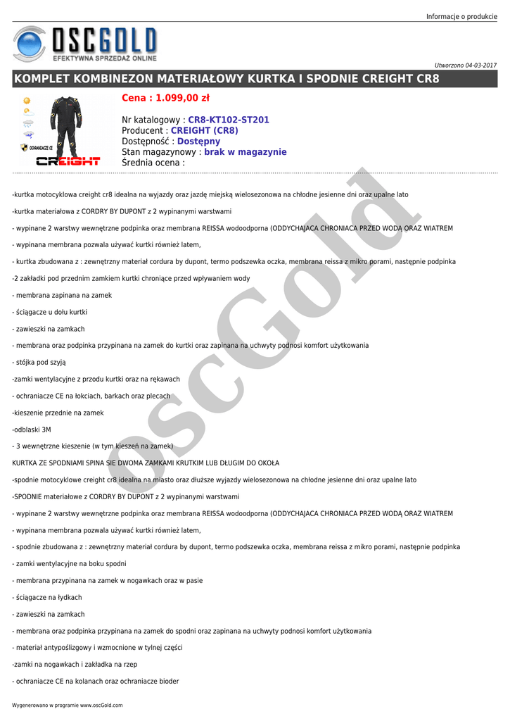 Informacje o produkcie Utworzono 04-03-2017 KOMPLET KOMBINEZON MATERIAŁOWY KURTKA I SPODNIE CREIGHT CR8 Cena : 1.099,00 zł Nr katalogowy : CR8-KT102-ST201 Producent : CREIGHT (CR8) Dostępność : Dostępny Stan magazynowy : brak w magazynie Średnia ocena : -kurtka motocyklowa creight cr8 idealna na wyjazdy oraz jazdę miejską wielosezonowa na chłodne jesienne dni oraz upalne lato d -kurtka materiałowa z CORDRY BY DUPONT z 2 wypinanymi warstwami - wypinane 2 warstwy wewnętrzne podpinka oraz membrana REISSA wodoodporna (ODDYCHAJACA CHRONIACA PRZED WODĄ ORAZ WIATREM - wypinana membrana pozwala używać kurtki również latem, ol - kurtka zbudowana z : zewnętrzny materiał cordura by dupont, termo podszewka oczka, membrana reissa z mikro porami, następnie podpinka -2 zakładki pod przednim zamkiem kurtki chroniące przed wpływaniem wody - membrana zapinana na zamek - zawieszki na zamkach cG - ściągacze u dołu kurtki - membrana oraz podpinka przypinana na zamek do kurtki oraz zapinana na uchwyty podnosi komfort użytkowania - stójka pod szyją -zamki wentylacyjne z przodu kurtki oraz na rękawach - ochraniacze CE na łokciach, barkach oraz plecach os -kieszenie przednie na zamek -odblaski 3M - 3 wewnętrzne kieszenie (w tym kieszeń na zamek) KURTKA ZE SPODNIAMI SPINA SIE DWOMA ZAMKAMI KRUTKIM LUB DŁUGIM DO OKOŁA -spodnie motocyklowe creight cr8 idealna na miasto oraz dłuższe wyjazdy wielosezonowa na chłodne jesienne dni oraz upalne lato -SPODNIE materiałowe z CORDRY BY DUPONT z 2 wypinanymi warstwami - wypinane 2 warstwy wewnętrzne podpinka oraz membrana REISSA wodoodporna (ODDYCHAJACA CHRONIACA PRZED WODĄ ORAZ WIATREM - wypinana membrana pozwala używać kurtki również latem, - spodnie zbudowana z : zewnętrzny materiał cordura by dupont, termo podszewka oczka, membrana reissa z mikro porami, następnie podpinka - zamki wentylacyjne na boku spodni - membrana przypinana na zamek w nogawkach oraz w pasie - ściągacze na łydkach - zawieszki na zamkach - membrana oraz podpinka przypinana na zamek do spodni oraz zapinana na uchwyty podnosi komfort użytkowania - materiał antypoślizgowy i wzmocnione w tylnej części -zamki na nogawkach i zakładka na rzep - ochraniacze CE na kolanach oraz ochraniacze bioder Wygenerowano w programie www.oscGold.com -kieszenie przednie na zamek -odblaski 3M - 3 wewnętrzne kieszenie (w tym kieszeń na zamek) możliwość mieszania rozmiarów kurtki i spodni ROZMIARY S,M,L,XL,XXL,XXXL Dostępne opcje KOMPLET KOMBINEZON MATERIAŁOWY KURTKA I SPODNIE CREIGHT CR8 os cG ol d ROZMIAR: S, M, L, XL, XXL, XXXL.