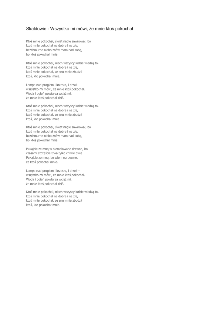 Skaldowie - Wszystko mi mówi, że mnie ktoś pokochał Ktoś mnie pokochał, świat nagle zawirował, bo ktoś mnie pokochał na dobre i na złe, bezchmurne niebo znów mam nad sobą, bo ktoś pokochał mnie. Ktoś mnie pokochał, niech wszyscy ludzie wiedzą to, ktoś mnie pokochał na dobre i na złe, ktoś mnie pokochał, ze snu mnie zbudził ktoś, kto pokochał mnie. Lampa nad progiem i krzesło, i drzwi – wszystko mi mówi, że mnie ktoś pokochał. Woda i ogień powtarza wciąż mi, że mnie ktoś pokochał dziś. Ktoś mnie pokochał, niech wszyscy ludzie wiedzą to, ktoś mnie pokochał na dobre i na złe, ktoś mnie pokochał, ze snu mnie zbudził ktoś, kto pokochał mnie. Ktoś mnie pokochał, świat nagle zawirował, bo ktoś mnie pokochał na dobre i na złe, bezchmurne niebo znów mam nad sobą, bo ktoś pokochał mnie. Pukajcie ze mną w niemalowane drewno, bo czasami szczęście trwa tylko chwile dwie. Pukajcie ze mną, bo wiem na pewno, że ktoś pokochał mnie. Lampa nad progiem i krzesło, i drzwi – wszystko mi mówi, że mnie ktoś pokochał. Woda i ogień powtarza wciąż mi, że mnie ktoś pokochał dziś. Ktoś mnie pokochał, niech wszyscy ludzie wiedzą to, ktoś mnie pokochał na dobre i na złe, ktoś mnie pokochał, ze snu mnie zbudził ktoś, kto pokochał mnie.