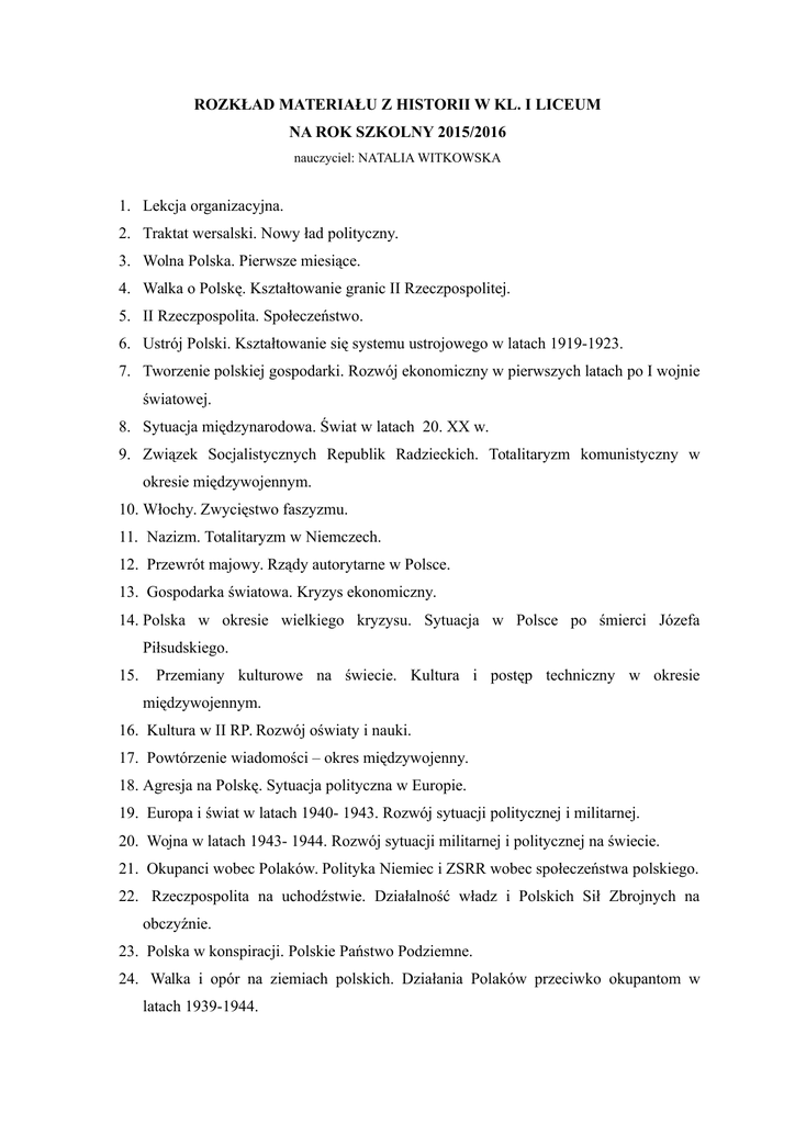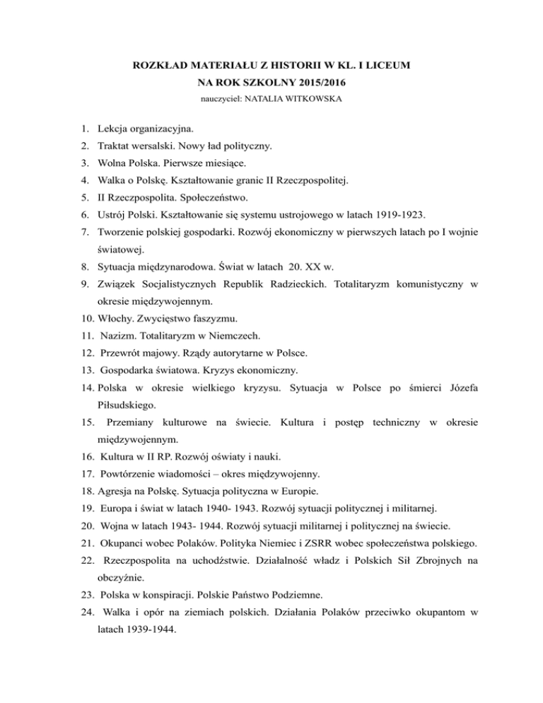 ROZKŁAD MATERIAŁU Z HISTORII W KL. I LICEUM NA ROK SZKOLNY 2015/2016 nauczyciel: NATALIA WITKOWSKA 1. Lekcja organizacyjna. 2. Traktat wersalski. Nowy ład polityczny. 3. Wolna Polska. Pierwsze miesiące. 4. Walka o Polskę. Kształtowanie granic II Rzeczpospolitej. 5. II Rzeczpospolita. Społeczeństwo. 6. Ustrój Polski. Kształtowanie się systemu ustrojowego w latach 1919-1923. 7. Tworzenie polskiej gospodarki. Rozwój ekonomiczny w pierwszych latach po I wojnie światowej. 8. Sytuacja międzynarodowa. Świat w latach 20. XX w. 9. Związek Socjalistycznych Republik Radzieckich. Totalitaryzm komunistyczny w okresie międzywojennym. 10. Włochy. Zwycięstwo faszyzmu. 11. Nazizm. Totalitaryzm w Niemczech. 12. Przewrót majowy. Rządy autorytarne w Polsce. 13. Gospodarka światowa. Kryzys ekonomiczny. 14. Polska w okresie wielkiego kryzysu. Sytuacja w Polsce po śmierci Józefa Piłsudskiego. 15. Przemiany kulturowe na świecie. Kultura i postęp techniczny w okresie międzywojennym. 16. Kultura w II RP. Rozwój oświaty i nauki. 17. Powtórzenie wiadomości – okres międzywojenny. 18. Agresja na Polskę. Sytuacja polityczna w Europie. 19. Europa i świat w latach 1940- 1943. Rozwój sytuacji politycznej i militarnej. 20. Wojna w latach 1943- 1944. Rozwój sytuacji militarnej i politycznej na świecie. 21. Okupanci wobec Polaków. Polityka Niemiec i ZSRR wobec społeczeństwa polskiego. 22. Rzeczpospolita na uchodźstwie. Działalność władz i Polskich Sił Zbrojnych na obczyźnie. 23. Polska w konspiracji. Polskie Państwo Podziemne. 24. Walka i opór na ziemiach polskich. Działania Polaków przeciwko okupantom w latach 1939-1944. 25. Początki Polski Ludowej. Od utworzenia PPR do powstania PKWN. 26. Powstanie warszawskie. Niepowodzenia Rządu RP na arenie międzynarodowej. 27. Zakończenie II wojny światowej. 28. Powtórzenie wiadomości- II wojna światowa. 29. Układ sił po II wojnie światowej. Zimna wojna. 30. Blok wschodni. ZSRR i kraje satelickie. 31. Europa Zachodnia po wojnie. Początki integracji. 32. Dekolonizacja. Narodziny państwa Izrael. 33. Wybrane kryzysy i konflikty zbrojne w świecie. Lata 60. i 70. XX w. 34. Chiny i USA. Wybrane zagadnienia z historii drugiej połowy XX w. 35. Upadek komunizmu w Europie. Rozpad ZSRR i Jugosławii oraz zjednoczenie Niemiec. 36. Unia Europejska. Narodziny i rozwój integracji. 37. Kultura i społeczeństwo. Przemiany po II wojnie światowej. 38. Chrześcijaństwo. Wybrane zagadnienia z drugiej połowy XX w. 39. Polska Ludowa. Pierwsze powojenne dziesięciolecie. 40. PRL w czasach Gomułki. Lata 1956- 1970. 41. Rządy Gierka. PRL w latach 1970- 1980. 42. Narodziny „Solidarności”. Od Sierpnia ‘ 80 do stanu wojennego. 43. Narodziny III Rzeczpospolitej. Polska u schyłku XX w. 44. Powtórzenie wiadomości – półwiecze powojenne.