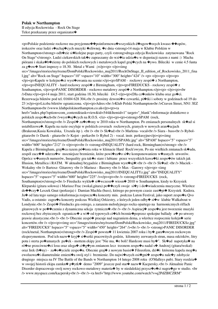 Polak w Northampton II edycja Rockowiska - Rock On Stage Tekst przekazany przez organizator� <p>Polskie podziemie rockowe ma przyjemno��poinformowa�wszystkich d�ugow�osych kwaso-��opów, irokezów oraz ludzi s�uchaj�cych muzyki �eliwnej, �e dnia <strong>14 maja w Klubie Polskim w Northampton</strong> odb�zie si�kolejne pogo party, czyli <strong>druga edycja Rockowiska zatytuowana "Rock On Stage"</strong>. Ludzi ciekawskich tak�e zapraszamy do wzi�ia udzia�u w degustacji razem z nami :) Macha piórami i skaka�b�ziemy do polskich rockowych i metalowych kapel graj�cych na �ywo. Bileciki w cenie 4.5 funta za g�ow� Start imprezy o 18.30. Metal z Wami ;)</p><p> </p><img src="/images/stories/my/rozne/DomPolski/Rockowisko_maj2011/RockOnStage_II_edition_of_Rockowisko_2011_fina l.jpg" alt="Rock on Stage" hspace="10" vspace="10" width="300" height="424" /> <p> </p><p> </p><p> </p><p>Kapele w kolejno�ci wyst�owania na scenie:</p><p>SPAM - rockowy zespó� z Northampton, </p><p>INEQUALITY - hard rockowy zespó� z Birmingham, </p><p>FIREDUCKS - rockowy zespó� z Southampton, </p><p>PANIC DISORDER - rockowo metalowy zespó� z Northampton.</p><p> </p><p><br />Data:</p><p>14 maja 2011, start godzina 18.30, bileciki £4.5 </p><p>(Dla cz�onków klubu oraz go�ci. Rezerwacja biletów pod tel. 01604 628 304,<br /> prosimy dzwoni�w czwartki, pi�tki i soboty w godzinach od 19 do 23 )</p><p>Liczba biletów ograniczona. </p><p>Adres:<br />Klub Polski Northampton<br />Craven Street, NN1 3EZ Northampton<br />www.klubpolskinorthampton.co.uk</p><p><a href="index.php?option=com_content&task=view&id=544&Itemid=1" target="_blank">Informacje dodatkowe o polskich zespo�ach<br />wyst�uj�cych na R.O.S. </a> </p><p><p><strong>SPAM (rock, Northampton)</strong><br /> Zespó� za�o�ony w 2010 roku w Northampton. Po zmianach personalnych sk�ad si ustabilizowa�. Kapela na razie oscyluje w polskich coverach rockowych, granych w nowych aran�acjach (Brakeout,Kasia Kowalska, Urszula itp ). <br /> <br /> Sk�ad:<br /> Marlena- vocal<br /> Siara - bass<br /> Rybolgitara<br /> Darek - gitara<br /> Kojot - perka<br /> Rybol 2) - vocal. instr. perkusyjne</p><p><img src="/images/stories/my/rozne/DomPolski/Rockowisko_maj2011/SPAMz.jpg" alt="SPAM" hspace="5" vspace="5" width="600" height="212" /> </p><p><br /> <strong>INEQUALITY (hard rock, Birmingham)</strong> <br /> Kapela z Birmingham, graj�ca razem pó�tora roku w klimacie Hard Rock'owym. Po nie wielkich zmianach sk�adu, zespól zacz�� uderza�w mocniejsze brzmienie, które powi�za�o si�z komponowaniem w�asnych utworów. Oprócz w�asnych numerów, Inequality gra tak�e stare i lubiane przez wszystkich kawa�ki zespo�ów takich jak Illusion, Metallica i RATM. W aktualnej brygadzie z Birmingham wyst�uj�:<br /> <br /> Sk�ad: <br /> Maciek Wokalny <br /> Bartosz- Gitarowy <br /> Mariusz - Basowy <br /> Max - Garowy </p><p> <img src="/images/stories/my/rozne/DomPolski/Rockowisko_maj2011/INEQUALITYz.jpg" alt="INEQUALITY" hspace="5" vspace="5" width="600" height="225" /></p><p><br /> <strong>FIREDUCKS (rock, Southampton)</strong><br /> Fireducks wyklu� si�wczesn� wiosn� 2010 w Southampton, kiedy to Krzysiek Kleparski (gitara solowa) i Mariusz Frac (wokal,gitara) po��czyli swoje si�y i do�wiadczenia muzyczne. Wkrótce do��czy� Leszek Gnat (perkusja) i Damian Machla (bass), którego po pewnym czasie zast�pi� Krzysiek Kudera. Ju� od lata tego samego rokuformacja rozpocze�a koncerty min. podczas Luton Festival, jako suport zespo�u Qvo Vadis, a ostatnio zagra�a koncerty podczas Wielkiej Orkiestry, z których jeden odby� si�w klubie Walkabout w Londynie.<br /> Zespó� Fireducks gra ostrego, a zarazem melodyjnego rocka opartego na harmonicznych riffach gitarowych w po��czeniu z dynamiczna sekcja rytmiczn�.<br /> <br /> Aspiracj� zespo�u jest tworzenie muzyki rockowej bez zbytecznych ogranicze� a wi� od typowych ci�ich brzmie�poprzez spokojne ballady a� po utwory prawie akustyczne.<br /> <br /> Obecnie zespó� pracuje nad nagraniem dema, a wkrótce rozpocznie kolejn� serie koncertów.<br /> </p><p><img src="/images/stories/my/rozne/DomPolski/Rockowisko_maj2011/FIREDUCKSz.jpg" alt="FIREDUCKS" hspace="5" vspace="5" width="450" height="264" /><br /> <br /> <strong>PANIC DISORDER (rock/metal, Northampton)</strong><br /> Zespó� powsta� 11 kwietnia 2007 roku i by� gara�owym rockowym eksperymentem. Pod ich nazw� kryj� si�setki pracowitych godzin, kilometry zerwanych strun, masa odcisków, litry potu i sterta po�amanych pa�ek - mottem ekipy jest "Nie ma, �e boli! Hardcore musi by�". Sk�ad napotyka� na ró�ne przeciwno�ci losu oraz ulega� ci�g�ym zmianom lecz trzonem zespo�u nadal s� Andrzej (gitara/wokal) oraz Irek (b�ny) - za�o�yciele zespo�u. Obecnie graj� z nowym basist� Filozofem, dzi�i któremu kapela mog�a ewoluowa�i diametralnie zmieni�a swój styl i brzmienie. Do najwi�szych osi�gni� zespo�u nale�y zdobycie drugiego miejsca na IV The Battle of the Bands w Northampton 14 lutego 2008 roku (O'Malleys pub). Stary rozdzia� w swojej historii ekipa zamkn� p�ytk� demo "2009" jeszcze pod star� nazw� Kacpersky.<br /> Aktualnie Panic Disorder dopracowuje swój nowy rockowo-metalowy materia� by w niedalekiej przysz�o�ci nagra�go w studio. <br /> www.myspace.com/kacpersky<br /> <br /> <a href="http://www.youtube.com/watch?v=q2PdZBlCZRM" strona 1 / 2 Polak w Northampton II edycja Rockowiska - Rock On Stage Tekst przekazany przez organizator� target="_blank">Klip video do utworu "Warszawa"</a> </p><p><img src="/images/stories/my/rozne/DomPolski/Rockowisko_maj2011/Panic_Disorder_z.jpg" alt="Panic Disorder" hspace="5" vspace="5" width="450" height="338" /> </p><p> </p> strona 2 / 2