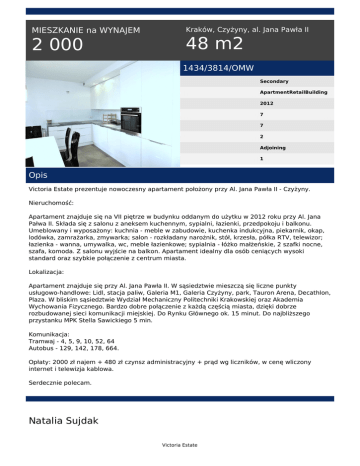 MIESZKANIE na WYNAJEM 2 000 Kraków, Czyżyny, al. Jana Pawła II 48 m2 1434/3814/OMW Secondary ApartmentRetailBuilding 2012 7 7 2 Adjoining 1 Opis Victoria Estate prezentuje nowoczesny apartament położony przy Al. Jana Pawła II - Czyżyny. Nieruchomość: Apartament znajduje się na VII piętrze w budynku oddanym do użytku w 2012 roku przy Al. Jana Pałwa II. Składa się z salonu z aneksem kuchennym, sypialni, łazienki, przedpokoju i balkonu. Umeblowany i wyposażony: kuchnia - meble w zabudowie, kuchenka indukcyjna, piekarnik, okap, lodówka, zamrażarka, zmywarka; salon - rozkładany narożnik, stół, krzesła, półka RTV, telewizor; łazienka - wanna, umywalka, wc, meble łazienkowe; sypialnia - łóżko małżeńskie, 2 szafki nocne, szafa, komoda. Z salonu wyjście na balkon. Apartament idealny dla osób ceniących wysoki standard oraz szybkie połączenie z centrum miasta. Lokalizacja: Apartament znajduje się przy Al. Jana Pawła II. W sąsiedztwie mieszczą się liczne punkty usługowo-handlowe: Lidl, stacja paliw, Galeria M1, Galeria Czyżyny, park, Tauron Arena, Decathlon, Plaza. W bliskim sąsiedztwie Wydział Mechaniczny Politechniki Krakowskiej oraz Akademia Wychowania Fizycznego. Bardzo dobre połączenie z każdą częścią miasta, dzięki dobrze rozbudowanej sieci komunikacji miejskiej. Do Rynku Głównego ok. 15 minut. Do najbliższego przystanku MPK Stella Sawickiego 5 min. Komunikacja: Tramwaj - 4, 5, 9, 10, 52, 64 Autobus - 129, 142, 178, 664. Opłaty: 2000 zł najem + 480 zł czynsz administracyjny + prąd wg liczników, w cenę wliczony internet i telewizja kablowa. Serdecznie polecam. Natalia Sujdak Victoria Estate tel. +48 516 547 102 email: [email protected] Victoria Estate Powered by TCPDF (www.tcpdf.org)