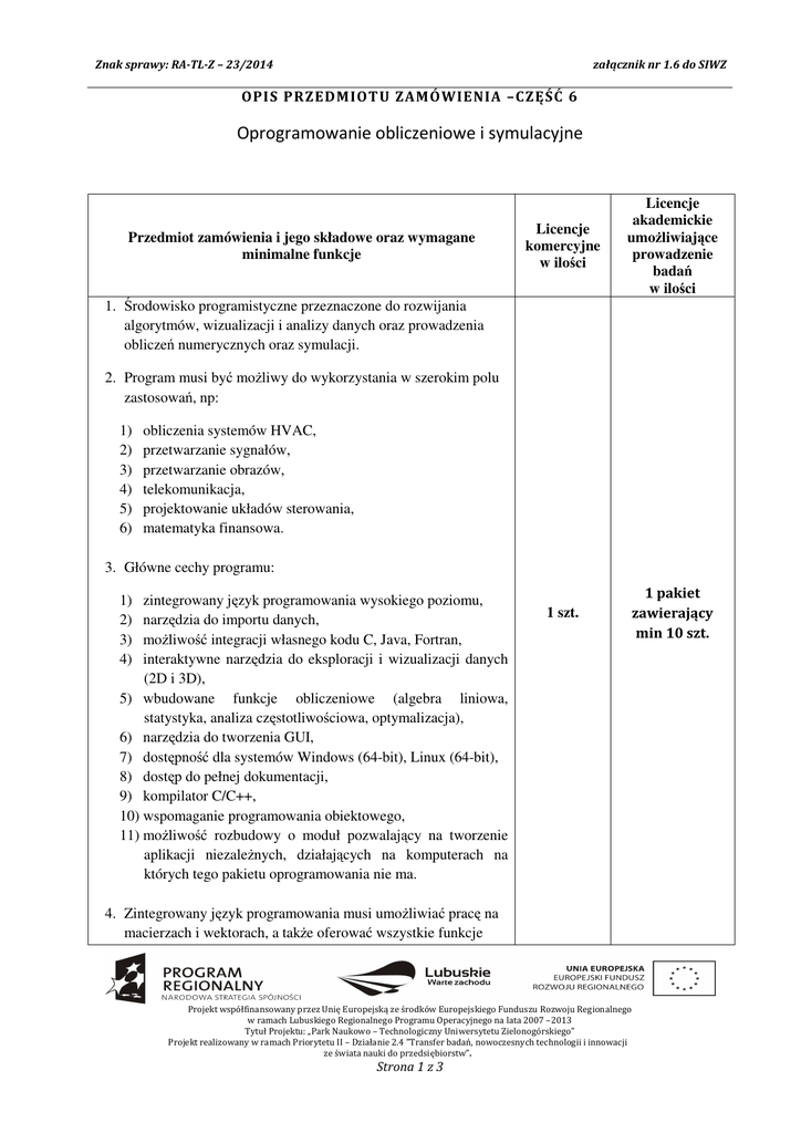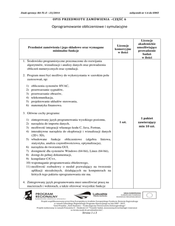 Znak sprawy: RA-TL-Z – 23/2014 załącznik nr 1.6 do SIWZ OPIS PRZEDMIOT U ZAMÓWIENIA –CZĘŚĆ 6 Oprogramowanie obliczeniowe i symulacyjne Przedmiot zamówienia i jego składowe oraz wymagane minimalne funkcje Licencje komercyjne w ilości Licencje akademickie umoŜliwiające prowadzenie badań w ilości 1 szt. 1 pakiet zawierający min 10 szt. 1. Środowisko programistyczne przeznaczone do rozwijania algorytmów, wizualizacji i analizy danych oraz prowadzenia obliczeń numerycznych oraz symulacji. 2. Program musi być moŜliwy do wykorzystania w szerokim polu zastosowań, np: 1) 2) 3) 4) 5) 6) obliczenia systemów HVAC, przetwarzanie sygnałów, przetwarzanie obrazów, telekomunikacja, projektowanie układów sterowania, matematyka finansowa. 3. Główne cechy programu: 1) 2) 3) 4) zintegrowany język programowania wysokiego poziomu, narzędzia do importu danych, moŜliwość integracji własnego kodu C, Java, Fortran, interaktywne narzędzia do eksploracji i wizualizacji danych (2D i 3D), 5) wbudowane funkcje obliczeniowe (algebra liniowa, statystyka, analiza częstotliwościowa, optymalizacja), 6) narzędzia do tworzenia GUI, 7) dostępność dla systemów Windows (64-bit), Linux (64-bit), 8) dostęp do pełnej dokumentacji, 9) kompilator C/C++, 10) wspomaganie programowania obiektowego, 11) moŜliwość rozbudowy o moduł pozwalający na tworzenie aplikacji niezaleŜnych, działających na komputerach na których tego pakietu oprogramowania nie ma. 4. Zintegrowany język programowania musi umoŜliwiać pracę na macierzach i wektorach, a takŜe oferować wszystkie funkcje Projekt współfinansowany przez Unię Europejską ze środków Europejskiego Funduszu Rozwoju Regionalnego w ramach Lubuskiego Regionalnego Programu Operacyjnego na lata 2007 –2013 Tytuł Projektu: „Park Naukowo – Technologiczny Uniwersytetu Zielonogórskiego” Projekt realizowany w ramach Priorytetu II – Działanie 2.4 ”Transfer badań, nowoczesnych technologii i innowacji ze świata nauki do przedsiębiorstw”. Strona 1 z 3 Znak sprawy: RA-TL-Z – 23/2014 załącznik nr 1.6 do SIWZ OPIS PRZEDMIOT U ZAMÓWIENIA –CZĘŚĆ 6 Oprogramowanie obliczeniowe i symulacyjne nowoczesnego języka programowania tj. pętle, wyraŜenia warunkowe, struktury danych i klasy. 5. Program musi posiadać wbudowane środowisko programistyczne: 1) edytor – podstawowe narzędzie do edycji i debugowania kodu, 2) analizator kodu – sprawdzający kod pod kątem występujących błędów i rekomendujący modyfikacje umoŜlwiające uzyskanie najwyŜszej wydajności, 3) profiler – obliczający czas, jaki jest wymagany na wykonanie kaŜdej z linii kodu, 4) raporty – prześwietlający pliki pod kątem róŜnic, zaleŜności i wydajności. 6. Program do symulacji musi być platformą do wielodomenowej symulacji i projektowania systemów dynamicznych z wykorzystaniem modeli. Musi stanowić interaktywne środowisko graficzne i zbiór bibliotek konfigurowalnych z blokami pozwalającymi dokładnie projektować, symulować, implementować i kontrolować przetwarzanie sygnałów, telekomunikację i inne systemy zdefiniowane w dziedzinie czasu. 7. Program musi być wyposaŜony w dodatkowe moduły rozszerzają środowisko o narzędzia do modelowania i projektowania specyficznych zadań oraz generację kodu, implementacji algorytmów, testowania i weryfikacji. 8. Program musi być zintegrowany ze środowiskiem programistycznym przedstawionym powyŜej, co musi zapewnić bezpośredni dostęp do szerokiego wachlarza narzędzi do budowy algorytmów, analizy i wizualizacji danych oraz obliczeń numerycznych. 9. Główne cechy oprogramowania do symulacji: 1) obszerne i dające się powiększać biblioteki zdefiniowanych bloków, 2) interaktywny edytor graficzny pozwalający intuicyjnie asemblować i zarządzać diagramami bloków, 3) zdolność zarządzania złoŜonymi projektami poprzez Projekt współfinansowany przez Unię Europejską ze środków Europejskiego Funduszu Rozwoju Regionalnego w ramach Lubuskiego Regionalnego Programu Operacyjnego na lata 2007 –2013 Tytuł Projektu: „Park Naukowo – Technologiczny Uniwersytetu Zielonogórskiego” Projekt realizowany w ramach Priorytetu II – Działanie 2.4 ”Transfer badań, nowoczesnych technologii i innowacji ze świata nauki do przedsiębiorstw”. Strona 2 z 3 Znak sprawy: RA-TL-Z – 23/2014 załącznik nr 1.6 do SIWZ OPIS PRZEDMIOT U ZAMÓWIENIA –CZĘŚĆ 6 Oprogramowanie obliczeniowe i symulacyjne segmentację modelu i hierarchizację komponentów projektu, 4) eksplorer modelu nawigujący, tworzący, konfigurujący i przeszukujący wszystkie sygnały, parametry i właściwości modelu, 5) zdolność do komunikowania się z innymi programami symulacyjnymi i dołączania ręcznie pisanego kodu, 6) moŜliwości uruchamiania stało- lub zmiennokrokowych symulacji w systemach w dziedzinie czasu interaktywnie lub za pomocą symulacji batch, 7) funkcje interaktywnego definiowania wejść i wyjść podglądowych do oszacowywania zachowania się modelu, 8) graficzny debugger do sprawdzania wyników symulacji i diagnozowania nieoczekiwanego zachowania się projektu, 9) narzędzia diagnozy i analizy modelu pozwalające upewnić się, co do spójności modelu i wykryć błędy modelowania. 10. W ramach realizacji przedmiotu zamówienia Wykonawca zapewni dostęp i prawo korzystania z instrukcji obsługi oprogramowania oraz nieodpłatnych materiałów szkoleniowych. Projekt współfinansowany przez Unię Europejską ze środków Europejskiego Funduszu Rozwoju Regionalnego w ramach Lubuskiego Regionalnego Programu Operacyjnego na lata 2007 –2013 Tytuł Projektu: „Park Naukowo – Technologiczny Uniwersytetu Zielonogórskiego” Projekt realizowany w ramach Priorytetu II – Działanie 2.4 ”Transfer badań, nowoczesnych technologii i innowacji ze świata nauki do przedsiębiorstw”. Strona 3 z 3