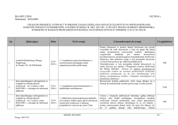 Ek-I.605.2.2016 Dokument : 2016-8891 1.02.2016 r. UWAGI DO PROJEKTU UCHWAŁY W SPRAWIE ZASAD UDZIELANIA DOTACJI CELOWYCH NA DOFINANSOWANIE KOSZTÓW INWESTYCJI PODMIOTÓW, O KTÓRYCH MOWA W ART. 403 UST. 4 USTAWY PRAWO OCHRONY ŚRODOWISKA WNIESIONE W RAMACH PROWADZONYCH KONSULTACJI SPOŁECZNYCH W TERMINIE 13.01-27.01.2016 R. Lp. 1. 2. 3. Zgłaszający Aeroklub Rybnickiego Okręgu Węglowego ul. Żorska 332, 44-200 Rybnik dane niepodlegające udostępnieniu ze względu na ochronę danych osobowych – art. 5 ustawy z dnia 06.09.2001 r. o dostępie do informacji publiczne dane niepodlegające udostępnieniu ze względu na ochronę danych osobowych – art. 5 ustawy z dnia 06.09.2001 r. o dostępie do informacji publiczne Data Treść uwagi 27.01. 2016 r. 1. Uzupełnienie grona beneficjentów o stowarzyszenia posiadające status organizacji pożytku publicznego 27.01. 2016 r. 1. Uzupełnienie grona beneficjentów o spółdzielnie mieszkaniowe 27.01. 2016 r. 1. Oddzielenie termomodernizacji budynku od wymiany źródeł ciepła, tak by inwestycję można było realizować w dłuższej perspektywie czasowej np. przez 2 lata NESOD: 2016-8891 Przyg.: Ek-I/133 Ustosunkowanie do uwagi Uwzględniono Pomoc finansowa w postaci dotacji kierowana jest przede wszystkim do osób fizycznych, a więc do grupy dla której zakup przydomowej oczyszczalni ścieków spełniającej wygórowane standardy jest bardzo kosztownym przedsięwzięciem, przekraczającym niejednokrotnie możliwości finansowe. Inne podmioty mogą w tym przypadku skorzystać z innych form pomocy np. odliczeń podatkowych. Ukierunkowanie w tym przypadku działań dotacyjnych na osoby fizyczne jest zgodne z Programem ochrony środowiska dla Miasta Rybnika: „Dotacje do budowy przydomowych oczyszczalni ścieków na terenach pozbawionych technicznej możliwości przyłączenia się do sieci kanalizacyjnej oraz budowy przepompowni ścieków z budynków mieszkalnych do kanalizacji sanitarnej”. Rozszerzono katalog podmiotów, które mogą ubiegać się o dotację do modernizacji systemu grzewczego o osoby prawne NIE TAK Ustawa o finansach publicznych formułuje ogólną definicje dotacji, jako środki podlegające szczególnym zasadom rozliczania, których przekazanie musi zostać poprzedzone zawarciem umowy dotacji, określającej m. in. cel zadania i termin wykorzystania dotacji, który nie może być dłuższy niż do 31 grudnia danego roku budżetowego. Termin NIE 1/6 4. 5. 6. 7. 8. dane niepodlegające udostępnieniu ze względu na ochronę danych osobowych – art. 5 ustawy z dnia 06.09.2001 r. o dostępie do informacji publiczne dane niepodlegające udostępnieniu ze względu na ochronę danych osobowych – art. 5 ustawy z dnia 06.09.2001 r. o dostępie do informacji publiczne dane niepodlegające udostępnieniu ze względu na ochronę danych osobowych – art. 5 ustawy z dnia 06.09.2001 r. o dostępie do informacji publiczne dane niepodlegające udostępnieniu ze względu na ochronę danych osobowych – art. 5 ustawy z dnia 06.09.2001 r. o dostępie do informacji publiczne dane niepodlegające udostępnieniu ze względu na ochronę danych osobowych – art. 5 ustawy z dnia 06.09.2001 r. o dostępie do informacji 27.01. 2016 r. 1. Oddzielenie termomodernizacji budynku od wymiany źródeł ciepła, tak by inwestycję można było realizować w dłuższej perspektywie czasowej np. przez 2 lata 27.01. 2016 r. 1. Uwzględnienie źródeł odnawialnych już zakupionych w budynkach oddawanych do użytku w 2016 r. NIE NIE 26.01. 2016 r. 1. Dotacja do kotłów węglowych w przypadku kiedy jest możliwość korzystania z gazu lub sieci c.o. 2. Termomodernizacja jako samodzielne działanie Zgodnie z obowiązującym dla Województwa Śląskiego Programem Ochrony Powietrza priorytetem przy wymianie źródeł ciepła powinno być podłączenie pod sieć ciepłowniczą (jeśli istnieje na danym obszarze) lub gazowniczą (jeśli podpięcie pod sieć ciepłowniczą jest nieuzasadnione ekonomicznie i technicznie). Podłączenie pod sieć gazowniczą musi być również technologicznie możliwe i ekonomicznie uzasadnione. Termomodernizacja bez równoczesnej wymiany źródła ciepła niesie obawy, że w budynkach wykorzystywane będą źródła ciepła przewymiarowane (źródła zaprojektowane dla budynków niedocieplonych), w efekcie po dociepleniu zmniejszy się zapotrzebowanie ciepła dla budynku, parametry pracy źródła ciepła ulegną pogorszeniu, co niekoniecznie skutkować będzie redukcją emisji zanieczyszczeń. NIE 27.01. 2016 r. 1. Uwzględnienie dotacji do przydomowych oczyszczalni ścieków w sytuacji kiedy urządzenie zostało zabudowane, a budynek nie został oddany do użytkowania W przypadku inwestycji związanych z zabudową przydomowej oczyszczalni ścieków lub przepompowni nie ma obowiązku by na dzień składania wniosku budynek był zgłoszony do użytkowania. TAK 27.01. 2016 r. 1. Uwzględnienie termomodernizacji w budynkach, które już korzystają z ekologicznego źródła ciepła Termomodernizacja bez równoczesnej wymiany źródła ciepła niesie obawy, że w budynkach wykorzystywane będą źródła ciepła przewymiarowane (źródła zaprojektowane dla budynków niedocieplonych), w efekcie po dociepleniu zmniejszy się NIE NESOD: 2016-8891 Przyg.: Ek-I/133 automatycznie wyklucza inwestycje kilkuroczne. Ustawa o finansach publicznych formułuje ogólną definicje dotacji, jako środki podlegające szczególnym zasadom rozliczania, których przekazanie musi zostać poprzedzone zawarciem umowy dotacji, określającej m. in. cel zadania i termin wykorzystania dotacji, który nie może być dłuższy niż do 31 grudnia danego roku budżetowego. Termin automatycznie wyklucza inwestycje kilkuroczne. Zasadą ogólną wszystkich dotacji celowych z budżetu jst jest obowiązek poprzedzenia przekazania dotacji zawarciem umowy. Umowa określa m. in. cel, na realizację którego są przekazywane środki dotacji. Zatem dotacja dotyczy ce