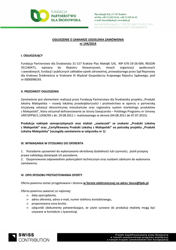 OGŁOSZENIE O ZAMIARZE UDZIELENIA ZAMÓWIENIA nr 144/2014 I. OGŁASZAJĄCY Fundacja Partnerstwo dla Środowiska 31-157 Kraków Plac Matejki 5/6, NIP 676-19-26-004, REGON 351240471, wpisana do Rejestru Stowarzyszeń, innych organizacji społecznych i zawodowych, fundacji i publicznych zakładów opieki zdrowotnej, prowadzonego przez Sąd Rejonowy dla Krakowa Śródmieścia w Krakowie XI Wydział Gospodarczy Krajowego Rejestru Sądowego, pod nr 0000098193. II. PRZEDMIOT OGŁOSZENIA Zamówienie jest elementem realizacji przez Fundację Partnerstwo dla Środowiska projektu „Produkt lokalny Małopolska – rozwój lokalnej przedsiębiorczości i przetwórstwa w oparciu o partnerską inicjatywę edukacji ekonomicznej mieszkańców oraz regionalny system marketingu produktów z Małopolski”, który otrzymał dofinansowanie ze strony Szwajcarsko – Polskiego Programu nr Umowy URP/SPPW/1.1/KIK/09 z dn. 29.08.2011 r. realizowanego w okresie (04.08.2011 do 07.07.2015). Produkcja naklejek samoprzylepnych oraz etykiet „zawieszek” ze znakami „Produkt Lokalny z Małopolski” oraz „Certyfikowany Produkt Lokalny z Małopolski” na potrzeby projektu „Produkt Lokalny Małopolska” (szczegóły zamówienia w załączniku nr 1) III. WYMAGANIA W STOSUNKU DO OFERENTA 1. Posiadanie uprawnień do wykonywania określonej działalności lub czynności, jeżeli przepisy prawa nakładają obowiązek ich posiadania. 2. Dysponowanie odpowiednim potencjałem technicznym oraz osobami zdolnymi do wykonania zamówienia. IV. OPIS SPOSOBU PRZYGOTOWANIA OFERTY Oferta powinna zostać przygotowana i złożona w formie elektronicznej na adres: [email protected] Oferta powinna zawierać co najmniej: • datę sporządzenia, • adres oferenta, adres e-mail, numer telefonu kontaktowego, • proponowana cena brutto • załączniki (dokumenty potwierdzające, że użyte surowce do produkcji etykiety mogą być używane w kontakcie z żywnością) V. MIEJSCE ORAZ TERMIN SKŁADANIA OFERT Oferty należy składać na adres: [email protected], w terminie do dnia 29.12.2014 roku /do godz.12.00/ Przed upływem terminu składania ofert Wykonawca może zmienić lub wycofać swoją ofertę. Za ofertę złożoną uważana będzie wyłącznie kompletna oferta według szczegółów, która w powyższym terminie zostanie faktycznie dostarczona pod wskazany adres. Złożone oferty będą podlegały rozpatrzeniu i negocjacjom. Oferty złożone po terminie składania ofert nie będą rozpatrywane. Zamawiający nie dopuszcza składania ofert w formie faksu. VI. OCENA OFERT Zamawiający dokona oceny ważnych ofert na podstawie następujących kryteriów: 1. Cena brutto. Punktacja od 1 pkt-ocena bardzo niska do 5 pkt – ocena bardzo wysoka. VII. ROKOWANIA Oferenta, którego oferta jest oceniona jako spełniająca warunki ogłoszenia i która uzyska minimum połowę (50% plus 1) maksymalnej ilości punktów możliwych do uzyskania w ocenie Ogłaszający zaprasza do negocjacji warunków umowy. Przedmiotem negocjacji mogą być wszystkie kluczowe elementy oferty (zgodnie z zapisami pkt. IV). VIII. INFORMACJE DOTYCZĄCE WYBORU OFERTY 1. O wyborze oferty Ogłaszający zawiadomi każdorazowo za pośrednictwem strony internetowej znajdującej się pod adresem: www.fpds.pl 2. Ogłaszający nie ma obowiązku uzasadnienia dokonanego wyboru. 3. Oferty złożone po terminie będą zwrócone bez otwierania. 4. W toku badania i oceny ofert Ogłaszający może żądać od Oferenta/ów wyjaśnień dotyczących treści złożonych ofert. Dodatkowych informacji udziela: W sprawie zakresu prac: Karolina Braś, pod adresem e-mail: [email protected] /zapytania proszę kierować nie później niż 3 dni robocze przed upływem terminu składania ofert/ W pozostałych sprawach: Stanisław Olszówka, pod adresem e-mail: [email protected]. Załącznik nr 1 Szczegóły zamówienia: 1. Naklejki samoprzylepne „Produkt Lokalny z Małopolski” - nakład: 50 tys. sztuk - nakład: 100 tys. sztuk - nakład: 150 tys. sztuk - nakład: 200 tys. sztuk - na folii w kolorze białym, rozmiar fi 20 mm - kolor nadruku: pomarańczowy CMYK - klej 2. Naklejki samoprzylepne „Certyfikowany Produkt Lokalny z Małopolski” - nakład: 50 tys. sztuk - nakład: 100 tys. sztuk - nakład: 150 tys. sztuk - nakład: 200 tys. sztuk - na folii w kolorze białym, rozmiar fi 20 mm - kolor nadruku: złoty metaliczny Pantone 876C - klej 3. Etykiety jednostronne „zawieszki” „Produkt Lokalny z Małopolski” z gotową dziurką do zawieszenia - nakład: 50 tys. sztuk - nakład: 100 tys. sztuk - nakład: 150 tys. sztuk - nakład: 200 tys. sztuk - na kartonie w kolorze białym o gramaturze 250 g, rozmiar fi 30 mm - kolor nadruku: pomarańczowy CMYK 4. Etykiety jednostronne „zawieszki” „Certyfikowany Produkt Lokalny z Małopolski” z gotową dziurką do zawieszenia - nakład: 50 tys. sztuk - nakład: 100 tys. sztuk - nakład: 150 tys. sztuk - nakład: 200 tys. sztuk - na kartonie w kolorze białym o gramaturze 250 g, rozmiar fi 30 mm - kolor nadruku: złoty metaliczny Pantone 876C Naklejki oraz etykiety będą wykorzystywane do oznaczania produktów żywnościowych, dlatego użyte surowce do produkcji etykiety muszą posiadać odpowiedni atest i certyfikat. (Uprzejmie prosimy o załączenie zaświadczenia, że surowce posiadają atesty do kontaktu z żywnością).
