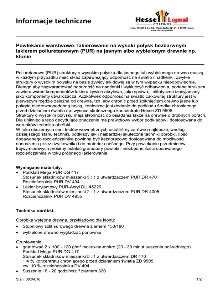 Informacje techniczne Hesse GmbH & Co. KG, Warendorfer Str. 21, D 59075 Hamm www.hesse-lignal.de Powlekanie warstwowe: lakierowanie na wysoki połysk bezbarwnym lakierem poliuretanowym (PUR) na jasnym albo wybielonym drewnie np. klonie Poliuretanowe (PUR) struktury o wysokim połysku dla jasnego lub wybielonego drewna muszą w każdym przypadku mieć skład zapewniający odporność na światło i nadtlenki. Zwykłe struktury o wysokim połysku na bazie żywicy alkidowej są w tym wypadku nieodpowiednie. Dlatego aby zagwarantować odporność na nadtlenki i wykluczyć odbarwienia, podana struktura zawiera wśród komponentów lakieru żywice akrylowe, jako spoiwo, i alifatyczne izocyjaniany jako komponenty utwardzacza. Aczkolwiek odporność na światło całkowitej struktury jest w pierwszym rzędzie zależna od drewna, tzn. aby chronić przed żółknięciem drewno jasne lub pokryte niedrewnopodobną bejcą, konieczne jest dodanie do podkładu środka chroniącego przed działaniem światła np. wysoce skutecznego koncentratu Hesse ZD 9505. Struktury o wysokim połysku mają skłonność do osiadania także na drewnie o drobnych porach. Dla uniknięcia tego decydujące znaczenie ma prawidłowy wybór podkładów i dostosowana do warunków technika obróbki. W toku obszernych serii testów wewnętrznych ustaliliśmy zarówno najlepsze, według dzisiejszego stanu techniki, podkłady jak i najbardziej skuteczne techniki obróbki. Ilość dodawanego rozcieńczalnika powinna być każdorazowo dostosowana do możliwości nanoszenia przez użytkownika i do materiału nośnego. Przy powlekaniu przedmiotów trójwymiarowych prosimy ustalać gramatury powłoki i niezbędne ilości dodawanego rozcieńczalnika w toku próbnego lakierowania. Wymagane materiały: Podkład Mega PUR DG 417 Stosunek składników mieszanki 5 : 1 z utwardzaczem PUR DR 470 Rozcieńczalnik PUR DV 494 Lakier brylantowy PUR-Acryl DU 45229 Stosunek składników mieszanki 2 : 1 z utwardzaczem PUR DR 4005 Rozcieńczalnik PUR DV 4935 Technika obróbki: Obróbka wstępna drewna, przykładowo dla klonu: Stopniowy szlif surowego drewna ziarnem 150/180 wybielone drewno wygładzać ponownie Gruntowanie: gruntować 2 x 100 - 120 g/m² mokro-na-mokro (20 - 30 minut suszenia pośredniego) Podkład Mega PUR DG 417 Stosunek składników mieszanki 5 : 1 z utwardzaczem DR 470 + 4 % koncentratu chroniącego przed działaniem światła ZD 9505 ew. 10 % rozcieńczalnika DV 494 Suszenie 16 - 20 godzin/szlif ziarnem 320 Stan: 08.04.16 1/2 Informacje techniczne Hesse GmbH & Co. KG, Warendorfer Str. 21, D 59075 Hamm www.hesse-lignal.de Powlekanie warstwowe: lakierowanie na wysoki połysk bezbarwnym lakierem poliuretanowym (PUR) na jasnym albo wybielonym drewnie np. klonie gruntować 2 x 100 - 120 g/m² mokro-na-mokro (20 - 30 minut suszenia pośredniego) Podkład Mega PUR DG 417 Stosunek składników mieszanki 5 : 1 z utwardzaczem DR 470 ew. 10 % rozcieńczalnika DV 494 Porady: Liczba warstw podkładu i gramatury powłok zależą od każdorazowych wymagań jakościowych i zastosowanego rodzaju drewna. Im bardziej porowate drewno, tym więcej warstw podkładu należy nałożyć. Można nałożyć do 6 warstw po 100-120 g/m², maks. 600 g/m² całkowitej gramatury powłoki niewyschniętej. Suszenie pośrednie po gruntowaniu mokro-na-mokro każdorazowo min. 16 godzin w temperaturze 20 °C. Gotowa warstwa podkładu powinna wyglądać jak całkowicie płaska już przed ostatnim szlifowaniem! Suszenie po ostatnim gruntowaniu: min. 48 godzin, szlif stopniowy ziarnem 400/600. Wysoki połysk: lakierować 2 x 100 - 150 g/m² mokro- na-mokro (20 - 30 minut suszenia pośredniego) Lakier brylantowy PUR-Acryl DU 45229 Stosunek składników mieszanki 2 : 1 z DR 4005 20 - 40 % rozcieńczalnika DV 4935 Suszenie przynajmniej 2 dni w temperaturze 20 °C Szlifowanie i polerowanie: Stopniowy szlif na mokro ziarnem 1000/1500 Polerowanie wielowarstwową płócienną tarczą polerską + polerowanie zwykłe, patrz specjalne informacje techniczne - Szlifowanie i polerowanie Informacje odnośnie obróbki i bezpieczeństwa: Prosimy zapoznać się z informacjami technicznymi oraz kartami charakterystyki do poszczególnych produktów. Wskazówki specjalne: Rezultat końcowy zależy od materiału nośnego, czynnika czasu, zastosowanych przyrządów do nanoszenia i materiałów ściernych. Lakierowanie próbne należy przeprowadzić w warunkach odpowiadających rzeczywistym! Uwaga: Przedstawione informacje mają charakter doradczy, opierają się na najlepszej wiedzy i starannych badaniach, zgodnie z aktualnym stanem techniki. Informacje te nie mają charakteru prawnie wiążącego. Oprócz tego odsyłamy Państwa do naszych warunków handlowych. Karta charakterystyki zgodnie z dyrektywą 91/155/EWG zostanie udostępniona. Stan: 08.04.16 2/2