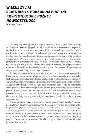 Więcej życia! Agata Bielik-Robson Na pustyni. Kryptoteologie późnej nowoczesności Mariusz Ferenc W swej najnowszej książce Agata Bielik-Robson po raz kolejny staje w obronie człowieka i jego kruchej, narażonej na bezsensowne cierpienie, troskę i nieuchronną śmierć egzystencji jako bezwzględnie istotnych kategorii dyskursywnych. Czyni to jednak za pomocą nowego w stosunku do swoich wcześniejszych tekstów instrumentarium pojęciowego. O ile bowiem wcześniejszy Duch powierzchni stanowił przykład możliwości wykorzystania perspektywy literaturoznawczej w celu określenia warunków i zasad, na jakich podmiot ludzki może być zrehabilitowany w nieprzyjaznym elemencie filozofii posthumanistycznej, o tyle w „Na pustyni”. Kryptoteologiach późnej nowoczesności sięga autorka po teologię. Należy zauważyć, że idzie przy tym pod prąd modzie – wszak teologia, ku której się zwraca, znacznie różni się do tej, w którą inwestują w ostatnich latach czołowi przedstawiciele lewicowej filozofii postsekularnej, dopatrujący się wybitnego teoriotwórczego potencjału w wybranych elementach chrześcijańskiej ortodoksji. Otóż teologia (lub kryptoteologia – oba te określenia funkcjonują w komentowanej książce niemal jako synonimy) proponowana przez Bielik-Robson jawnie dystansuje się od chrześcijaństwa i jego głównych idei, a skłania się zdecydowanie ku judaizmowi, który jest dla autorki Innej nowoczesności religią wzorcową (jeżeli nie jedyną godną tego miana). Tylko judaizm (wraz z szeregiem swoich gnostyckich wcieleń) dostarcza najlepszych narzędzi pojęciowych do opisu przykrego położenia ludzkiej istoty względem natury, jak również pozwala na sformułowanie strategii obronnych, przynoszących namiastkę zbawienia. W przekonaniu autorki to właśnie judaizm, odpowiednio witalistycznie zreinterpretowany, najlepiej służy poszukiwaniu środków zaradczych, które mogłyby zaleczyć głęboką ranę skończoności w podmiocie ludzkim, a przynajmniej dać nadzieję na jej niedefinitywność. / 248 StanRzeczy 1(1)/2011 Niemniej jednak teologia jako dyskurs stanowiący remedium na egzystencjalne wybrakowanie człowieka, który stanowi jądro postulowanego przez Bielik-Robson konsolacyjnego projektu, nie wyczerpuje przedmiotu jej zainteresowań. Otóż sporą część „Na pustyni” stanowi demaskowanie kryptoteologicznych milczących założeń teorii określających nieprzyjazne człowiekowi filozoficzne oblicze nowoczesności oraz interpretacja jawnie teologicznych (w tym głównie gnostyckich) wątków, obecnych u tych myślicieli, u których autorka Innej nowoczesności zadłuża się, formułując postulaty ocalającego człowieka radzenia sobie z marnością jego kondycji. Podąża ona tym samym tropem wyznaczonym przez Waltera Benjamina w Tezach o filozofii historii, który zaproponował widzenie materializmu historycznego jako kukły do sterowania, na którą idealnie nadaje się brzydki karzeł teologii. O ile jednak w paraboli Benjamina teologia miała gwarantować największe szanse na zwycięstwo materializmu historycznego w pojedynku szachowym z innymi filozofiami, o tyle w metodologicznej metaforze Bielik-Robson z usług teologii korzystają wszyscy. Jest to konsekwencją fundującego wszelki dyskurs wyboru, wynikającego z osadzenia podmiotu ludzkiego w nieredukowalnej „matrycy negatywności”. Człowiek, wedle autorki Ducha powierzchni, żyje w stanie oderwania od natury i separację tę postrzega jako bolesną ułomność – wieczny powrót tego samego i twarda, niedająca się przebić substancjalność bytu sprawiają, że doświadczenie skończoności określa człowieka w sposób istotowy. Ukoronowaniem ludzkiego wybrakowania jest zaś śmierć i radykalna perspektywa, którą ona wnosi, a mianowicie zagłady jednostki ludzkiej w jej jednostkowości. Dlatego należy dokonać wyboru, który w skrócie ogranicza się do dwóch reakcji na wszechmocną i beznadziejną negatywność. Ponieważ dotyczy on rzeczy ostatecznych, tj. życia i śmierci, według Bielik-Robson ma on naturę teologiczną i jako taki stanowi bazę dla dyskursu w nim zakotwiczonego. Wyjście pierwsze to pogodzenie się ze śmiercią, afirmacja negatywności, a tym samym kapitulacja, w ramach której życie poświęca samo siebie na ołtarzu bytu. Ten wybór jest dokonywany przez filozofię, którą autorka chce widzieć jako wyrafinowaną rehabilitację mitu w jego najbardziej konsekwentnej, surowej i nieprzejednanej postaci; mitu wyrażającego się w fetyszystycznym uwielbieniu, jakim ontoteologicznie nastawiona filozofia darzy kamienną konkretność nieporuszonej substancjalności, będącej modelową, a jednocześnie wrogą człowiekowi postacią bytu. Jednocześnie ta fascynacja, której ulegać ma filozofia, przenikana jest przez niejawny, acz trwały i konsekwentny podziw dla krańcowej negatywności nawet nie tyle podmiotu, ale bytu w ogóle. Czarnym jądrem StanRzeczy 1(1)/2011 / 249 nowoczesnej metafizyki dla Bielik-Robson jest skryty zachwyt nad nicością, która zdaje się być ostateczną i prymarną warstwą, z której wyłania się byt raczej w wyniku kosmicznej pomyłki niż racjonalnego zamiaru. I ta pulsująca otchłań nieskończonej nicości staje się przedmiotem stłumionych popędów filozofii. Dlatego też określa autorka wewnętrznie skonfliktowaną formację dyskursywną nowoczesnej filozofii jako religię śmierci, ucieleśniającą tryumf Tanatosa. Do rzeczników tej specyficznej kryptoteologii podbudowującej filozofię zalicza Bielik-Robson zarówno Hegla – zwłaszcza odczytanego przez Aleksandra Kojeve’a – jak również uczniów i spadkobierców ideowych tego ostatniego, czyli Georges’a Bataille’a, Maurice’a Blanchota, Jacques’a Derridę, Giorgia Agambena, Paula De Mana, a w końcu również Jacques’a Lacana i Martina Heideggera. W teoriach i systemach wymienionych filozofów, błyskotliwie omówi