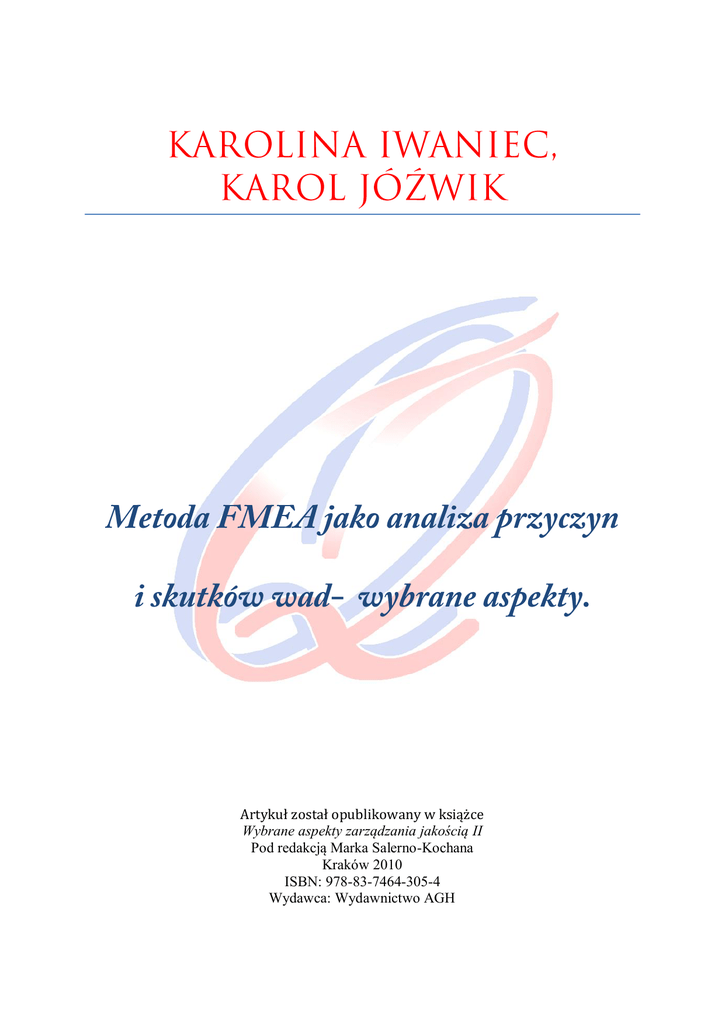 Artykuł został opublikowany w książce Wybrane aspekty zarządzania jakością II Pod redakcją Marka Salerno-Kochana Kraków 2010 ISBN: 978-83-7464-305-4 Wydawca: Wydawnictwo AGH Wstęp Początki stosowania analizy FMEA na świecie sięgają lat sześćdziesiątych XX wieku. Metodę, której pełna nazwa w języku angielskim brzmi Failure Mode and Effect Analysis, opracowano w USA w związku z realizacją amerykańskiego programu kosmicznego Apollo. Dzięki niej sprawdzano prawidłowość wykonania poszczególnych komponentów statków kosmicznych, w celu zapewnienia bezpieczeństwa załogom uczestniczącym w wyprawach. Po sukcesie, jaki omawiana metoda odniosła w NASA, przyszedł czas na jej wprowadzenie do innych gałęzi przemysłu. Począwszy od lat siedemdziesiątych XX wieku FMEA sukcesywnie znajduje zwolenników w Europie, w przemysłach elektronicznym, maszynowym, a przede wszystkim w samochodowym. Cele stosowania FMEA W nowoczesnym przedsiębiorstwie jakość uważana jest za priorytet. Stale dąży się do tego, aby produkowane wyroby były najwyższej jakości. Wśród różnego rodzaju narzędzi jakości, analiza FMEA pełni istotną rolę. Służy ona do systematycznego i kompleksowego wychwytywania potencjalnych błędów w projektowaniu i produkcji. Umożliwia ona poddanie wyrobu lub procesu kolejnym analizom, aby następnie w powiązaniu z uzyskanymi wynikami badań wprowadzić poprawki i nowe rozwiązania, eliminując źródła wad. Poprzez zastosowanie rozwiązań prewencyjnych, możliwe jest zapobiegnięcie wystąpienia niezgodności w przyszłości. Na szczególną uwagę zasługuje fakt, że właściwe stosowanie metody FMEA na etapie projektowania wyrobu i procesu pozwala istotnie zmniejszyć straty poprzez wykrycie wad przed rozpoczęciem produkcji. Wykorzystując wiedzę i doświadczenie pracowników z różnych działów organizacji metoda FMEA pomaga zidentyfikować obszary występowania potencjalnych błędów oraz zainicjować czynności redukujące te problemy. W celu poprawnego przeprowadzenia analizy FMEA, pracownicy zaangażowani w dany wyrób lub proces określają trzy liczby: prawdopodobieństwo wystąpienia przyczyny (LPW), znaczenie jej skutków z punktu widzenia klienta (LPZ), a także prawdopodobieństwo Koło Naukowe Zarządzania Jakością Katedra Zarządzania Jakością Uniwersytet Ekonomiczny w Krakowie knzj.uek.krakow.pl [email protected] 2 wykrycia przyczyny wady (LPO) [5]. Liczby te zawierają się w przedziale [1;10], i są podstawą do wyznaczenia liczby priorytetowej ryzyka (LPR), mieszczącej się w zakresie od 1 do 1000. Rodzaje FMEA Wyróżnia się dwa rodzaje analizy FMEA: FMEA Wyrobu FMEA Procesu FMEA wyrobu/konstrukcji. Przeprowadzana jest już podczas początkowych prac projektowych, celem uzyskania informacji o silnych i słabych punktach wyrobu, tak aby jeszcze przed podjęciem właściwych prac konstrukcyjnych możliwe było wprowadzenie zmian koncepcyjnych. Pomocą w identyfikacji słabych punktów wyrobu, które w czasie jego użytkowania prowadzić mogą do powstawania wad, są wnioski uzyskane podczas projektowania. Kluczowym aspektem na tym etapie jest zaangażowanie zespołu przeprowadzającego analizę. Wady wyrobu lub konstrukcji dotyczą najczęściej funkcji, które wyrób ma spełniać, łatwości naprawy w przypadku uszkodzenia, a także łatwości obsługi oraz niezawodności w czasie użytkowania. Przeprowadzenie FMEA wyrobu/konstrukcji zaleca się m.in. podczas wprowadzania na rynek nowego wyrobu, zastosowania nowych technologii, oraz podczas eksploatacji wyrobu w szczególnie trudnych warunkach. FMEA procesu. Stosowana jest w celu rozpoznania czynników mogących utrudniać spełnienie wymagań ujętych w specyfikacji konstrukcji, bądź dezorganizować przebieg procesu wytwarzania. Czynniki te mogą być powiązane z metodami obróbki, parametrami obróbki, środkami pomiarowo-kontrolnymi oraz maszynami. Przeprowadzenie FMEA procesu zaleca się podczas początkowej fazy projektowania procesów technologicznych, przed uruchomieniem produkcji seryjnej, oraz w produkcji seryjnej w celu doskonalenia procesów niestabilnych lub nie zapewniających uzyskania wymaganej wydajności [1]. Koło Naukowe Zarządzania Jakością Katedra Zarządzania Jakością Uniwersytet Ekonomiczny w Krakowie knzj.uek.krakow.pl [email protected] 3 Etapy przeprowadzania analizy FMEA Proces analizy FMEA obejmuje trzy etapy: przygotowania, przeprowadzenia właściwej analizy, oraz nadzorowania wprowadzonych działań zapobiegawczych. Etap pierwszy to powołanie zespołu mającego zająć się prowadzeniem analizy. Członkami zespołu zostają zazwyczaj przedstawiciele poszczególnych działów przedsiębiorstwa. Jeżeli zachodzi potrzeba, to w skład zespołu mogą wchodzić również użytkownicy wyrobu oraz eksperci. Pracownicy-członkowie zespołu muszą posiadać odpowiednie doświadczenie oraz umiejętność pracy w grupie. Zespołowi przewodzi koordynator. Zadania zespołu obejmują przygotowanie odpowiednich założeń oraz wybór podzespołów, będących przedmiotem analizy. Pracom zespołu powinno przewodzić podejście systemowe, ułatwiające prowadzenie analizy. „Określenie granic systemu i wyodrębnienie w nim stopni i liczby podsystemów powinno być jednym z pierwszych zadań pracy zespołu FMEA” [2, s.52]. Etap drugi to zasadnicza część FMEA. Analiza ta może zostać przeprowadzona zarówno dla wyrobu, pojedynczego podzespołu jak i dla całego procesu technologicznego. Zdefiniowanie potencjalnych wad rozpoczyna drugi etap analizy FMEA. Wady dotyczą działania podsystemu niższego rzędu zaś skutki z nich wynikłe do tyczą podsystemów wyższego rzędu. Przyczyn wystąpienia wad możemy szukać w całym wyrobie jak i w procesie technologicznym. „Po określeniu zależności ”przyczyna → wada → skutek” ocenia się każdą wadę liczbą całkowitą z przedziału (1,10) ze względu na określone kryteria