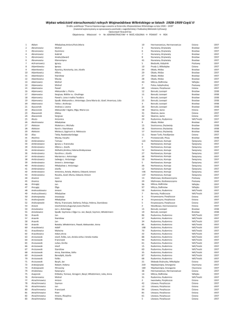 Wykaz właścicieli nieruchomości rolnych Województwa Wileńskiego w latach 1928-1939 Część II Źródło: publikacje "Pisarza hipotecznego zawarte w Dzienniku Województwa Wileńskiego za lata 1928 – 1939" (materiał wykorzystany w opracowaniu pochodzi z Jagiellońskiej i Podlaskiej Biblioteki Cyfrowej) Opracował: Ryszard Sys Objaśnienia: Właściciel → Nr. ADMINISTRACYJNY → WIEŚ, KOLONIA → POWIAT → ROK 1 2 3 4 5 6 7 8 9 10 11 12 13 14 15 16 17 18 19 20 21 22 23 24 25 26 27 28 29 30 31 32 33 34 35 36 37 38 39 40 41 42 43 44 45 46 47 48 49 50 51 52 53 54 55 56 57 58 59 60 61 62 63 64 65 66 67 68 69 70 71 72 73 74 75 76 77 78 79 80 81 82 83 Ablam Abramowicz Abramowicz Abramowicz Abramowicz Abramowicz Achramowicz Adamkiewicz Adamkowicz Adamkowicz Adamkowicz Adamkowicz Adamowicz Adamowicz Adamowicz Adamowicz Adamowicz Adamowicz Adamowicz Adamowicz Ajuczonok Akaczonok Akaczonok Akaczonok Akuto Alechnowicz Aleksion Aleksion Aleksion Alisz Alochno Ambrożewicz Ambrożewicz Ambrożewicz Ambrożewicz Ambrożewicz Ambrożewicz Ambrożewicz Ambrożewicz Ambrożewicz Ambrożewicz Ambrożewicz Ambrożewicz Ananicz Ananicz Ancugaj Ancugaj Andruszkiewicz Andruszkiewicz Andrzejewska Andrzejewski Andrzejewski Anieck Aniszkowicz Aniszkowicz Arasnik Arasnik Arasnik Arasnik Araszkiewicz Araszkiewicz Araszkiewicz Arciszewski Arciszewski Arciszewski Arciszewski Arciszewski Arciszewski Arciszewski Arciszewski Arciszewski Ardziejewski Ardziejewski Arlukieiwcz Asajonok Atmienowicz Atrachimowicz Atrachimowicz Atrachimowicz Atrachimowicz Atrachimowicz Atrachimowicz Atrachimowicz Władysław,Antoni,Piotr,Maria Michał Kazimierz Gabriel Aniela,Edward Klementyna Ignacy Ignacy Dyonizy, Konstanty, Jan, Józefa Alfons Stanisław Maciej Michał Michał Paweł Aleksander s. Piotra Sergiusz, Nikifor ss.. Onufrego Paweł s. Jana i matka Teodora Spadk. Aleksandra s. Antoniego. Zona Maria dz. Józef, Arseniusz, Lida Tekla c. Andrzeja Andrzej s. Leona Aleksander I Agata, Olga, Maria Los Aleksy Sergiusz Antonina Władysław Walerian s. Michała Karol s. Stanisława Mateusz, Zygmunt ss. Mateusza Tekla, Nadzieżda Kolaga Maciej, Cecylia Tomasz Ignacy s. Franciszka Albina c. Józefa Wilhelm,Emilina, Helena Drobyszowa Karolina c. Józefa Marianna c. Antoniego Jadwiga c. Antoniego Antoni s. Antoniego Władysław s. Antoniego Józefa Antonina, Aniela, Waleria, Edward, Antoni Rozalia, Józef, Maria, Edward, Antoni Leon Apanas Jan Olga Antoni Władysław Anastazja Władysław Maria, Franciszek, Stefania, Felicja, Helena, Stanisława Józef,Antoni,Augustyn,Leon,Paulina Jan s. Antoniego Spadk. Szymona z Olga I ss. Jan, Bazyli, Szymon, Włodzimierz Jan Stanisław Jan Natalia, Włodzimierz, Paweł, Aleksander, Anna Adolf Malwina Adam,Anna Józef, Feliks, Jan, Aniela córka i Aniela matka Franciszek Julian, Emilia Józef Stanisław Anna, Stanisław, Zofia Benedykt, Józefa Feliks Bazyli, Jan Robert, Helena Wincenty Katarzyna Elżbieta, Tomasz, Grzegorz ,Bazyl, Włodzimierz, Julia, Anna Michał Antoni Szymon Jan Franciszek Piotr Antoni, Wasylina Mikołaj 10 3 6 7 8 41 5 10 24 29 27 28 43 7 69 12 11 5 25 3 26 18 31 42 29 9 15 16 17 11 7 115 6 3 72 27 28 10 5 26 12 136 137 13 29 96 97 59 7 3 4 5 2 15 19 86 37 34 85 108 70 22 88 94 61 15 60 35 87 68 21 219 169 38 14 31 2 42 13 94 81 61 5 Hermanowicze, Hermanowicze Nurwiany, Dryświaty Nurwiany, Dryświaty Nurwiany, Dryświaty Nurwiany, Dryświaty Nurwiany, Dryświaty Biedunki, Kobylnik Prudy 1, Mikołajów Obale, Widze Obale, Widze Obale, Widze Obale, Widze Milcza, Dołhinów Polce, kobylinckiej Litowce, Porpliszcze Borsuki, Leonpol Borsuki, Leonpol Borsuki, Leonpol Borsuki, Leonpol Borsuki, Leonpol Borsuki, Leonpol Skwirce, Jazno Skwirce, Jazno Skwirce, Jazno Rudomino, Rudomino Obale, Widze Siostrzence, Dryświaty Siostrzence, Dryświaty Siostrzence, Dryświaty Nowe Turki, Parafjanów Preświaciszki, Plusy Norkiewicze, Komaje Norkiewicze, Komaje Norkiewicze, Komaje Norkiewicze, Komaje Norkiewicze, Komaje Norkiewicze, Komaje Norkiewicze, Komaje Norkiewicze, Komaje Norkiewicze, Komaje Norkiewicze, Komaje Norkiewicze, Komaje Norkiewicze, Komaje Malinowo, Kozłowszczyzna Malinowo, Kozłowszczyzna Milcza, Dołhinów Milcza, Dołhinów Rudomino, Rudomino Bernaty, Podbrzezie Krzywoszyno, Porpliszcze Krzywoszyno, Porpliszcze Krzywoszyno, Porpliszcze Wasilkowo, Hermanowicze Borsuki, Leonpol Borsuki, Leonpol Rudomino, Rudomino Rudomino, Rudomino Rudomino, Rudomino Rudomino, Rudomino Rudomino, Rudomino Rudomino, Rudomino Rudomino, Rudomino Rudomino, Rudomino Rudomino, Rudomino Rudomino, Rudomino Rudomino, Rudomino Rudomino, Rudomino Rudomino, Rudomino Rudomino, Rudomino Rudomino, Rudomino Słoboda Dryhucka, Mikołajów Węsławinięta, Smorgonie Węsławinięta, Smorgonie Hermanowicze, Hermanowicze Milcza, Dołhinów Rudomino, Rudomino Iwanówka, Porpliszcze Litowce, Porpliszcze Litowce, Porpliszcze Litowce, Porpliszcze Litowce, Porpliszcze Litowce, Porpliszcze Litowce, Porpliszcze Dzisna Brasław Brasław Brasław Brasław Brasław Postawy Dzisna Brasław Brasław Brasław Brasław Wilejka Postawy Dzisna Brasław Brasław Brasław Brasław Brasław Brasław Dzisna Dzisna Dzisna Wil/Trocki Brasław Brasław Brasław Brasław Dzisna Brasław Święciany Święciany Święciany Święciany Święciany Święciany Święciany Święciany Święciany Święciany Święciany Święciany Postawy Postawy Wilejka Wilejka Wil/Trocki Wil/Trocki Dzisna Dzisna Dzisna Dzisna Brasław Brasław Wil/Trocki Wil/Trocki Wil/Trocki Wil/Trocki Wil/Trocki Wil/Trocki Wil/Trocki Wil/Trocki Wil/Trocki Wil/Trocki Wil/Trocki Wil/Trocki Wil/Trocki Wil/Trocki Wil/Trocki Dzisna Oszmiana Oszmiana Dzisna Wilejka Wil/Trocki Dzisna Dzisna Dzisna Dzisna Dzisna Dzisna Dzisna 1937 1937 1937 1937 1937 1937 1937 1937 1937 1937 1937 1937 1937 1937 1937 1938 1938 1938 1938 1938 1938 1937 1937 1937 1937 1937 1938 1938 1938 1937 1938 1937 1937 1937 1937 1937 1937 1937 1937 1937 1937 1937 1937 1937 1937 1937 1937 1937 1937 1937 1