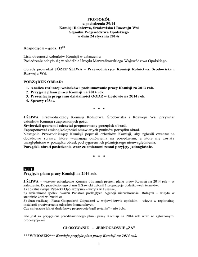 PROTOKÓŁ z posiedzenia 39/14 Komisji Rolnictwa, Środowiska i Rozwoju Wsi Sejmiku Województwa Opolskiego w dniu 24 stycznia 2014r. Rozpoczęcie – godz. 1300 Lista obecności członków Komisji w załączeniu Posiedzenie odbyło się w siedzibie Urzędu Marszałkowskiego Województwa Opolskiego. Obrady prowadził JÓZEF ŚLIWA – Przewodniczący Komisji Rolnictwa, Środowiska i Rozwoju Wsi. PORZĄDEK OBRAD: 1. 2. 3. 4. Analiza realizacji wniosków i podsumowanie pracy Komisji za 2013 rok. Przyjęcie planu pracy Komisji na 2014 rok. Prezentacja programu działalności OODR w Łosiowie na 2014 rok. Sprawy róŜne. * * * J.ŚLIWA, Przewodniczący Komisji Rolnictwa, Środowiska i Rozwoju Wsi przywitał członków Komisji i zaproszonych gości. Stwierdził quorum i odczytał proponowany porządek obrad. Zaproponował zmianę kolejności omawianych punktów porządku obrad. Następnie Przewodniczący Komisji poprosił członków Komisji, aby zgłosili ewentualne dodatkowe sprawy, które wymagają omówienia na posiedzeniu, a które nie zostały uwzględnione w porządku obrad, pod rygorem ich późniejszego nieuwzględnienia. Porządek obrad posiedzenia wraz ze zmianami został przyjęty jednogłośnie. * * * Ad. 1. Przyjęcie planu pracy Komisji na 2014 rok. J.ŚŁIWA – wszyscy członkowie Komisji otrzymali projekt planu pracy Komisji na 2014 rok – w załączeniu. Do przedłoŜonego planu G.Sawicki zgłosił 3 propozycje dodatkowych tematów: 1) Lokalna Grupa Rybacka Opolszczyzna – wizyta w Turawie, 2) Działalność spółek Skarbu Państwa podległych Agencji nieruchomości Rolnych – wizyta w stadninie koni w Prudniku 3) Stan realizacji Planu Gospodarki Odpadami w województwie opolskim – wizyta w regionalnej instalacji przetwarzania odpadów komunalnych. Czy są jeszcze jakieś dodatkowe propozycje bądź pytania? – nie było. Kto jest za przyjęciem przedstawionego planu pracy Komisji na 2014 rok wraz ze zgłoszonymi propozycjami? GŁOSOWANIE – JEDNOGŁOŚNIE „ZA” ***WNIOSEK*** Komisja przyjęła plan pracy Komisji na 2014 rok. 1 Ad. 2. Analiza realizacji wniosków i podsumowanie pracy Komisji za 2013 rok. J.ŚLIWA – wszyscy członkowie Komisji otrzymali stosowny materiał obejmujący wszystkie zgłoszone przez komisje wnioski – w załączeniu. Jest tam nasz wniosek do ZWO, w którym zwracaliśmy się o zabezpieczenie w budŜecie Województwa kwoty 150tys. zł z przeznaczeniem na wsparcie PDO, poszerzając to o pewne odmiany soi, nad którą zakres prac jest coraz większy. We wrześniu byłem na takim podsumowującym spotkaniu w Głubczycach i w tej chwili są juŜ nie tylko odmiany ukraińskie, ale teŜ odmiany niemiecko-austriackie – w związku z tym, Ŝe Austriacy wykupili pakiet kontrolny Centrali Nasiennej Środa Śląska. Oni tam ostro idą takŜe z soją i w tym roku ponad 200ha pod samo nasiennictwo, 4 odmiany chcą zasiać. Jak wiemy w budŜecie zrealizowano 50tys. zł. TakŜe ten wniosek został częściowo zrealizowany. Co prawda dyskutując o tym na etapie składania wniosku wiedzieliśmy, Ŝe będą jakieś cięcia i stąd te 150tys., ale wydaje mi się, Ŝe poprzednie lata oprócz roku 2012 wszystko oscylowało wokół 120tys. Zaś ostatnio mamy tendencję malejącą. G.SAWICKI (członek Komisji) – taka uwaga ogólna – z tego zestawienia wynika, Ŝe Komisja była aktywna przez cały rok. J.ŚLIWA – niech inni nas ocenią. Czy są jakieś uwagi bądź pytania? – nie było. Dziękuję. Ad. 3. Prezentacja programu działalności OODR w Łosiowie na 2014 rok. H.ZAMOJSKI (dyrektor OODR w Łosiowie) – omówił program działalności OODR na 2014 rok – w załączeniu. J.ŚLIWA – kiedy będą załoŜenia finansowe do omawianego dokumentu? H.ZAMOJSKI – załoŜenia juŜ są. J.ŚLIWA – to proszę teŜ skomentować finisz 2013 roku związany z zabraniem tych pieniędzy z dotacji. H.ZAMOJSKI – w takim razie zacznę od omówienia sprawozdania finansowego za 2013 rok – w załączeniu. Musieliśmy dokonać korekty planu, w którym było 140tys. zł więcej. To zostało skorygowane. J.ŚŁIWA – a gdzie jest ta róŜnica od tego co miało być od wojewody? H.ZAMOJSKI – to ta korekta planu i tu juŜ tego nie ma. Pierwotnie było 4,906 i to jest w wyjaśnieniu podane. J.ŚLIWA – czy jednostka się odwoływała? H.ZAMOJSKI – a do kogo skoro jednostka została postawiona przed faktem dokonanym. J.ŚLIWA – to jakie uzasadnienie miał wojewoda? śe mu kazali? H.ZAMOJSKI – tak. Historycznie – 23 lipca zostałem poinformowany, Ŝe nam zmniejszają o 723tys., ale to juŜ trzeba byłoby zamknąć Ośrodek. Ale rzeczywiście odwołaliśmy się i powiedzieliśmy, Ŝe de facto Ośrodek juŜ traci płynność, w związku z tym trochę odpuszczono. Mimo wszystko 4 listopada dostaliśmy decyzję właściwie bez moŜliwości odwołania się, w której podano nam, Ŝe 140tys. zabierają. 2 W.KRYNIEWSKI (dyrektor Departamentu Rolnictwa i Rozwoju Wsi) – to była odgórna decyzja o korekcie, Ŝe w ramach oszczędności budŜetowych tutaj się obcina. J.ŚLIWA – a jak to wygląda na 2014 rok? H.ZAMOJSKI – w 2014 roku trochę odetchnę, poniewaŜ przejął nas Minister Rolnictwa i w związku z tym trzeba powiedzieć, Ŝe zaczyna się to trochę spokojniej odbywać. Dostajemy tą kwotę, którą mieliśmy w 2013 roku czyli 4,906mln i nie będzie Ŝadnych cięć. J.ŚLIWA – i tak zmuszają do szukania oszczędności. H.ZAMOJSKI – ale nie w ODR-ach. Wynik finansowy zamyka się nam kwotą minus 127tys. zł. i to jest to co nas w tym roku spotkało. Szkoda, Ŝe do wyszło w listopadzie, bo gdybyśmy o tym wiedzieli na początku roku, to byśmy do tego inaczej podeszli. J.ŚLIWA – skoro dotacja na 2014 będzie na tym samym poziomie, to czy inne przychody szacujecie, planujecie większe czy na tym samym poziomie? H.ZAMOJSKI – planujemy ostroŜnie na tym samym poziomie. TeŜ widzę, Ŝe zaczyna się coś w tym zakresie dziać i generalnie rów