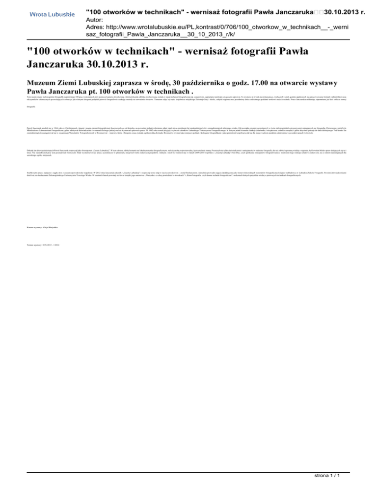 "100 otworków w technikach" - wernisaż fotografii Pawła Janczaruka 30.10.2013 r. Autor: Adres: http://www.wrotalubuskie.eu/PL,kontrast/0/706/100_otworkow_w_technikach__-_werni saz_fotografii_Pawla_Janczaruka__30_10_2013_r/k/ "100 otworków w technikach" - wernisaż fotografii Pawła Janczaruka 30.10.2013 r. Muzeum Ziemi Lubuskiej zaprasza w środę, 30 października o godz. 17.00 na otwarcie wystawy Pawła Janczaruka pt. 100 otworków w technikach . Tym razem znany zielonogórski fotografik zaprezentuje 100 prac wykonanych przy pomocy kamery otworkowej, z których każda odbitka zrealizowana została w innej technice fotograficznej np. cyjanotypii, cuprutypii, kalotypii czy pauzie sepiowej. Ta wystawa to wynik mozolnej pracy, wielu prób i setek godzin spędzonych na opracowywaniu formuły i identyfikowaniu odczynników chemicznych pozwalających zobaczyć jak różnymi drogami podążali pierwsi fotografowie szukając metody na utrwalenie obrazów. Tematem zdjęć są wątki krajobrazu miejskiego Zielonej Góry i okolic, zabytki regionu oraz przedmioty dnia codziennego poddane urokowi starych technik. Prace Janczaruka odsłaniają zapomniane już dziś oblicze tamtej fotografii. Paweł Janczaruk urodził się w 1964 roku w Chobienicach. Aparat i magia ciemni fotograficznej fascynowały go od dziecka, na poważnie jednak robieniem zdjęć zajął się na przełomie lat siedemdziesiątych i osiemdziesiątych ubiegłego wieku. Od początku czynnie uczestniczył w życiu zielonogórskich stowarzyszeń zajmujących się fotografią. Pierwszym z nich było Młodzieżowe Laboratorium Fotograficzne, gdzie zdobywał doświadczenie i w ramach którego pokazywał na wystawach pierwsze prace. W 1982 roku został przyjęty w poczet członków Lubuskiego Towarzystwa Fotograficznego, w którym pełnił rozmaite funkcje (skarbnika, wiceprezesa, członka zarządu) i gdzie aktywnie pracuje do dnia dzisiejszego. Pod koniec lat osiemdziesiątych zaangażował się w organizację Warsztatów Fotograficznych w Broniszowie – imprezy, która z biegiem czasu zyskała ogólnopolską formułę. Broniszów również jako miejsce spotkań z kolegami fotografikami i jako przestrzeń krajobrazu stał się dla niego ważnym punktem odniesienia w poszukiwaniach twórczych. Dekadę lat dziewięćdziesiątych Paweł Janczaruk rozpoczął jako fotoreporter „Gazety Lubuskiej”. W tym okresie zdobył uznanie na lokalnym rynku fotograficznym, stał się osobą rozpoznawalną i powszechnie znaną. Poszerzył nie tylko doświadczenie i umiejętności w zakresie fotografii, ale też zdobył ogromną wiedzę o regionie, był bowiem blisko spraw dziejących się tu i teraz. Nie zaniedbywał przy tym poszukiwań twórczych. Stale wystawiał swoje prace, uczestniczył w plenerach, inicjował wiele ciekawych projektów. Jednym z nich był realizowany w latach 2009-2010 wspólnie z „Gazetą Lubuską” Foto Day, czyli spotkania entuzjastów fotografowania z mistrzami tego rodzaju sztuki w ciekawych, na co dzień niedostępnych dla szerokiego ogółu, miejscach. Szybki rytm pracy, napięcie i ciągły stres z czasem spowodowały wypalenie. W 2012 roku Janczaruk odszedł z „Gazety Lubuskiej” i rozpoczął nowy etap w życiu zawodowym – został freelancerem. Aktualnie prowadzi zajęcia dydaktyczne jako trener różnorodnych warsztatów fotograficznych i jako wykładowca w Lubuskiej Szkole Fotografii. Swoimi doświadczeniami dzieli się ze słuchaczami Zielonogórskiego Uniwersytetu Trzeciego Wieku. W ostatnich latach powstały też dwie książki jego autorstwa: „Wszystko, co chcę powiedzieć o otworkach” i „RetroFotografia, czyli dawne techniki fotograficzne”, na kartach których przybliża wiedzę o pierwszych technikach fotograficznych. Kurator wystawy: Alicja Błażyńska Termin wystawy: 30 X 2013 – I 2014 strona 1 / 1 Powered by TCPDF (www.tcpdf.org)