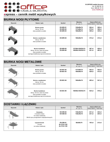 10 OFFICE meble biurowe tel. 22 280 90 10 kom. 885 80 10 10 www.10office.pl express – cennik mebli wysyłkowych BIURKA NOGI PŁYTOWE Rysunek Nazwa i opis Symbol Wymiary dł. x gł. x h Cena w PLN netto kolory stand. kolor klon Biurko proste blat gr. 25 mm dwie przelotki na kable EX-BR-01 EX-BR-02 EX-BR-03 120x68x74 137x68x74 160x68x74 264 zł 279 zł 309 zł 290 zł 308 zł 339 zł Biurko z zaobleniem blat gr. 25 mm dwie przelotki na kable EX-BR-04 160x68x74 374 zł 412 zł Biurko kształtowe blat gr. 25 mm, lewe lub prawe dwie przelotki na kable wymaga dodatkowej nogi lub kontenera EX-BR-05 EX-BR-06 137/68x100/55x74 160/68x100/55x74 387 zł 421 zł 426 zł 463 zł Nazwa i opis Symbol Wymiary dł. x gł. x h Biurko proste blat gr. 25 mm dwie przelotki na kable EX-BC-02 EX-BC-03 137x68x74 160x68x74 403 zł 429 zł 443 zł 472 zł Biurko z zaobleniem blat gr. 25 mm dwie przelotki na kable EX-BC-04 160x68x74 492 zł 541 zł Biurko kształtowe blat gr. 25 mm, lewe lub prawe dwie przelotki na kable wymaga dodatkowej nogi lub kontenera EX-BC-06 160/68x100/55x74 525 zł 578 zł Nazwa i opis Symbol Wymiary dł. x gł. x h Dostawka o kształcie elipsy na nodze metalowej DB-03 (przy przegrodach międzybiurkowych) EX-DB-02 EX-DB-03 136x40x74 138x40x74 231 zł 231 zł 254 zł 254 zł Łącznik biurek 1/4 koła na nodze metalowej EX-DB-01 AL-PLK-120 AL-PLK-140 68x68x74 193 zł 212 zł BIURKA NOGI METALOWE Rysunek Cena w PLN netto kolory stand. kolor klon DOSTAWKI I ŁĄCZNIKI Rysunek Cena w PLN netto kolory stand. kolor klon STOŁY KONFERENCYJNE Rysunek Nazwa i opis Symbol Wymiary dł. x gł. x h Cena w PLN netto kolory stand. kolor klon Stół prosty na nogach metalowych blat gr. 25 mm EX-BK-01 EXBK-02 80x80x74 140x80x74 Nazwa i opis Symbol Wymiary dł. x gł. x h Kontener jezdny na kółkach, z 3 szufladami z zamkiem centralnym EX-KM-01 43x54x60 418 zł 460 zł Kontener stacjonarny dostawiany z szufladą i drzwiami z zamkami wymaga dokupienia pokrywy EX-KS-01 43x54x72 330 zł 362 zł Pokrywa do kontenera stacjonarnego o gr. 25 mm przedłużająca biurko kształtowe EX-PK-01 EX-PK-02 EX-PK-03 43x68 43x55 43x69 65 zł 65 zł 65 zł 71 zł 71 zł 71 zł Nazwa i opis Symbol Wymiary dł. x h Przegroda miedzybiurkowa przyczepiana do biurka EX-PG-02 EX-PG-03 137x54,5 160x54,5 Tablica tapicerowana przyklejana na panel w dwóch kolorach: beżowy lub ciemnoszary EX-PB-01 EX-PB-02 48x30 78x30 58 zł 79 zł Nazwa i opis Symbol Wymiary dł. x gł. x h Cena w PLN netto Noga metalowa do biurka kształtowego jeśli nie będzie miał kontenera dostawianego kolor kwarc EX-NG-01 - 71 zł Listwa zasilająca pod blat biurka EX-PZ-01 - 49 zł Klipsy plastikowe do przytwierdzenia kabli w komplecie 4 sztuki EX-SK-01 - 26 zł 395 zł 479 zł 435 zł 527 zł POMOCNIKI Rysunek Cena w PLN netto kolory stand. kolor klon PRZEGRODY MIEDZYBIURKOWE Rysunek Cena w PLN netto kolory stand. kolor klon 155 zł 168 zł 171 zł 185 zł AKCESORIA DODATKOWE Rysunek REGAŁY Nazwa i opis Symbol Wymiary dł. x gł. x h Regał otwarty wysoki 5 prześwitów na segregatory EX-RG-01 EX-RG-03 80x35x181,3 60x35x181,3 352 zł 313 zł 388 zł 344 zł Regał otwarty średni 3 prześwity na segregatory EX-RG-02 80x35x112,1 248 zł 273 zł Regał otwarty niski 2 prześwity na segregatory EX-RG-04 80x35x76,9 204 zł 224 zł Nazwa i opis Symbol Wymiary dł. x h Drzwi wysokie 80 do regału 5 prześwitowego dł. 80 cm z zamkiem EX-DR-01 80x173,8 209 zł 230 zł Drzwi średnie 80 do regału 5 lub 3 prześwitowego dł. 80 cm z zamkiem EX-DR-02 80x104,6 147 zł 162 zł Drzwi niskie 80 do regału 5,3 lub 2 prześwitowego dł. 80 cm z zamkiem EX-DR-04 80x69,4 122 zł 134 zł Drzwi wysokie 60 do regału 5 prześwitowego dł. 60 cm z zamkiem jednoskrzydłowe prawe EX-DR-03R 60x173,8 137 zł 150 zł Nazwa i opis Symbol Wymiary dł. x gł. x h Szafa ubraniowa z drążkiem na wieszaki wysuwanym drzwi w standardzie jednoskrzydłowe prawe EX-SU-01R 60x35x181,3 Rysunek Cena w PLN netto kolory stand. kolor klon DRZWICZKI DO REGAŁÓW Rysunek Cena w PLN netto kolory stand. kolor klon SZAFA UBRANIOWA Rysunek Cena w PLN netto kolory stand. kolor klon 434 zł 477 zł KOSZTY DOSTAWY KURIEREM Rysunek Nazwa i opis Regiony Cena w PLN netto Dostawa kurier Schenker bez wniesienia meble do samodzielnego, prostego montażu Kraków-Kielce-Rzeszów-Przemyśl Katowice-Łódź-Warszawa-Lublin Wrocław-Poznań-Olsztyn-Białystok Szczecin-Koszalin-Gdańsk-Suwałki 50 zł 75 zł 100 zł 120 zł Przy zamówieniu powyżej 1500 zł netto – DOSTAWA GRATIS (można łączyć z krzesłami z oferty express)