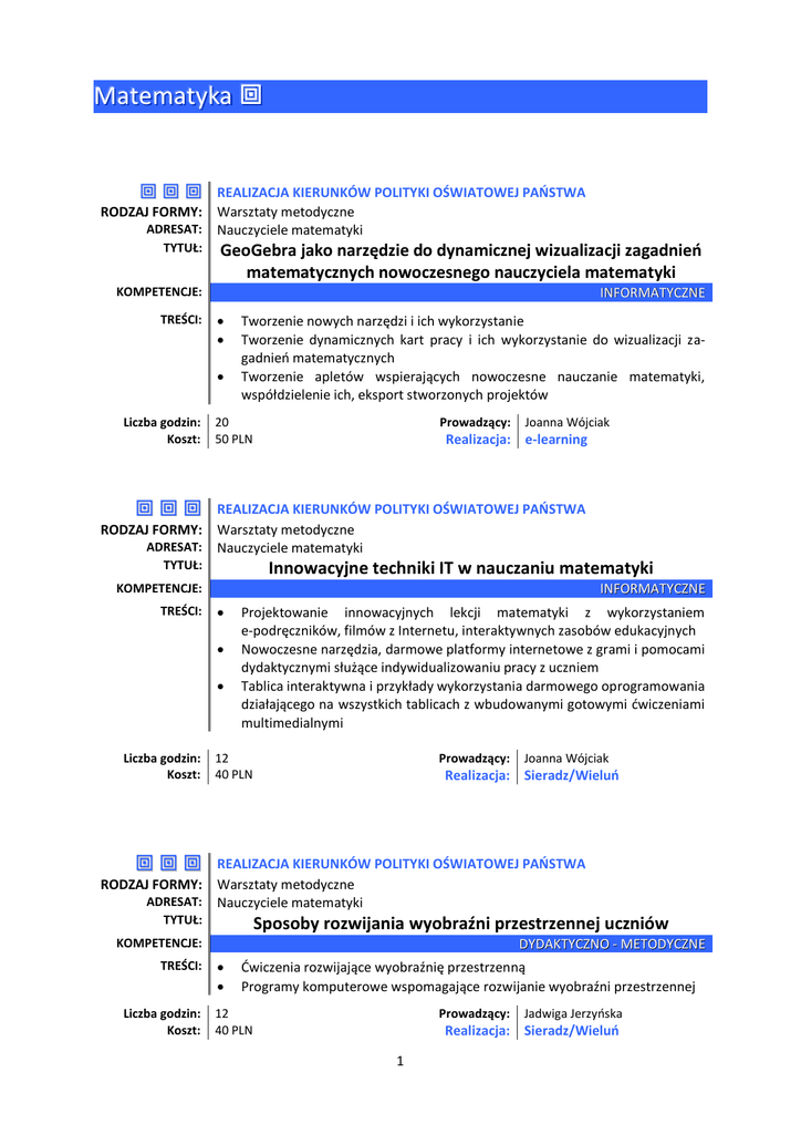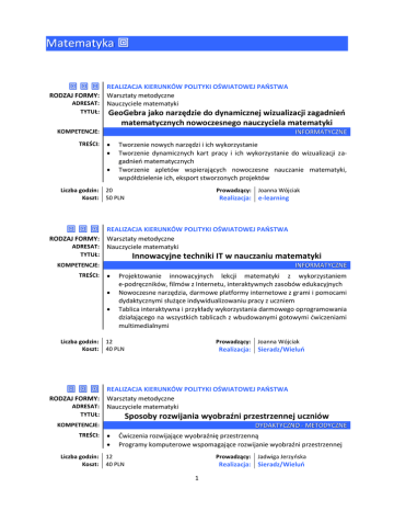 M Maatteem maattyykkaa RODZAJ FORMY: ADRESAT: TYTUŁ: REALIZACJA KIERUNKÓW POLITYKI OŚWIATOWEJ PAŃSTWA Warsztaty metodyczne Nauczyciele matematyki GeoGebra jako narzędzie do dynamicznej wizualizacji zagadnień matematycznych nowoczesnego nauczyciela matematyki KOMPETENCJE: TREŚCI: INFORMATYCZNE Liczba godzin: Koszt: RODZAJ FORMY: ADRESAT: TYTUŁ: Tworzenie nowych narzędzi i ich wykorzystanie Tworzenie dynamicznych kart pracy i ich wykorzystanie do wizualizacji zagadnień matematycznych Tworzenie apletów wspierających nowoczesne nauczanie matematyki, współdzielenie ich, eksport stworzonych projektów 20 50 PLN Prowadzący: Joanna Wójciak Realizacja: e-learning REALIZACJA KIERUNKÓW POLITYKI OŚWIATOWEJ PAŃSTWA Warsztaty metodyczne Nauczyciele matematyki Innowacyjne techniki IT w nauczaniu matematyki KOMPETENCJE: TREŚCI: INFORMATYCZNE Liczba godzin: Koszt: RODZAJ FORMY: ADRESAT: TYTUŁ: Projektowanie innowacyjnych lekcji matematyki z wykorzystaniem e-podręczników, filmów z Internetu, interaktywnych zasobów edukacyjnych Nowoczesne narzędzia, darmowe platformy internetowe z grami i pomocami dydaktycznymi służące indywidualizowaniu pracy z uczniem Tablica interaktywna i przykłady wykorzystania darmowego oprogramowania działającego na wszystkich tablicach z wbudowanymi gotowymi ćwiczeniami multimedialnymi 12 40 PLN Prowadzący: REALIZACJA KIERUNKÓW POLITYKI OŚWIATOWEJ PAŃSTWA Warsztaty metodyczne Nauczyciele matematyki Sposoby rozwijania wyobraźni przestrzennej uczniów KOMPETENCJE: TREŚCI: Liczba godzin: Koszt: Joanna Wójciak Realizacja: Sieradz/Wieluń DYDAKTYCZNO - METODYCZNE Ćwiczenia rozwijające wyobraźnię przestrzenną Programy komputerowe wspomagające rozwijanie wyobraźni przestrzennej 12 40 PLN Prowadzący: Jadwiga Jerzyńska Realizacja: Sieradz/Wieluń 1 RODZAJ FORMY: ADRESAT: TYTUŁ: Warsztaty metodyczne Nauczyciele matematyki Jak uczyć uczniów uczenia się matematyki? KOMPETENCJE: TREŚCI: Liczba godzin: Koszt: DYDAKTYCZNO - METODYCZNE Techniki nauczania i uczenia się Internet i programy komputerowe sposobem na wspomaganie uczniów w uczeniu się matematyki 12 40 PLN Prowadzący: Jadwiga Jerzyńska Realizacja: Sieradz/Wieluń RODZAJ FORMY: ADRESAT: TYTUŁ: Warsztaty metodyczne Nauczyciele matematyki Doświadczenia na matematyce sposobem na rozwijanie twórczego myślenia KOMPETENCJE: TREŚCI: Liczba godzin: Koszt: RODZAJ FORMY: ADRESAT: TYTUŁ: DYDAKTYCZNO - METODYCZNE Jak zmienić „zwykłą” lekcję w lekcję doświadczalną? Przykładowe doświadczenia na matematyce 6 30 PLN Prowadzący: REALIZACJA KIERUNKÓW POLITYKI OŚWIATOWEJ PAŃSTWA Seminarium Nauczyciele matematyki Sztuka zadawania pytań stymulujących rozwój myślenia matematycznego KOMPETENCJE: TREŚCI: Liczba godzin: Koszt: RODZAJ FORMY: ADRESAT: TYTUŁ: DYDAKTYCZNO - METODYCZNE Stymulowanie rozwoju inteligencji logiczno – matematycznej Techniki zadawania pytań pobudzających kreatywne myślenie 6 Forma bezpłatna Prowadzący: Liczba godzin: Koszt: Jadwiga Jerzyńska Realizacja: Sieradz/Wieluń REALIZACJA KIERUNKÓW POLITYKI OŚWIATOWEJ PAŃSTWA Seminarium Nauczyciele matematyki Zasoby Internetowe wspomagające nauczyciela matematyki KOMPETENCJE: TREŚCI: Jadwiga Jerzyńska Realizacja: Sieradz/Wieluń DYDAKTYCZNO - METODYCZNE Strony Internetowe przydatne w nauczaniu matematyki Przykładowe scenariusze lekcji z wykorzystaniem Internetu 6 Forma bezpłatna Prowadzący: Jadwiga Jerzyńska Realizacja: Sieradz/Wieluń 2 RODZAJ FORMY: ADRESAT: TYTUŁ: REALIZACJA KIERUNKÓW POLITYKI OŚWIATOWEJ PAŃSTWA Seminarium Nauczyciele matematyki klas IV – VI Jak skutecznie i ciekawie przy pomocy nowoczesnych narzędzi, uczyć matematyki w klasach IV – VI? KOMPETENCJE: TREŚCI: INFROMATYCZNE Liczba godzin: Koszt: Metody pracy z uczniem uatrakcyjniające nauczanie matematyki i rozbudzające zainteresowanie ucznia matematyką Nowoczesne narzędzia, darmowe platformy internetowe z grami i pomocami dydaktycznymi służące indywidualizowaniu pracy z uczniem oraz likwidowaniu problemów w uczeniu się matematyki na obecnym i dalszych poziomach edukacyjnych 6 Forma bezpłatna Prowadzący: Joanna Wójciak Realizacja: Sieradz/Wieluń 3