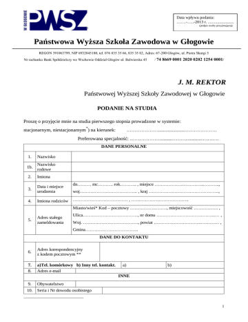 Data wpływu podania: …….-…..-2013 r. ......................... (podpis osoby przyjmującej) 1 Państwowa Wyższa Szkoła Zawodowa w Głogowie REGON 391063799, NIP 6932045180, tel. 076 835 35 66, 835 35 82, Adres: 67-200 Głogów, ul. Piotra Skargi 5 Nr rachunku Bank Spółdzielczy we Wschowie Oddział Głogów ul. Balwierska 45 / 74 8669 0001 2020 0202 1254 0001/ J. M. REKTOR Państwowej Wyższej Szkoły Zawodowej w Głogowie PODANIE NA STUDIA Proszę o przyjęcie mnie na studia pierwszego stopnia prowadzone w systemie: * stacjonarnym, niestacjonarnym ) na kierunek: .………………......................………………. Preferowana specjalność: .……………….........………...........…….…. DANE PERSONALNE 1. Nazwisko 1b. Nazwisko rodowe 2. Imiona 3. Data i miejsce urodzenia 4. Imiona rodziców ……………………………… , ……………………………….. dn……… mc………. rok……….. , miejsce …………………………..……….., woj……………………………….. , kraj ………………………………………., Miasto/wieś* Kod – pocztowy ……………………, miejscowość ……………. , 5. Adres stałego zameldowania Ulica………………………………, nr domu ………………………………...… , Woj. ………………………………, powiat ………………………….………… , Gmina…………………………….. DANE DO KONTAKTU 6. Adres korespondencyjny z kodem pocztowym ** 7. 8. a)Tel. komórkowy b) Inny tel. kontakt. Adres e-mail a) b) INNE 9. Obywatelstwo 10. Seria i Nr dowodu osobistego 1 11. Nr PESEL INFORAMACJE DOTYCZĄCE UKOŃCZENIA SZKOŁY ŚREDNIEJ Ukończyłem/am szkołę średnią /uczelnię: Nazwa szkoły…………………………................................................................................................., 12. Adres…………………………………………..................................................................................... Rok ukończenia ……………………. . 13. 14. Rodzaj i stopień niepełnosprawności ***)……………………………………………………………, Czy kandydat jest laureatem/finalistą olimpiady przedmiotowej? TAK (dołączyć zaświadczenia), NIE*) Do podania załączam: Spis dokumentów 1) Świadectwo dojrzałości: oryginał - odpis*) nr....................................................................................... z dnia ........................................, nazwa szkoły ........................................................................................... miejscowość..................................................... 2) Świadectwo ukończenia szkoły średniej (w przypadku nowej matury) nr....................................................................................... z dnia ..............................................................., nazwa szkoły .......................................................................miejscowość..................................................... 3) 4 fotografie (wym. 37 x 52) bez nakrycia głowy na jasnym tle; 4) Kserokopia dowodu opłaty rekrutacyjnej wniesionej na konto PWSZ w Głogowie, z tytułu ubiegania się o przyjęcie na studia, z podaniem kierunku studiów: 80 zł Bank Spółdzielczy we Wschowie Oddział Głogów ul. Balwierska 45 74 8669 0001 2020 0202 1254 0001 5) Kserokopia dowodu osobistego 6) Inne (np. orzeczenie o stopniu niepełnosprawności) WYMAGANE PO PRZYJĘCIU NA STUDIA. WRAZ Z DECYZJĄ O PRZYJĘCIU KANDYDAT OTRZYMA SKIEROWANIE DO LEKARZA MEDYCYNY PRACY. ZAŚWIADCZENIE LEKARSKIE NALEŻY DOSTARCZYĆ DO DZIEKANATU NAJPÓŹNIEJ DO DNIA ODBIORU INDEKSU WRAZ Z LEGITYMACJĄ. Dotyczy kierunków: Automatyka i Robotyka, Metalurgia, Grafika. Wyrażam zgodę na uzyskanie przez Państwową Wyższą Szkołę Zawodową w Głogowie informacji o wynikach mojego egzaminu maturalnego udostępnianego przez Centralną Komisję Egzaminacyjną za pośrednictwem Krajowego Rejestru Matur. Zgoda obejmuje wykorzystanie wyników wyłącznie do celów związanych z postępowaniem rekrutacyjnym. Zobowiązuję się powiadomić osobiście Dziekanat Uczelni o każdorazowej zmianie adresu zamieszkania lub korespondencji stosownym zaświadczeniem, oświadczeniem. ....................................................... data, czytelny podpis kandydata 2 Deklaracja wyboru przedmiotów kwalifikacyjnych Język obcy zdawany w części pisemnej egzaminu maturalnego, egzaminu dojrzałości, oceny końcoworocznej: - Język ............................................. . Wybieram następujący przedmiot zdawany w części pisemnej egzaminu maturalnego / dojrzałości, jako przedmiot kwalifikacyjny na studia: matematyka* geografia* biologia* język polski* historia* chemia* fizyka* Proszę zakreślić jeden z podanych wyżej przedmiotów: Instytut Ekonomiczny – * ekonomia - matematyka lub geografia, Instytut Humanistyczny: * kulturoznawstwo oraz grafika – język polski lub historia, * pedagogika – język polski lub biologia, Instytut Politechniczny: * automatyka i robotyka – matematyka lub fizyka, * metalurgia – matematyka, fizyka lub chemia W przypadku braku tych przedmiotów na egzaminie maturalnym lub egzaminie dojrzałości pod uwagę bierze się lepszy wynik klasyfikacji końcowej. (Nieobowiązkowe) Życiorys kandydata Prosimy uwzględnić m.in.: - stan rodzinny - przebieg dotychczasowego zatrudnienia ......................................................................................................................................................................... ............................................. ................................................................................................................................................................................................................... ... ..........................................................................