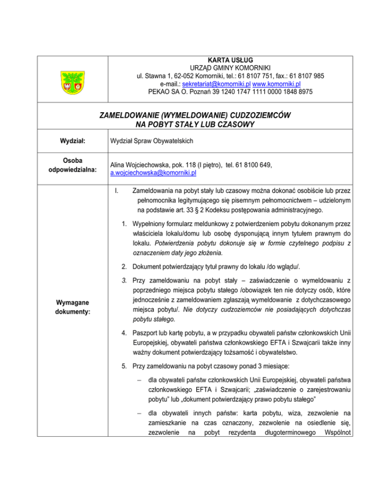 KARTA USŁUG URZĄD GMINY KOMORNIKI ul. Stawna 1, 62-052 Komorniki, tel.: 61 8107 751, fax.: 61 8107 985 e-mail.: [email protected] www.komorniki.pl PEKAO SA O. Poznań 39 1240 1747 1111 0000 1848 8975 ZAMELDOWANIE (WYMELDOWANIE) CUDZOZIEMCÓW NA POBYT STAŁY LUB CZASOWY Wydział: Osoba odpowiedzialna: Wydział Spraw Obywatelskich Alina Wojciechowska, pok. 118 (I piętro), tel. 61 8100 649, [email protected] I. Zameldowania na pobyt stały lub czasowy można dokonać osobiście lub przez pełnomocnika legitymującego się pisemnym pełnomocnictwem – udzielonym na podstawie art. 33 § 2 Kodeksu postępowania administracyjnego. 1. Wypełniony formularz meldunkowy z potwierdzeniem pobytu dokonanym przez właściciela lokalu/domu lub osobę dysponującą innym tytułem prawnym do lokalu. Potwierdzenia pobytu dokonuje się w formie czytelnego podpisu z oznaczeniem daty jego złożenia. 2. Dokument potwierdzający tytuł prawny do lokalu /do wglądu/. Wymagane dokumenty: 3. Przy zameldowaniu na pobyt stały – zaświadczenie o wymeldowaniu z poprzedniego miejsca pobytu stałego /obowiązek ten nie dotyczy osób, które jednocześnie z zameldowaniem zgłaszają wymeldowanie z dotychczasowego miejsca pobytu/. Nie dotyczy cudzoziemców nie posiadających dotychczas pobytu stałego. 4. Paszport lub kartę pobytu, a w przypadku obywateli państw członkowskich Unii Europejskiej, obywateli państwa członkowskiego EFTA i Szwajcarii także inny ważny dokument potwierdzający tożsamość i obywatelstwo. 5. Przy zameldowaniu na pobyt czasowy ponad 3 miesiące: dla obywateli państw członkowskich Unii Europejskiej, obywateli państwa członkowskiego EFTA i Szwajcarii; „zaświadczenie o zarejestrowaniu pobytu” lub „dokument potwierdzający prawo pobytu stałego” dla obywateli innych państw: karta pobytu, wiza, zezwolenie na zamieszkanie na czas oznaczony, zezwolenie na osiedlenie się, zezwolenie na pobyt rezydenta długoterminowego Wspólnot Europejskich lub decyzję o nadaniu statusu uchodźcy w Rzeczypospolitej Polskiej, udzieleniu w Rzeczypospolitej Polskiej ochrony uzupełniającej lub zgody na pobyt tolerowany. 6. Przy zameldowaniu na pobyt stały: dla obywateli państw członkowskich Unii Europejskiej, obywateli państwa członkowskich EFTA i Szwajcarii: „dokument potwierdzający prawo stałego pobytu, dla obywateli innych państw: karta pobytu wydana w związku z zezwoleniem na osiedlenie się, zezwolenie na pobyt rezydenta długoterminowego Unii Europejskiej lub decyzja o nadaniu statusu uchodźcy w Rzeczypospolitej Polskiej, udzieleniu w RP ochrony uzupełniającej lub zgody na pobyt tolerowany. II. Wymeldowania z pobytu stałego lub czasowego trwające ponad 3 miesiące należy dokonać osobiście lub przez pełnomocnika legitymującego się pisemnym pełnomocnictwem – udzielonym na podstawie art. 33 § 2 Kodeksu postępowania administracyjnego. wypełniony formularz meldunkowy paszport lub karta pobytu, a w przypadku obywatela Państwa członkowskiego Unii Europejskiej, państwa EFTA i Szwajcarii inny dokument potwierdzający tożsamość i obywatelstwo, pisemne pełnomocnictwo pełnomocnika/ /w przypadku wymeldowania przez Czynności zameldowania i wymeldowania nie podlegają opłacie skarbowej. Opłaty: Opłacie skarbowej w wysokości 17 zł podlega złożenie pełnomocnictwa w tej sprawie. Pełnomocnictwo udzielone małżonkowi, rodzicom, dzieciom, dziadkom i rodzeństwu nie podlega opłacie skarbowej. Termin odpowiedzi: Zameldowania i wymeldowania dokonuje się niezwłocznie po złożeniu formularza meldunkowego. 1. Ustawa z dnia 10 kwietnia 1974 r. o ewidencji ludności i dowodach osobistych (jednolity tekst Dz. U. z 2006 r. Nr 139, poz. 993 z późn. zm.). Podstawa prawna: 2. Rozporządzenie Ministra Spraw Wewnętrznych i Administracji z dnia 19 grudnia 2012r. /Dz. U. z 2012r. poz. 1475/. w sprawie zgłaszania i przyjmowania danych niezbędnych do zameldowania i wymeldowania oraz do prowadzenia ewidencji ludności i ewidencji wydanych i unieważnionych dowodów osobistych. Cudzoziemiec będący obywatelem państwa członkowskiego Unii Europejskiej, państwa EFTA lub Szwajcarii oraz członek rodziny ww. cudzoziemca jest zobowiązany zameldować się w miejscu pobytu stałego lub czasowego trwającego ponad 3 miesiące najpóźniej w 30 dniu licząc od dnia przybycia do tego miejsca. Uwagi: Cudzoziemiec będący obywatelem innego państwa jest zobowiązany zameldować się w miejscu pobytu stałego lub czasowego najpóźniej w 4 dniu licząc od dnia przybycia do tego miejsca – zwalnia się z obowiązku zameldowania cudzoziemca, którego pobyt na terenie RP nie przekracza 14 dni. Osoba, która opuszcza miejsce pobytu stałego lub czasowego ponad 3 miesiące jest zobowiązana wymeldować się w organie gminy dotychczasowego miejsca pobytu najpóźniej w dniu opuszczenia tego miejsca.