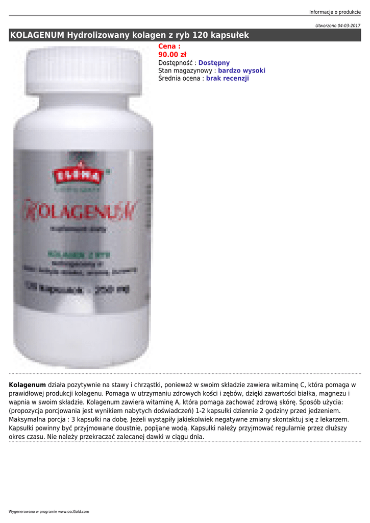 Informacje o produkcie Utworzono 04-03-2017 KOLAGENUM Hydrolizowany kolagen z ryb 120 kapsułek Cena : 90.00 zł Dostępność : Dostępny Stan magazynowy : bardzo wysoki Średnia ocena : brak recenzji Kolagenum działa pozytywnie na stawy i chrząstki, ponieważ w swoim składzie zawiera witaminę C, która pomaga w prawidłowej produkcji kolagenu. Pomaga w utrzymaniu zdrowych kości i zębów, dzięki zawartości białka, magnezu i wapnia w swoim składzie. Kolagenum zawiera witaminę A, która pomaga zachować zdrową skórę. Sposób użycia: (propozycja porcjowania jest wynikiem nabytych doświadczeń) 1-2 kapsułki dziennie 2 godziny przed jedzeniem. Maksymalna porcja : 3 kapsułki na dobę. Jeżeli wystąpiły jakiekolwiek negatywne zmiany skontaktuj się z lekarzem. Kapsułki powinny być przyjmowane doustnie, popijane wodą. Kapsułki należy przyjmować regularnie przez dłuższy okres czasu. Nie należy przekraczać zalecanej dawki w ciągu dnia. Wygenerowano w programie www.oscGold.com