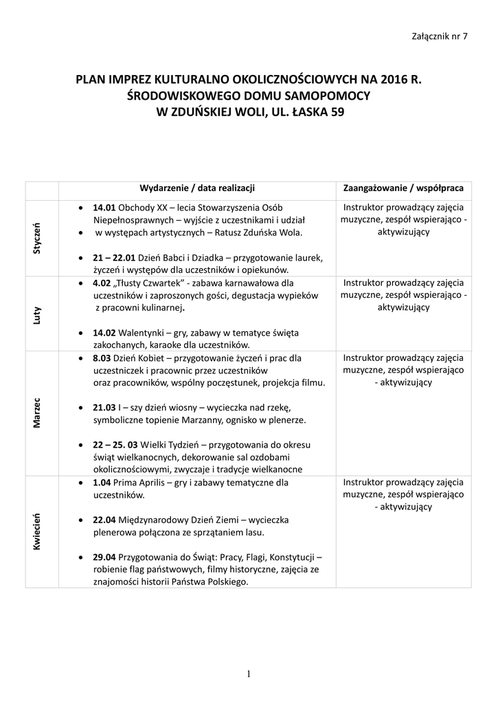Załącznik nr 7 PLAN IMPREZ KULTURALNO OKOLICZNOŚCIOWYCH NA 2016 R. ŚRODOWISKOWEGO DOMU SAMOPOMOCY W ZDUŃSKIEJ WOLI, UL. ŁASKA 59 Marzec Luty Styczeń Wydarzenie / data realizacji 14.01 Obchody XX – lecia Stowarzyszenia Osób Niepełnosprawnych – wyjście z uczestnikami i udział w występach artystycznych – Ratusz Zduńska Wola. Instruktor prowadzący zajęcia muzyczne, zespół wspierająco aktywizujący 21 – 22.01 Dzień Babci i Dziadka – przygotowanie laurek, życzeń i występów dla uczestników i opiekunów. 4.02 „Tłusty Czwartek” - zabawa karnawałowa dla uczestników i zaproszonych gości, degustacja wypieków z pracowni kulinarnej. Instruktor prowadzący zajęcia muzyczne, zespół wspierająco aktywizujący 14.02 Walentynki – gry, zabawy w tematyce święta zakochanych, karaoke dla uczestników. 8.03 Dzień Kobiet – przygotowanie życzeń i prac dla uczestniczek i pracownic przez uczestników oraz pracowników, wspólny poczęstunek, projekcja filmu. Instruktor prowadzący zajęcia muzyczne, zespół wspierająco - aktywizujący 21.03 I – szy dzień wiosny – wycieczka nad rzekę, symboliczne topienie Marzanny, ognisko w plenerze. 22 – 25. 03 Wielki Tydzień – przygotowania do okresu świąt wielkanocnych, dekorowanie sal ozdobami okolicznościowymi, zwyczaje i tradycje wielkanocne 1.04 Prima Aprilis – gry i zabawy tematyczne dla uczestników. Kwiecień Zaangażowanie / współpraca 22.04 Międzynarodowy Dzień Ziemi – wycieczka plenerowa połączona ze sprzątaniem lasu. 29.04 Przygotowania do Świąt: Pracy, Flagi, Konstytucji – robienie flag państwowych, filmy historyczne, zajęcia ze znajomości historii Państwa Polskiego. 1 Instruktor prowadzący zajęcia muzyczne, zespół wspierająco - aktywizujący Sierpień Lipiec Czerwiec Maj 6.05 Obchody I rocznicy działalności placówki ŚDS, występy artystyczne, wystawa prac uczestników, poczęstunek dla uczestników i zaproszonych gości. Piknik integracyjny dla osób niepełnosprawnych z terenu Powiatu Zduńskowolskiego – impreza plenerowa połączona z występami, koncertami zespołów dla uczestników i opiekunów z placówek opiekuńczych i innych organizacji działających na rzecz osób niepełnosprawnych. 25.05 Dzień Matki – przygotowanie życzeń dla matek uczestników, spotkanie z rodzicami, występ artystyczny, poczęstunek. 1.06 Międzynarodowy Dzień Dziecka – wspólne wyjście z uczestnikami do kina. Wrzesień Instruktor prowadzący zajęcia muzyczne, zespół wspierająco - aktywizujący 20.06 I – szy dzień lata, grill dla uczestników, zabawy na świeżym powietrzu. Wycieczka jednodniowa dla uczestników z opiekunami połączona ze zwiedzaniem. Instruktor prowadzący zajęcia muzyczne, zespół wspierająco - aktywizujący Turniej tenisa stołowego dla uczestników i zaproszonych gości z innych placówek. 16.08 Święto Wojska Polskiego – wycieczka i zwiedzanie 32. Bazy Lotniczej – JW 1158 w Łasku. Instruktor prowadzący zajęcia muzyczne, zespół wspierająco - aktywizujący Wyjście z uczestnikami i opiekunami na basen. 1 – 2.09 Dni Sportu organizacja gier i zabaw sportowych la uczestników, opiekunów i zaproszonych gości. Instruktor prowadzący zajęcia muzyczne, zespół wspierająco - aktywizujący 22.09 Początek astronomicznej jesieni – wycieczka dla uczestników i opiekunów do parku lub lasu w poszukiwaniu oznak nadchodzącej jesieni. 30.09 Dzień Chłopaka – zabawa taneczna dla uczestników i zaproszonych gości, poczęstunek. 14.10 Dzień Nauczyciela – gry i zabawy, występ artystyczny uczestników. Październik Instruktor prowadzący zajęcia muzyczne, zespół wspierająco - aktywizujący Wyjście na seans filmowy do kina Ratusz w Zduńskiej Woli. 31.10 Zabawa Halloween dla uczestników, występy indywidualne, konkurs na najlepsze przebranie. 2 Instruktor prowadzący zajęcia muzyczne, zespół wspierająco - aktywizujący Listopad Grudzień 2.11 Dzień Zaduszny – wizyta na cmentarzu, symboliczne zapalenie zniczy i wspomnienia wielkich ludzi z naszego regionu. 30.11 Zabawa Andrzejkowa połączona z grami i zabawami tematycznymi (wróżby andrzejkowe). 6.12 Mikołajki – wymiana własnoręcznie wykonanych upominków pomiędzy uczestnikami. 23.12 Wigilia Bożego Narodzenia – udział uczestników w przygotowaniach do wieczerzy, występ artystyczny, życzenia Bożonarodzeniowe. 30.12 Zakończenie Roku 2016, podsumowanie i nagrody dla uczestników, zabawa sylwestrowa. 3 Instruktor prowadzący zajęcia muzyczne, zespół wspierająco - aktywizujący Instruktor prowadzący zajęcia muzyczne, zespół wspierająco - aktywizujący
