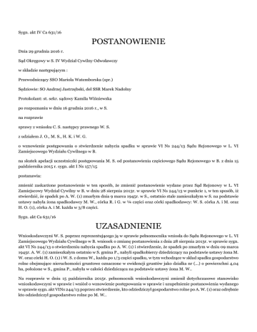 Sygn. akt IV Ca 631/16 POSTANOWIENIE Dnia 29 grudnia 2016 r. Sąd Okręgowy w S. IV Wydział Cywilny Odwoławczy w składzie następującym : Przewodniczący SSO Mariola Watemborska (spr.) Sędziowie: SO Andrzej Jastrzębski, del SSR Marek Nadolny Protokolant: st. sekr. sądowy Kamila Wiśniewska po rozpoznaniu w dniu 16 grudnia 2016 r., w S. na rozprawie sprawy z wniosku C. S. następcy prawnego W. S. z udziałem J. O., M. S., H. K. i W. G. o wznowienie postępowania o stwierdzenie nabycia spadku w sprawie VI Ns 244/13 Sądu Rejonowego w L. VI Zamiejscowego Wydziału Cywilnego w B. na skutek apelacji uczestniczki postępowania M. S. od postanowienia częściowego Sądu Rejonowego w B. z dnia 15 października 2015 r. sygn. akt I Ns 157/15 postanawia: zmienić zaskarżone postanowienie w ten sposób, że zmienić postanowienie wydane przez Sąd Rejonowy w L. VI Zamiejscowy Wydział Cywilny w B. w dniu 28 sierpnia 2013r. w sprawie VI Ns 244/13 w punkcie 1, w ten sposób, iż stwierdzić, że spadek po A. W. (1) zmarłym dnia 9 marca 1945r. w S., ostatnio stale zamieszkałym w S. na podstawie ustawy nabyła żona spadkodawcy M. W., córka R. i G. w ¼ części oraz córki spadkodawcy: W. S. córka A. i M. oraz H. O. (1), córka A. i M. każda w 3/8 części. Sygn. akt Ca 631/16 UZASADNIENIE Wnioskodawczyni W. S. poprzez reprezentującego ją w sprawie pełnomocnika wniosła do Sądu Rejonowego w L. VI Zamiejscowego Wydziału Cywilnego w B. wniosek o zmianę postanowienia z dnia 28 sierpnia 2013r. w sprawie sygn. akt VI Ns 244/13 o stwierdzeniu nabycia spadku po A. W. (1) i stwierdzenie, że spadek po zmarłym w dniu 09 marca 1945r. A. W. (1) zamieszkałym ostatnio w S. gmina P., nabyli spadkobiercy dziedziczący na podstawie ustawy żona M. W. oraz córki H. O. (1) i W. S. z domu W., każda po 1/3 części spadku, w tym wchodzące w skład spadku gospodarstwo rolne obejmujące nieruchomości gruntowe oznaczone w ewidencji gruntów jako działka nr (...) o powierzchni 4,04 ha, położone w S., gmina P., nabyła w całości dziedzicząca na podstawie ustawy żona M. W.. Na rozprawie w dniu 15 października 2015r. pełnomocnik wnioskodawczyni zmienił dotychczasowe stanowisko wnioskodawczyni w sprawie i wniósł o wznowienie postępowania w sprawie i uzupełnienie postanowienia wydanego w sprawie sygn. akt VINs 244/13 poprzez stwierdzenie, kto odziedziczył gospodarstwo rolne po A. W. (1) oraz odrębnie kto odziedziczył gospodarstwo rolne po M. W.. Z ustaleń Sądu Rejonowego wynika, że postanowieniem Sądu Rejonowego w L. VI Zamiejscowy Wydział Cywilny w B. sygn. akt VINs 244/13 w sprawie o stwierdzenie nabycia spadku po A. W. (1) stwierdzono, że spadek po zmarłym na podstawie ustawy nabyły żona spadkodawcy M. W. oraz córki spadkodawcy W. S. i H. O. (2) - po 1/3 części każda z nich. Nadto w punkcie 2 postanowienia sąd stwierdził, że spadek po M. W. na podstawie testamentu alograficznego nabyła córka spadkodawczyni W. S. oraz jej mąż T. S. - do majątku objętego wspólnością majątkową małżeńską- w całości. Ustalił także Sąd I instancji, że z wypisu z rejestru gruntów dla działek numer (...) położonych w obrębie ewidencyjnym S. gmina P. wynika, że właścicielem nieruchomości jest W. A. ( J. ???) zam. (...). Z akt natomiast Sądu Rejonowego w B. sygn. akt INs 197/09 o zasiedzenie nieruchomości wynika, że M. W. i A. W. (1) zawarli związek małżeński w dniu 17 lutego 1919r. Ze związku małżeńskiego mieli dwoje dzieci W. S. i H. O. (1). A. W. (1) zmarł w 1945r. nie pozostawiając testamentu. W skład majątku wchodziło gospodarstwo rolne położone w S. o łącznej powierzchni 4,04 ha obejmujące działkę ewidencyjną nr (...) o powierzchni 0,11 ha, klasa (...) oraz działkę ewidencyjną nr (...) o powierzchni 3,93 ha, klasa (...). Żadna z w/w nieruchomości tworzących gospodarstwo rolne nie została objęta jakąkolwiek polską księgą wieczystą. Jako właściciel tej nieruchomości położonej w S. został ujawniony w księdze wieczystej (G.) A. W. (2) z Z.- obecnie S., przez wpis dokonany w okresie II Rzeczypospolitej o treści „P. dnia 13.09.1929 r., a wpisano dnia 11.10.1931 r.” ( tłumaczenie niemieckiej księgi wieczystej k. 277-279 oraz k. 288-290 akt INs 197/09). Dalej w oparciu o ustalenia poczynione w sprawie sygn. akt INs 197/09, sąd ustalił, że termin powzdanie (die A.) oznacza przewłaszczenie przeniesienia własności w przypadku nieruchomości. Zgodnie z ustaleniami poczynionymi w ww. sprawie obowiązywał wówczas Kodeks Cywilny Niemiecki ( (...) w brzmieniu opublikowanym jako „Kodeks cywilny obowiązujący na Ziemiach Zachodnich Rzeczypospolitej Polskiej (przekład urzędowy)” Wydawnictwa Ministerstwa Sprawiedliwości Zbioru Ustaw Ziem Zachodnich tom X W.- P. 1923r. Zgodnie z ówcześnie obowiązującym § 873 (...), do przeniesienia własności gruntu wymagana była rzeczowa umowa przewłaszczenia, zawierająca zgodę zbywcy i nabywcy na przeniesienie własności (powzdanie) oraz wpis tej zmiany w prawie do księgi wieczystej. W myśl § 925 (...) oświadczenia zgody na przewłaszczenie musiały być złożone przed wydziałem hipotecznym przy równoczesnej obecności obu stron. Zwrócił uwagę Sąd meriti na stanowisko, z którego wynika, że postanowienie o zasiedzeniu nie może zastępować braku tytułu. Jeżeli taki tytuł zaginął, możliwe jest tylko ustalenie przez sąd, jak przedstawia się w jego świetle stan własność. W ocenie Sądu Rejonowego, po śmierci A. W. (2) spadek po nim nabyli na podstawie ustawy (...) (tereny te nie zostały formalnie włączone jeszcze w skład państwa Polskiego – toczyła się nadal wojna, nie były ustalone granice między państwami, nie został jeszcze zawarty Traktat (...)) – żona oraz dwie córki. Natomiast co do dziedziczenia gospodarstwa rolnego sąd I instancji wskazał na przepisy ustawy z dnia 23 kwietnia 1964 r. Przepisy wprowadzające kodeks cywilny