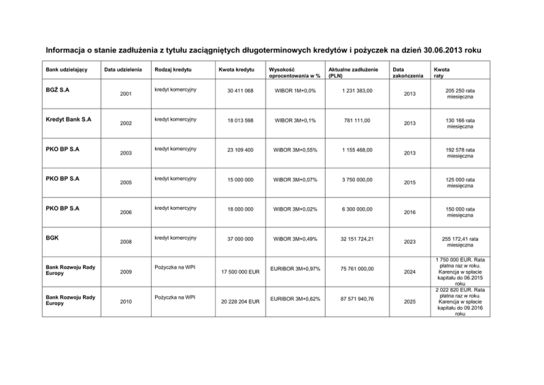 Informacja o stanie zadłużenia z tytułu zaciągniętych długoterminowych kredytów i pożyczek na dzień 30.06.2013 roku Bank udzielający BGŻ S.A Kredyt Bank S.A PKO BP S.A PKO BP S.A PKO BP S.A BGK Data udzielenia 2001 2002 2003 2005 2006 2008 Bank Rozwoju Rady Europy 2009 Bank Rozwoju Rady Europy 2010 Rodzaj kredytu Kwota kredytu Wysokość oprocentowania w % Aktualne zadłużenie (PLN) kredyt komercyjny 30 411 068 WIBOR 1M+0,0% 1 231 383,00 kredyt komercyjny 18 013 598 WIBOR 3M+0,1% 781 111,00 kredyt komercyjny 23 109 400 WIBOR 3M+0,55% 1 155 468,00 kredyt komercyjny 15 000 000 WIBOR 3M+0,07% 3 750 000,00 kredyt komercyjny 18 000 000 WIBOR 3M+0,02% 6 300 000,00 kredyt komercyjny 37 000 000 WIBOR 3M+0,49% 32 151 724,21 EURIBOR 3M+0,97% 75 761 000,00 EURIBOR 3M+0,62% 87 571 940,76 Pożyczka na WPI Pożyczka na WPI 17 500 000 EUR 20 228 204 EUR Data zakończenia Kwota raty 2013 205 250 rata miesięczna 2013 130 166 rata miesięczna 2013 192 578 rata miesięczna 2015 125 000 rata miesięczna 2016 150 000 rata miesięczna 2023 255 172,41 rata miesięczna 2024 2025 1 750 000 EUR. Rata płatna raz w roku. Karencja w spłacie kapitału do 06.2015 roku 2 022 820 EUR. Rata płatna raz w roku. Karencja w spłacie kapitału do 09.2016 roku Europejski Bank Inwestycyjny 2010 Europejski Bank Inwestycyjny 2011 Europejski Bank Inwestycyjny 2011 Pekao S.A. 2010 BGK Kredyt na WPI Kredyt na WPI Kredyt na WPI kredyt komercyjny 15 003 751 EUR EURIBOR 3M+0,431% 64 954 238,57 18 454 607 EUR EURIBOR 3M+0,453% 79 893 682,29 4 430 366 EUR EURIBOR 3M+0,737% 19 179 939,33 42 000 000 WIBOR 3M+0,72% 42 000 000,00 2025 2026 2026 2025 kredyt pomostowy 2012 13 500 000 WIBOR 3M+0,83% 9 668 361,84 2014 1 363 977 EUR. Rata płatna raz w roku. Karencja w spłacie kapitału do 06.2015 roku 1 677 692 EUR. Rata płatna raz w roku. Karencja w spłacie kapitału do 09.2016 roku 402 761 EUR. Rata płatna raz w roku. Karencja w spłacie kapitału do 12.2016 roku 289 655 rata miesięczna. Karencja w spłacie kapitału do 12.2013 roku spłacono 3 831 638,16 kapitał spłacany w częściach po otrzymaniu środków z budżetu Unii Europejskiej;