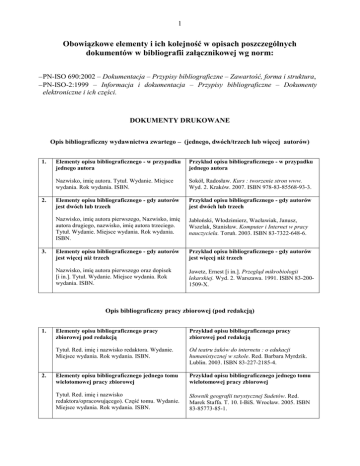 1 Obowiązkowe elementy i ich kolejność w opisach poszczególnych dokumentów w bibliografii załącznikowej wg norm: PN-ISO 690:2002 – Dokumentacja – Przypisy bibliograficzne – Zawartość, forma i struktura, PN-ISO-2:1999 – Informacja i dokumentacja – Przypisy bibliograficzne – Dokumenty elektroniczne i ich części. DOKUMENTY DRUKOWANE Opis bibliograficzny wydawnictwa zwartego – (jednego, dwóch/trzech lub więcej autorów) 1. 2. 3. Elementy opisu bibliograficznego - w przypadku jednego autora Przykład opisu bibliograficznego - w przypadku jednego autora Nazwisko, imię autora. Tytuł. Wydanie. Miejsce wydania. Rok wydania. ISBN. Sokół, Radosław. Kurs : tworzenie stron www. Wyd. 2. Kraków. 2007. ISBN 978-83-85568-93-3. Elementy opisu bibliograficznego - gdy autorów jest dwóch lub trzech Przykład opisu bibliograficznego - gdy autorów jest dwóch lub trzech Nazwisko, imię autora pierwszego, Nazwisko, imię autora drugiego, nazwisko, imię autora trzeciego. Tytuł. Wydanie. Miejsce wydania. Rok wydania. ISBN. Jabłoński, Włodzimierz, Wacławiak, Janusz, Wszelak, Stanisław. Komputer i Internet w pracy nauczyciela. Toruń. 2003. ISBN 83-7322-648-6. Elementy opisu bibliograficznego - gdy autorów jest więcej niż trzech Przykład opisu bibliograficznego - gdy autorów jest więcej niż trzech Nazwisko, imię autora pierwszego oraz dopisek [i in.]. Tytuł. Wydanie. Miejsce wydania. Rok wydania. ISBN. Jawetz, Ernest [i in.]. Przegląd mikrobiologii lekarskiej. Wyd. 2. Warszawa. 1991. ISBN 83-2001509-X. Opis bibliograficzny pracy zbiorowej (pod redakcją) 1. 2. Elementy opisu bibliograficznego pracy zbiorowej pod redakcją Przykład opisu bibliograficznego pracy zbiorowej pod redakcją Tytuł. Red. imię i nazwisko redaktora. Wydanie. Miejsce wydania. Rok wydania. ISBN. Od teatru żaków do internetu : o edukacji humanistycznej w szkole. Red. Barbara Myrdzik. Lublin. 2003. ISBN 83-227-2185-4. Elementy opisu bibliograficznego jednego tomu wielotomowej pracy zbiorowej Przykład opisu bibliograficznego jednego tomu wielotomowej pracy zbiorowej Tytuł. Red. imię i nazwisko redaktora/opracowującego). Część tomu. Wydanie. Miejsce wydania. Rok wydania. ISBN. Słownik geografii turystycznej Sudetów. Red. Marek Staffa. T. 10. I-BiS. Wrocław. 2005. ISBN 83-85773-85-1. 2 Opis bibliograficzny fragmentu dokumentu zwartego jednego autora 1. Elementy obowiązkowe opisu bibliograficznego fragmentu w wydawnictwie zwartym Przykład opisu bibliograficznego fragmentu w wydawnictwie zwartym Nazwisko, imię autora. Tytuł dokumentu macierzystego, Oznaczenie wydania. Miejsce wydania. Rok wydania. Tytuł fragmentu książki. Lokalizacja w obrębie dokumentu macierzystego (strony). Iwaszkiewicz, Jarosław. Wszystkie owoce świata. Warszawa. 1993. Stary sad. s. 103. Opis bibliograficzny artykułu z pracy zbiorowej Elementy obowiązkowe opisu bibliograficznego artykułu (rozdziału) z książki pod redakcją Przykład opisu bibliograficznego artykułu (rozdziału) z książki pod redakcją Nazwa autora artykułu (rozdziału). Tytuł artykuł (rozdziału). W: Opis wydawnictwa zwartego (książki). Lokalizacja w obrębie dokumentu macierzystego (strony). Szedzianis, Elżbieta. Od eksperymentu uczniowskiego do myślenia naukowego. W: Szkolenie nauczycieli w zakresie rozwijania kompetencji kluczowych uczniów. Red. Jolanta Szwedowska [i in.]. Wrocław. 2011, s. 267-276. Opis bibliograficzny artykułu z czasopisma 1. Elementy obowiązkowe opisu bibliograficznego artykułu z czasopisma Przykład opisu bibliograficznego artykułu z czasopisma Nazwa autora artykułu. Tytuł artykułu. Tytuł dokumentu macierzystego (czasopisma). Lokalizacja w obrębie dokumentu macierzystego (rok, numer, strony). Brzezińska, Danuta. Nowa podstawa programowa w bibliotece szkolnej. „Meritum” 2009, nr 4, s. 53-58. DOKUMENTY ELEKTRONICZNE 1. 2. Elementy obowiązkowe opisu bibliograficznego książki w Internecie Przykład opisu bibliograficznego książki w Internecie Autor/redaktor. Tytuł. [Typ nośnika]. Odpowiedzialność drugorzędna. Wydanie. Miejsce wydania. Rok wydania. Data wydania. Data aktualizacji. [Data dostępu]. Warunki dostępu. Numer znormalizowany. Zabiciel, Marek. Jak wygrać w biznesie? : kompletna instrukcja od A do Z dla planujących własną działalność. [plik PDF]. Gliwice. 2010. [dostęp: 30 stycznia 2012]. Dostępny w Internecie: http://www.darmowe-ebooki.com/czytelnia/jakwygrac-w-biznesie.pdf. Elementy obowiązkowe opisu bibliograficznego książki na płycie CD-ROM Przykład opisu bibliograficznego książki na płycie CD-ROM Autor/redaktor. Tytuł. [Typ nośnika]. Odpowiedzialność drugorzędna. Wydanie. Miejsce wydania: wydawca, rok wydania. Data wydania. Data aktualizacji. Numer znormalizowany. Przygoda na Ziemi. [CD-ROM]. Warszawa: Państwowe Wydawnictwo Naukowe, 2008. ISBN 978-83-601-4776-4. 3 3. 4. 5. Elementy obowiązkowe opisu bibliograficznego artykułu w elektronicznym wydawnictwie zwartym Przykład opisu bibliograficznego artykułu w elektronicznym wydawnictwie zwartym Autor artykułu. Tytuł artykułu. W: Tytuł dokumentu macierzystego. [Typ nośnika]. Odpowiedzialność drugorzędna dokumentu macierzystego. Wydanie. Miejsce wydania: wydawca, rok wydania. [Data dostępu]. Warunki dostępu. Numer znormalizowany. Batorski, Dominik. Stan kompetencji z zakresu edukacji medialnej i informacyjnej w Polsce. W: Cyfrowa przyszłość: edukacja medialna i informacyjna w Polsce – raport otwarcia. [online]. [dostęp: 30 stycznia 2012]. Dostępny w Internecie: http://nowoczesnapolska.org.pl/2012/01/20/edukacjamedialna-i-informacyjna-raport-otwarcia/. Elementy obowiązkowe opisu bibliograficznego artykułu w czasopiśmie internetowym Przykład opisu bibliograficznego artykułu w czasopiśmie internetowym Autor artykułu. Tytuł artykułu. W: Tytuł czasopisma. [Typ nośnika]. Data wydania, oznaczenie zeszytu/numeru. Data aktualizacji. [Data dostępu]. Lokalizacja w obrębie d