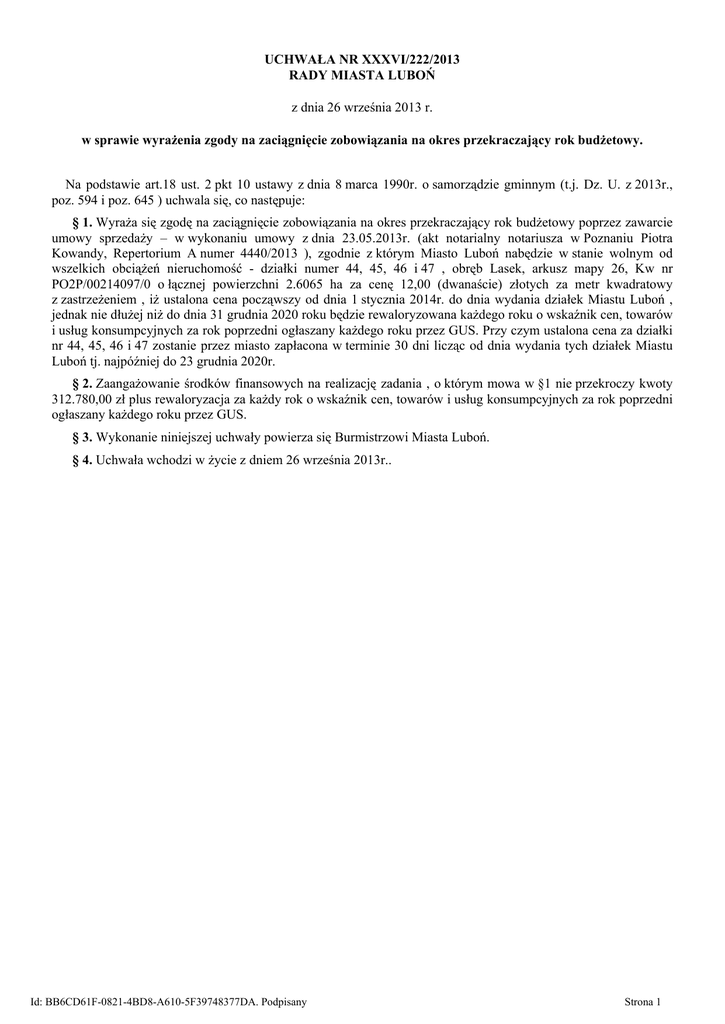 UCHWAŁA NR XXXVI/222/2013 RADY MIASTA LUBOŃ z dnia 26 września 2013 r. w sprawie wyrażenia zgody na zaciągnięcie zobowiązania na okres przekraczający rok budżetowy. Na podstawie art.18 ust. 2 pkt 10 ustawy z dnia 8 marca 1990r. o samorządzie gminnym (t.j. Dz. U. z 2013r., poz. 594 i poz. 645 ) uchwala się, co następuje: § 1. Wyraża się zgodę na zaciągnięcie zobowiązania na okres przekraczający rok budżetowy poprzez zawarcie umowy sprzedaży – w wykonaniu umowy z dnia 23.05.2013r. (akt notarialny notariusza w Poznaniu Piotra Kowandy, Repertorium A numer 4440/2013 ), zgodnie z którym Miasto Luboń nabędzie w stanie wolnym od wszelkich obciążeń nieruchomość - działki numer 44, 45, 46 i 47 , obręb Lasek, arkusz mapy 26, Kw nr PO2P/00214097/0 o łącznej powierzchni 2.6065 ha za cenę 12,00 (dwanaście) złotych za metr kwadratowy z zastrzeżeniem , iż ustalona cena począwszy od dnia 1 stycznia 2014r. do dnia wydania działek Miastu Luboń , jednak nie dłużej niż do dnia 31 grudnia 2020 roku będzie rewaloryzowana każdego roku o wskaźnik cen, towarów i usług konsumpcyjnych za rok poprzedni ogłaszany każdego roku przez GUS. Przy czym ustalona cena za działki nr 44, 45, 46 i 47 zostanie przez miasto zapłacona w terminie 30 dni licząc od dnia wydania tych działek Miastu Luboń tj. najpóźniej do 23 grudnia 2020r. § 2. Zaangażowanie środków finansowych na realizację zadania , o którym mowa w §1 nie przekroczy kwoty 312.780,00 zł plus rewaloryzacja za każdy rok o wskaźnik cen, towarów i usług konsumpcyjnych za rok poprzedni ogłaszany każdego roku przez GUS. § 3. Wykonanie niniejszej uchwały powierza się Burmistrzowi Miasta Luboń. § 4. Uchwała wchodzi w życie z dniem 26 września 2013r.. Id: BB6CD61F-0821-4BD8-A610-5F39748377DA. Podpisany Strona 1 Uzasadnienie do UCHWAŁY nr XXXVI/222/2013 RADY MIASTA LUBOŃ z dnia 26 września 2013 roku w sprawie wyrażenia zgody na zaciągnięcie zobowiązania na okres przekraczający rok budżetowy. 1. Przesłanki przemawiające za przyjęciem proponowanej regulacji. Zgodnie z art. 18 ust. 2 pkt 10 ustawy z dnia 8 marca 1990r. o samorządzie gminnym (j.t. Dz.U. z 2013r., poz.594 i poz. 646) Rada Miasta podejmuje uchwały w sprawie określania wysokości sumy, do której wójt może samodzielnie zaciągać zobowiązania. W związku z koniecznością zawarcia umowy sprzedaży – w wykonaniu umowy z dnia 23.05.2013r. (akt notarialny notariusza w Poznaniu Piotra Kowandy, Repertorium A numer 4440/2013 ) , zgodnie z którą Miasto Luboń nabędzie w stanie wolnym od wszelkich obciążeń nieruchomość - działki numer 44, 45, 46 i 47 , obręb Lasek, arkusz mapy 26, Kw nr PO2P/00214097/0 o łącznej powierzchni 2.6065 ha za cenę 12,00 (dwanaście) złotych za metr kwadratowy z zastrzeżeniem , iż ustalona cena począwszy od dnia 1 stycznia 2014r. do dnia wydania działek Miastu Luboń , jednak nie dłużej niż do dnia 31 grudnia 2020 roku będzie rewaloryzowana każdego roku o wskaźnik cen, towarów i usług konsumpcyjnych za rok poprzedni ogłaszany każdego roku przez GUS, przy czym ustalona cena za działki nr 44, 45, 46 i 47 zostanie przez miasto zapłacona w terminie 30 dni licząc od dnia wydania tych działek Miastu Luboń tj. najpóźniej do 23 grudnia 2020r. zaistniała konieczność podjęcia zgody na zaciągnięcie zobowiązania na okres przekraczający rok budżetowy. 2.Informacja o skutkach finansowych – obciążeniu finansowym dla budżetu Miasta wynikającym z podpisania umowy sprzedaży. Zawarcie umowy notarialnej zobowiąże miasto do zapłacenia ustalonej cena za nabycie działek nr 44, 45, 46 i 47 w terminie 30 dni licząc od dnia wydania tych działek Miastu Luboń jednak najpóźniej do 23 grudnia 2020r. Ustalona cena nie przekroczy kwoty 312.780,00 zł plus rewaloryzacja za każdy rok o wskaźnik cen, towarów i usług konsumpcyjnych za rok poprzedni ogłaszany każdego roku przez GUS. 3.Wskazanie źródła pokrycia realizacji przedsięwzięcia. Źródło pokrycia realizacji przedsięwzięcia z budżetu Miasta: Dział 700- Gospodarka mieszkaniowa; Rozdział 70005 – Gospodarka gruntami i nieruchomościami. 4.Informacja o oczekiwanych skutkach społecznych i innych, jakie wiązać się będą z przyjęciem uchwały. Przyjęcie uchwały nie wywoła istotnych skutków społecznych i innych. Id: BB6CD61F-0821-4BD8-A610-5F39748377DA. Podpisany Strona 1