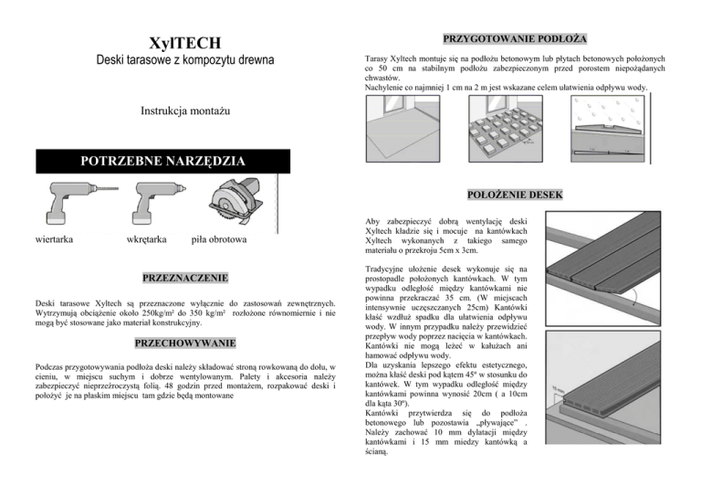 XylTECH PRZYGOTOWANIE PODŁOŻA Deski tarasowe z kompozytu drewna Tarasy Xyltech montuje się na podłożu betonowym lub płytach betonowych położonych co 50 cm na stabilnym podłożu zabezpieczonym przed porostem niepożądanych chwastów. Nachylenie co najmniej 1 cm na 2 m jest wskazane celem ułatwienia odpływu wody. Instrukcja montażu POTRZEBNE NARZĘDZIA POŁOŻENIE DESEK wiertarka wkrętarka piła obrotowa PRZEZNACZENIE Deski tarasowe Xyltech są przeznaczone wyłącznie do zastosowań zewnętrznych. Wytrzymują obciążenie około 250kg/m² do 350 kg/m² rozłożone równomiernie i nie mogą być stosowane jako materiał konstrukcyjny. PRZECHOWYWANIE Podczas przygotowywania podłoża deski należy składować stroną rowkowaną do dołu, w cieniu, w miejscu suchym i dobrze wentylowanym. Palety i akcesoria należy zabezpieczyć nieprzeźroczystą folią. 48 godzin przed montażem, rozpakować deski i położyć je na płaskim miejscu tam gdzie będą montowane Aby zabezpieczyć dobrą wentylację deski Xyltech kładzie się i mocuje na kantówkach Xyltech wykonanych z takiego samego materiału o przekroju 5cm x 3cm. Tradycyjne ułożenie desek wykonuje się na prostopadle położonych kantówkach. W tym wypadku odległość między kantówkami nie powinna przekraczać 35 cm. (W miejscach intensywnie uczęszczanych 25cm) Kantówki kłaść wzdłuż spadku dla ułatwienia odpływu wody. W innym przypadku należy przewidzieć przepływ wody poprzez nacięcia w kantówkach. Kantówki nie mogą leżeć w kałużach ani hamować odpływu wody. Dla uzyskania lepszego efektu estetycznego, można kłaść deski pod kątem 45º w stosunku do kantówek. W tym wypadku odległość między kantówkami powinna wynosić 20cm ( a 10cm dla kąta 30º). Kantówki przytwierdza się do podłoża betonowego lub pozostawia „pływające” . Należy zachować 10 mm dylatacji między kantówkami i 15 mm miedzy kantówką a ścianą. MOCOWANIE I ŁĄCZENIE DESEK kantówki. KONIECZNE JEST ZACHOWANIE DYLATACJI WG TABELI OBOK. Deski Xyltech nie wymagają szczególnego czyszczenia: - należy utrzymać w czystości szczeliny między deskami, aby umożliwić odpływ wody. - zmywanie myjką ciśnieniową z łagodnym detergentem. - plamy z pleśni usuwać rozcieńczonymi środkami zawierającymi chlor. - plamy tłuste lub olej zmywać środkiem odtłuszczającym najszybciej jak to możliwe. Jeśli są starsze użyć szczotki drucianej. - nie używać rozpuszczalników. - rowki czyści się drucianą szczotką. - Deski Xyltech nie wymagają żadnej szczególnej konserwacji. Można je jednak lakierować i malować nie wcześniej niż 4 do 6 miesięcy od położenia. Należy wykonać próbę na niewidocznej powierzchni. W momencie dostawy deski mogą posiadać miejscowe wyblaknięcia, które znikają pod wpływem promieni słonecznych. NAJCZĘSTSZE BŁĘDY, KTÓRYCH MOŻNA UNIKNĄĆ Zalecana szerokość dylatacji w mm Różnica między temperaturą składowania a temperaturą w dniu układania Łączna długość desek Deski układa się stroną rowkowaną (przeciwpoślizgową) do góry, pozostawiając dystans na długości i szerokości ok. 8 mm (12mm dla desek o dł. 3,60m)aby ułatwić odpływ wody i śniegu. Aby uzyskać równe odstępy należy użyć klinów tej szerokości. Aby uniknąć nierówności deski mocować na kantówkach za pomocą klipsów ze stali nierdzewnej. Na początku nie należy dopasowywać deski do brzegu tarasu. Wyrównanie jej nastąpi w chwili wykończania. Deski można układać prostopadle do kantówek, lub tworzyć desenie skośne do 90º. Należy przedtem przewidzieć położenie kantówek. Deski przytwierdza się klipsami ze stali nierdzewnej i wkrętami 4x30mm. Należy wcisnąć klips w brzeg deski, przykręcić go w środku kantówki, minimum 3 cm od końca deski aby uniknąć pęknięcia kompozytu. Następnie dopchnąć kolejną deskę. Deski przytwierdzać do każdej 100cm 200cm 240cm 300cm 360cm 400cm 500cm 600cm 10°C 20°C 3,4 6,8 8,2 10,2 12,2 13,6 17,0 20,4 3,8 7,6 9,1 11,4 13,7 15,2 18,9 22,7 WYKOŃCZENIE Końce desek muszą spoczywać na kantówkach. Gdy wszystkie deski są już przymocowane, należy wyrównać końce za pomocą piły obrotowej. Następnie wcisnąć zamknięcia profili lub przymocować listwę do deski lub kantówki zachowując dylatację 5mm. Wkręty co 30 cm zapewniają dobre trzymanie się listwy (należy jednak nawiercić większe otwory w listwie aby umożliwić dylatacje). Jeżeli stosujemy zamknięcia profili, należy nawiercić 4 otwory o średnicy 15 mm w dolnej części deski, aby umożliwić odpływ wody. Należy zwrócić szczególną uwagę na cięcie kątów i ułożenie. Zawsze trzeba pozostawić dystans pozwalający na swobodna dylatację desek i listew. CZYSZCZENIE DESEK XYLTECH 30° C 4,2 8,4 10,0 12,6 15,0 16,7 20,9 25,1 40°C 50°C 4,6 9,2 11,0 13,7 16,5 18,3 22,8 27,4 5,0 9,9 12,0 14,9 18,9 19,8 27,8 29,7 - nie zatapiać kantówek w betonie - nie sklejać ze sobą desek - nie łączyć desek - nie łączyć kantówek bez zachowania dylatacji - nie kłaść kantówek i desek na ścianę - nie zatykać szczelin między deskami - nie kłaść desek stroną rowkowaną do dołu - nie przykręcać klipsów zbyt mocno. ZAWSZE NALEŻY ZABEZPIECZYĆ DOBRY ODPŁYW WODY I DOSKONAŁY OBIEG POWIETRZA. WARUNKI GWARANCJI Uwaga: Deski Xyltech są przeznaczone do wykonywania podestów ogrodowych i nie są przeznaczone na pasaże lecz wyłącznie do użytku domowego. Do realizacji w miejscach intensywnego użytkowania zalecamy inne deski z naszej gamy (np. HAVANA). Zastosowania wewnętrzne nie są zalecane. Deski Xyltech nie są materiałem budowlanym, mogącym znieść nacisk miejscowy od 250kg/m² do 350kg/m² równomiernie rozłożony. Lekkie przebarwienia i różnice kolorystyczne znikają pod wpływem promieni słonecznych. Kolory desek prezentowane w broszurach nie są wiążące i mogą się nieznacznie różnić, wskutek użycia różnych 