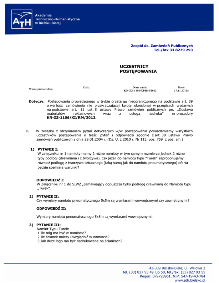 Zespół ds. Zamówień Publicznych Tel./fax 33 8279 293 UCZESTNICY POSTĘPOWANIA Wasze pismo z dnia: Znak: Nasz znak: KN-ZZ-1106/XI/RM/2012 Data: 27.11.2012r. Dotyczy: Postępowania prowadzonego w trybie przetargu nieograniczonego na podstawie art. 39 o wartości zamówienia nie przekraczającej kwoty określonej w przepisach wydanych na podstawie art. 11 ust. 8 ustawy Prawo zamówień publicznych pn. „Dostawa materiałów reklamowych wraz z usługą nadruku” nr procedury KN-ZZ-1106/XI/RM/2012. I. W związku z otrzymaniem pytań dotyczących w/w postępowania powiadamiamy wszystkich uczestników postępowania o treści pytań i odpowiedzi zgodnie z art. 38 ustawy Prawo zamówień publicznych z dnia 29.01.2004 r. (Dz. U. z 2010 r. Nr 113, poz. 759 z póź. zm.) 1) PYTANIE I: W załączniku nr 1 namioty mamy 2 różne namioty w tym samym rozmiarze jednak 2 różne typy podłogi (drewniana i z tworzywa), czy jeżeli do namiotu typu "Turek" zaproponujemy również podłogę z tworzywa sztucznego (taką samą jak do namiotu pneumatycznego) oferta będzie spełniała warunki? ODPOWIEDŹ I: W Załączniku nr 1 do SIWZ ,Zamawiający dopuszcza tylko podłogę drewnianą do Namiotu typu „Turek”. 2) PYTANIE II: Czy wymiary namiotu pneumatycznego 5x5m są wymiarami wewnętrznymi czy zewnętrznymi? ODPOWIEDŹ II: Wymiary namiotu pneumatycznego 5x5m są wymiarami wewnętrznymi. 3) PYTANIE III: Namiot Typu Turek: 1.Ile nóg ma być w namiocie? 2.Ile ścianek należy uwzględnić w namiocie? 3.Jak duże logo ma być nadrukowane na ściankach? ODPOWIEDŹ III: 1.Ilość nóg w namiocie typu Turek : 4 nogi 2.Ilość ścianek :trzy ścianki plus ściana z drzwiami z możliwością podwinięcia. 3.Logo nadrukowane na trzech ścianach o wymiarach 65 cm x 65 cm + napis na dole. 4) PYTANIE IV: Namiot Pneumatyczny: 1.Ile ścianek należy uwzględnić w namiocie? 2.Jak duże logo ma być nadrukowane na ściankach? ODPOWIEDŹ IV: 1.Ilość ścianek :4 ścianki wypinane na zamki . 2.Logo nadrukowane na trzech ścianach o wymiarach 65 cm x 65 cm + napis na dole. 5) PYTANIE V: Koszulki: 1.Jaka minimalna gramatura koszulki jest dopuszczona? 2.Piszą Państwo o nadruku logo z przodu i z tyłu oraz dodatkowo o napisie na dole. Jaki ma to być napis i w jakim rozmiarze? ODPOWIEDŹ V: 1.Minimalna gramatura koszulki 180g. 2.Napis pod logiem ATH nazwa uczelni: Bielsku-Białej zgodnie z wizualizacją. Akademia Techniczno-Humanistyczna II. Powyższe wyjaśnienia stanowią integralną część SIWZ. Przewodniczący Komisji Przetargowej /-/ mgr Regina Matusiak w
