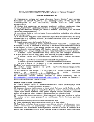 REGULAMIN KONKURSU WAKACYJNEGO „Rowerowy Konkurs Olimpijski” POSTANOWIENIA OGÓLNE: ) MERIDA POLSKA Sp. z o.o., z b Z b 4 -800), przy ul. Marii -Curie 35, NIP: 631-23-00-850; REGON: 008174780, (dalej zwana: ) 1.2. Konkurs jest organizowany na zasadach ś ch niniejszym regulaminem (dalej ) ch b c przepisami prawa. 1.3. Regulamin Konkursu ę b internetowej www.rowerymerida.pl. 4 c b b c ł c ł ś c śc ch 1.5 b ł c c b ł c c c c ł c ł c 6 N c I miejsceC Z P 999 ) cę c T P 2003 ) cę c ńc konkursu miejscu i czasie, ł b c śc c M M v MTB M h M v MTB M h ) M v Merida Biking Team – ś II miejsce – ud ł ch M c 20 3 bę ę 20 ś br. w Wiś M v M B T b ł b M III miejsce – komplet opon MTB Maxxis Aspen, b ł b M kapturem oraz parasol Merida. IV miejsce – M Ch b ł b M V miejsce – ę c M M FF b ł b M Nagroda specjalna od bikeBoard“ – roczna prenumerata magazynu rowerowego bikeBoard“ bikeBoard“. 2 bę ł http://www.facebook.com/pages/MeridaPolska/118359721507477. 22 bę ł ch 27.07.2012–12 0 20 2 ł ę ł http://www.facebook.com/pages/Merida-Polska/118359721507477. 23 ł oraz na http://www.facebook.com/pages/Merida-Polska/118359721507477 dni od ostatniego dnia czasu trwania Konkursu. S ł ZASADY PROWADZENIA KONKURSU: 3.1. Konkur bę ł c ęc c bę c z dyscyplin olimpijskich na rowerze. 3.2. Laureatem bę osoba, na ęc fani marki Merida Polska na profilu facebook.com odda ę c bę ł . N ęc b ch ęc ę c bę ł N ę c magazynu b Board przyzna J ł Mł ę c P ł J ł 33 b ch ł ś c 3 ł c ch c Organizator. 3.4. Jedna os b ł c bę ę . 35 b c ł ęc . 36 ś c b c ę b c , adresu e-mailowego lub odpowiednio adres zamieszkania bę b Zabrzu (41-800) M S ł -Curie 35 c c ł b Organizatora Konkursu. Gwarantujem b ś ł ch ch ch b ch 3 ę P P ch c c c b ch ł ł b wskutek wykorzystania pr 3 Z ł b T ęc dyskwalifikowane. 3 9 Z ęc c konkursu. c c śc c b PRZYZNAWANIE NAGRÓD: 4 c ł ń ś ł c c b c ch c ę ch bę c c ł ch b b ch ch bę ś bę c c 3 23 42 c c śc -mail w termin 23 43 N c ch bę b Zabrzu (41-800) przy ul. Marii S ł -Curie 35 za okazaniem potwierdzenia wygranej przekazanej laureatowi przez organizatora b c c b ł kiej na koszt Organizatora pod adres zamieszkania wskazany przez laureata w terminie 7 dni roboczych od dnia otrzymania od ch c ch ł 4.4. W przypadku niedostarczenia danych adresowych przez laureata w terminie 7 dni od dnia poinformowania o wygranej, prawo do nagrody wygasa. 45 ch ś ę 46 ł b c ch ł śc śc c ch. b ł b z adresem do korespondencji i ewentualnego c na terenie Rzeczpospolitej Polskiej. 4.7. W przypadku zrezygnowania z nagrody potwierdzonego przekazaniem stosownych c b c ch ch c b c ch śc c ę c c b ł POST POWANIE REKLAMACYJNE 5 c b c b ł c ch ł ł c b c ch ł ł c ę https://www.facebook.com/merida-polska. 5.2. Reklam c c c ńc c c ł pisemnej w terminie 40 dni od dnia publikacji na stronie internetowej podanej w punkcie 2.1) na adres Organizatora: Zabrze (41- 00) M S ł -Curie 35 z dopis śc c – c c ł poleconym. Decyduje data stempla pocztowego. 53 P c ę ł ł y opis i uzasadnienie reklamacji. 54 c bę ę c ) ł 55 bę c c 5.6. K c 4 ęc 5 b ł c cę c ę ś uczestnika.