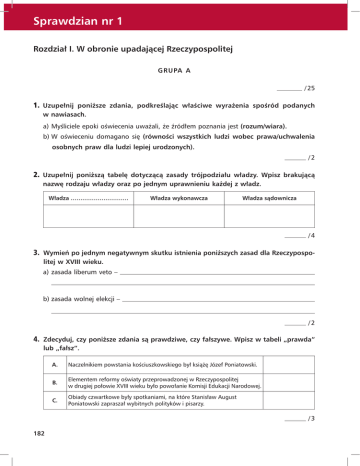 Sprawdzian nr 1 Rozdział I. W obronie upadającej Rzeczypospolitej G R UPA A / 25 1. Uzupełnij poniższe zdania, podkreślając właściwe wyrażenia spośród podanych w nawiasach. a) Myśliciele epoki oświecenia uważali, że źródłem poznania jest (rozum/wiara). b) W oświeceniu domagano się (równości wszystkich ludzi wobec prawa/uchwalenia osobnych praw dla ludzi lepiej urodzonych). /2 2. Uzupełnij poniższą tabelę dotyczącą zasady trójpodziału władzy. Wpisz brakującą nazwę rodzaju władzy oraz po jednym uprawnieniu każdej z władz. Władza ………………………… Władza wykonawcza Władza sądownicza /4 3. Wymień po jednym negatywnym skutku istnienia poniższych zasad dla Rzeczypospolitej w XVIII wieku. a) zasada liberum veto – b) zasada wolnej elekcji – /2 4. Zdecyduj, czy poniższe zdania są prawdziwe, czy fałszywe. Wpisz w tabeli „prawda” lub „fałsz”. A. Naczelnikiem powstania kościuszkowskiego był książę Józef Poniatowski. B. Elementem reformy oświaty przeprowadzonej w Rzeczypospolitej w drugiej połowie XVIII wieku było powołanie Komisji Edukacji Narodowej. C. Obiady czwartkowe były spotkaniami, na które Stanisław August Poniatowski zapraszał wybitnych polityków i pisarzy. /3 182 5. Wymień po jednej zasłudze Stanisława Augusta Poniatowskiego dla rozwoju: a) polskiej kultury – b) polskiej oświaty – /2 6. Wymień trzy przykłady reform uchwalonych przez Sejm Wielki. a) b) c) /3 7. Na poniższej taśmie chronologicznej zaznacz i zapisz datę wybuchu powstania kościuszkowskiego. 1600 1700 1800 /2 8. Napisz pojęcia obok ich definicji. a) najważniejsza w państwie ustawa, która zawiera między innymi prawa i obowiązki obywateli – b) chłopskie oddziały wojskowe uzbrojone w kosy, walczące w powstaniu kościuszkowskim – /2 9. Uzupełnij poniższe zdania. a) III rozbiór Rzeczypospolitej miał miejsce w b) Rozbiorów Rzeczypospolitej dokonały: i połowie wieku. , . /2 10. Wymień jedną przyczynę zewnętrzną i dwie przyczyny wewnętrzne upadku Rzeczypospolitej w XVIII wieku. Przyczyna zewnętrzna Przyczyny wewnętrzne /3 183 Sprawdzian nr 1 Rozdział I. W obronie upadającej Rzeczypospolitej G R UPA B / 25 1. Spośród wymienionych odkryć i wynalazków wskaż te, które są zdobyczą epoki oświecenia. Wypisz je pod ramką. szczepionka przeciw wściekliźnie • maszyna parowa • odkrycie Ameryki • łuk • odkrycie tlenu • kolej żelazna • wynalezienie pisma /2 2. Uzupełnij poniższą tabelę dotyczącą zasady trójpodziału władzy. Wpisz brakującą nazwę rodzaju władzy oraz po jednym uprawnieniu każdej z władz. Władza ………………………… Władza wykonawcza Władza sądownicza /4 3. Wymień po jednym negatywnym skutku poniższych zjawisk dla Rzeczypospolitej w XVIII wieku. a) zrywanie sejmów – b) opłacanie magnatów przez obce państwa – /2 4. Zdecyduj, czy poniższe zdania są prawdziwe, czy fałszywe. Wpisz w tabeli „prawda” lub „fałsz”. A. Liberum veto to zasada obowiązująca w XVIII-wiecznej Rzeczypospolitej umożliwiająca zerwanie sejmu przez jednego posła. B. Szkoła Rycerska była nowoczesną szkołą kształcącą oficerów. C. Obiady czwartkowe były spotkaniami, na które Stanisław August Poniatowski zapraszał przedstawicieli wszystkich stanów społecznych. /3 184 5. Wymień po jednej zasłudze Stanisława Augusta Poniatowskiego dla rozwoju: a) polskiej oświaty – b) polskich czasopism – /2 6. Wymień trzy postanowienia Konstytucji 3 maja. a) b) c) /3 7. Na poniższej taśmie chronologicznej zaznacz i zapisz datę III rozbioru Rzeczypospolitej. 1600 1700 1800 /2 8. Napisz pojęcia obok ich definicji. a) związek szlachty utworzony w celu przeprowadzenia zmian wewnętrznych – b) tytuł, który otrzymał Tadeusz Kościuszko jako dowódca powstania – /2 9. Uzupełnij poniższe zdania. a) Konstytucja 3 maja została uchwalona w b) Marszałek Sejmu Wielkiego nazywał się połowie wieku. . /2 10. Wymień jedną przyczynę zewnętrzną i dwie przyczyny wewnętrzne upadku Rzeczypospolitej w XVIII wieku. Przyczyna zewnętrzna Przyczyny wewnętrzne /3 185 Sprawdzian nr 1 Rozdział I. W obronie upadającej Rzeczypospolitej G R UPA C / 25 1. Spośród wymienionych odkryć i wynalazków wskaż te, które są zdobyczą epoki oświecenia. Wypisz je pod ramką. szczepionka przeciw wściekliźnie • maszyna parowa • odkrycie Ameryki • łuk • odkrycie tlenu • kolej żelazna • wynalezienie pisma /2 2. Uzupełnij poniższą tabelę dotyczącą zasady trójpodziału władzy. Wpisz brakującą nazwę rodzaju władzy oraz po jednym uprawnieniu każdej z władz. Władza ………………………… Władza wykonawcza Władza sądownicza /4 3. Wymień po jednym negatywnym skutku istnienia poniższych zasad dla Rzeczypospolitej w XVIII wieku. a) zasada liberum veto – b) zasada wolnej elekcji – /2 4. Zdecyduj, czy poniższe zdania są prawdziwe, czy fałszywe. Wpisz w tabeli „prawda” lub „fałsz”. A. Naczelnikiem powstania kościuszkowskiego był książę Józef Poniatowski. B. Elementem reformy oświaty przeprowadzonej w Rzeczypospolitej w drugiej połowie XVIII wieku było powołanie Komisji Edukacji Narodowej. C. Obiady czwartkowe były spotkaniami, na które Stanisław August Poniatowski zapraszał wybitnych polityków i pisarzy. /3 186 5. Wymień po jednej zasłudze Stanisława Augusta Poniatowskiego dla rozwoju: a) polskiej oświaty – b) polskich czasopism – /2 6. Wymień trzy postanowienia Konstytucji 3 maja. a) b) c) /3 7. Na poniższej taśmie chronologicznej zaznacz i zapisz datę wybuchu powstania kościuszkowskiego. 1600 1700 1800 /2 8. Napisz pojęcia obok ich definicji. a) związek szlachty utworzony w celu przeprowadzenia zmian wewnętrznych – b) tytuł, który otrzymał Tadeusz Kościuszko jako dowódca powstania – /2 9. Uzupełnij poniższe zdania. a) Konstytucja 3 maja została uchwalona w b) Marszałek Sejmu Wielki