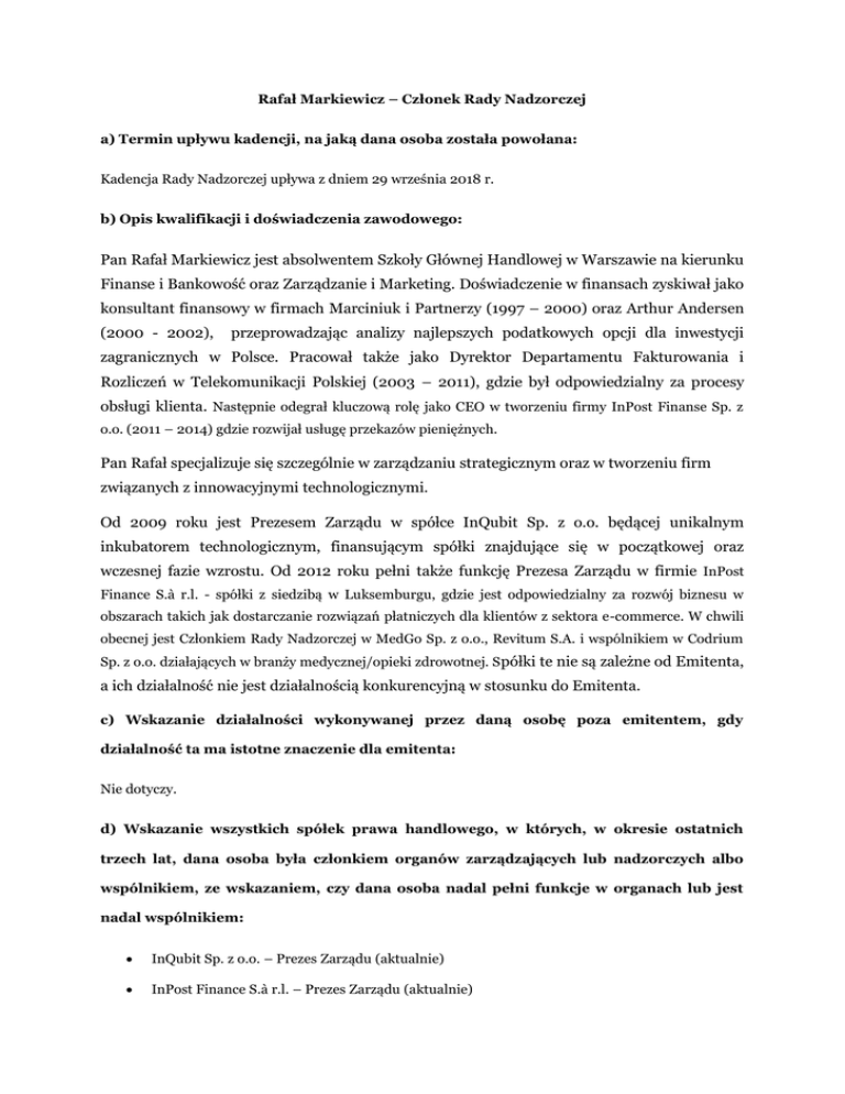 Rafał Markiewicz – Członek Rady Nadzorczej a) Termin upływu kadencji, na jaką dana osoba została powołana: Kadencja Rady Nadzorczej upływa z dniem 29 września 2018 r. b) Opis kwalifikacji i doświadczenia zawodowego: Pan Rafał Markiewicz jest absolwentem Szkoły Głównej Handlowej w Warszawie na kierunku Finanse i Bankowość oraz Zarządzanie i Marketing. Doświadczenie w finansach zyskiwał jako konsultant finansowy w firmach Marciniuk i Partnerzy (1997 – 2000) oraz Arthur Andersen (2000 - 2002), przeprowadzając analizy najlepszych podatkowych opcji dla inwestycji zagranicznych w Polsce. Pracował także jako Dyrektor Departamentu Fakturowania i Rozliczeń w Telekomunikacji Polskiej (2003 – 2011), gdzie był odpowiedzialny za procesy obsługi klienta. Następnie odegrał kluczową rolę jako CEO w tworzeniu firmy InPost Finanse Sp. z o.o. (2011 – 2014) gdzie rozwijał usługę przekazów pieniężnych. Pan Rafał specjalizuje się szczególnie w zarządzaniu strategicznym oraz w tworzeniu firm związanych z innowacyjnymi technologicznymi. Od 2009 roku jest Prezesem Zarządu w spółce InQubit Sp. z o.o. będącej unikalnym inkubatorem technologicznym, finansującym spółki znajdujące się w początkowej oraz wczesnej fazie wzrostu. Od 2012 roku pełni także funkcję Prezesa Zarządu w firmie InPost Finance S.à r.l. - spółki z siedzibą w Luksemburgu, gdzie jest odpowiedzialny za rozwój biznesu w obszarach takich jak dostarczanie rozwiązań płatniczych dla klientów z sektora e-commerce. W chwili obecnej jest Członkiem Rady Nadzorczej w MedGo Sp. z o.o., Revitum S.A. i wspólnikiem w Codrium Sp. z o.o. działających w branży medycznej/opieki zdrowotnej. S półki te nie są zależne od Emitenta, a ich działalność nie jest działalnością konkurencyjną w stosunku do Emitenta. c) Wskazanie działalności wykonywanej przez daną osobę poza emitentem, gdy działalność ta ma istotne znaczenie dla emitenta: Nie dotyczy. d) Wskazanie wszystkich spółek prawa handlowego, w których, w okresie ostatnich trzech lat, dana osoba była członkiem organów zarządzających lub nadzorczych albo wspólnikiem, ze wskazaniem, czy dana osoba nadal pełni funkcje w organach lub jest nadal wspólnikiem: InQubit Sp. z o.o. – Prezes Zarządu (aktualnie) InPost Finance S.à r.l. – Prezes Zarządu (aktualnie) MedGo Sp. z o.o. – członek Rady Nadzorczej (aktualnie) Revitum S.A. – członek Rady Nadzorczej (aktualnie) Codrium Sp. z o.o. - wspólnik (aktualnie) Profeskasa S.A. – Członek Zarządu (2012 – 2013) DBMS Sp. z o.o. (dawniej: 87 RS Mobcomer GT) – Wspólnik (2012-2014) e) Informacje na temat prawomocnych wyroków, na mocy których dana osoba została skazana za przestępstwa oszustwa w okresie co najmniej ostatnich pięciu lat oraz wskazanie, czy w okresie co najmniej ostatnich pięciu lat osoba taka otrzymała sądowy zakaz działania jako członek organów zarządzających lub nadzorczych w spółkach prawa handlowego: Nie dotyczy. f) Szczegóły wszystkich przypadków upadłości, zarządu komisarycznego lub likwidacji, w okresie co najmniej ostatnich pięciu lat, w odniesieniu do podmiotów, w których dana osoba pełniła funkcje członka organu zarządzającego lub nadzorczego: Nie dotyczy. g) Informacje, czy dana osoba prowadzi działalność, która jest konkurencyjna w stosunku do działalności emitenta, oraz czy jest wspólnikiem konkurencyjnej spółki cywilnej lub osobowej albo członkiem organu spółki kapitałowej lub członkiem organu jakiejkolwiek konkurencyjnej osoby prawnej: Nie dotyczy. h) Informacje, czy dana osoba figuruje w rejestrze dłużników niewypłacalnych, prowadzonym na podstawie ustawy z dnia 20 sierpnia 1997 r. o Krajowym Rejestrze Sądowym: Nie figuruje.