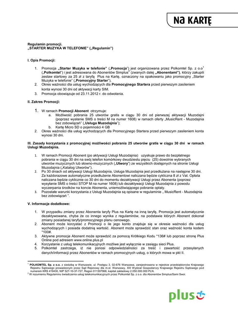 Regulamin promocji. „STARTER MUZYKA W TELEFONIE” („Regulamin”) I. Opis Promocji: 1. 2. 3. 1 Promocja „Starter Muzyka w telefonie” („Promocja”) jest organizowana przez Polkomtel Sp. z o.o 2 („Polkomtel”) i jest adresowana do Abonentów Simplus (zwanych dalej „Abonentami”), którzy zakupili zestaw startowy za 25 zł z taryfą Plus na Kartę, oznaczony na opakowaniu jako promocyjny „Starter Muzyka w telefonie” („Promocyjny Starter”), Okres ważności dla usług wychodzących dla Promocyjnego Startera przed pierwszym zasileniem konta wynosi 30 dni od aktywacji karty SIM. Promocja obowiązuje od 23.11.2012 r. do odwołania. II. Zakres Promocji: 1. 2. W ramach Promocji Abonent otrzymuje: a. Możliwość pobrania 25 utworów gratis w ciągu 30 dni od pierwszej aktywacji Muzodajni (poprzez wysłanie SMS o treści M na numer 1608) w ramach oferty „MusicRent - Muzodajnia bez zobowiązań” („Usługa Muzodajnia”); b. Kartę Micro SD o pojemności 4 GB Okres ważności dla usług wychodzących dla Promocyjnego Startera przed pierwszym zasileniem konta wynosi 30 dni. III. Zasady korzystania z promocyjnej możliwości pobrania 25 utworów gratis w ciągu 30 dni w ramach Usługi Muzodajnia. 1. 2. 3. W ramach Promocji Abonent (po aktywacji Usługi Muzodajnia) uzyskuje prawo do bezpłatnego pobrania w ciągu 30 dni na swój telefon komórkowy dwudziestu pięciu (25) dowolnie wybranych utworów muzycznych lub słowno-muzycznych („Utwory”) ze wszystkich dostępnych na stronie Usługi Muzodajnia („Katalog Utworów”). Po 30 dniach od aktywacji Usługi Muzodajnia, Usługa Muzodajnia jest przedłużana na następne 30 dni. Za każdorazowe automatyczne przedłużenie Abonentowi naliczana będzie cykliczna 8 zł z Vat. Opłata naliczana będzie cyklicznie co 30 dni do momentu dezaktywacji Usługi przez Abonenta (poprzez wysyłanie SMS o treści STOP M na numer 1608) lub dezaktywacji Usługi Muzodajnia z powodu wyczerpania środków na koncie Abonenta, uniemożliwiającego pobranie opłaty. Pozostałe warunki korzystania z Usługi Muzodajnia są opisane w regulaminie „ MusicRent - Muzodajnia bez zobowiązań ”. V. Informacje dodatkowe: 1. 2. 3. 4. 5. 1 W przypadku zmiany przez Abonenta taryfy Plus na Kartę na inną taryfę, Promocja jest automatycznie dezaktywowana, chyba że co innego wynika z regulaminów, na podstawie których Abonent dokonał zmiany posiadanej taryfy/promocyjnego planu cenowego. Abonent może korzystać z Promocji o ile jego konto znajduje się w okresie ważności dla usług wychodzących i posiada dodatnią wartość. Abonent może sprawdzić stan oraz ważność konta kodem *100#. Aktywne promocje Abonent może sprawdzić za pomocą Krótkiego Kodu *136# lub poprzez stronę Plus Online pod adresem www.online.plus.pl Korzystanie z usług telekomunikacyjnych możliwe jest wyłącznie w zasięgu sieci Plus. Polkomtel zastrzega, iż nie ponosi odpowiedzialności za treść i zawartość przesyłanych danych/informacji przez Abonentów w ramach promocyjnych usług, o których mowa w pkt II. POLKOMTEL Sp. z o.o. z siedzibą w Warszawie, ul. Postępu 3, 02-676 Warszawa, zarejestrowana w rejestrze przedsiębiorców Krajowego Rejestru Sądowego prowadzonym przez Sąd Rejonowy dla m.st. Warszawy, XIII Wydział Gospodarczy Krajowego Rejestru Sądowego pod numerem KRS 419430, NIP 527-10-37-727, Regon 011307968, kapitał zakładowy 2.050.000.000 PLN. 2 W rozumieniu Regulaminu świadczenia usług telekomunikacyjnych przez Polkomtel Sp. z o.o. dla Abonentów Simplus/Sami Swoi. 6. 7. 8. Polkomtel zastrzega możliwość zmiany Regulaminu lub zakończenia Promocji bez konieczności podawania przyczyn. Informacja o zmianie Regulaminu lub zakończeniu Promocji zostanie podana przez Polkomtel do wiadomości na stronie internetowej www.plus.pl. W kwestiach nieuregulowanych niniejszym Regulaminem zastosowanie mają postanowienia Regulaminu świadczenia usług telekomunikacyjnych przez Polkomtel Sp. z o.o. dla Abonentów Simplus/ Sami Swoi, a w zakresie korzystania z serwisu Muzodajnia – regulaminu „MusicRent – Muzodajnia bez zobowiązań”. Regulamin dostępny jest na stronie internetowych www.plus.pl oraz w siedzibie Polkomtel, a regulamin „MusicRent – Muzodajnia bez zobowiązań” na stronie www.muzodajnia.pl.