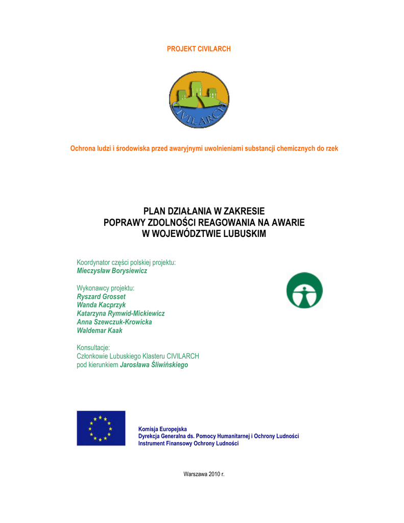 PROJEKT CIVILARCH Ochrona ludzi i środowiska przed awaryjnymi uwolnieniami substancji chemicznych do rzek PLAN DZIAŁANIA W ZAKRESIE POPRAWY ZDOLNOŚCI REAGOWANIA NA AWARIE W WOJEWÓDZTWIE LUBUSKIM Koordynator części polskiej projektu: Mieczysław Borysiewicz Wykonawcy projektu: Ryszard Grosset Wanda Kacprzyk Katarzyna Rymwid-Mickiewicz Anna Szewczuk-Krowicka Waldemar Kaak Konsultacje: Członkowie Lubuskiego Klasteru CIVILARCH pod kierunkiem Jarosława Śliwińskiego Komisja Europejska Dyrekcja Generalna ds. Pomocy Humanitarnej i Ochrony Ludności Instrument Finansowy Ochrony Ludności Warszawa 2010 r. PLAN DZIAŁANIA - LUBUSKIE Mechanizm finansowania: Instrument Finansowy Ochrony Ludności Obszar strategiczny projektu: Gotowość (w zakresie reagowania w sytuacjach kryzysowych) Tytuł projekt: Ochrona ludzi i środowiska przed awaryjnymi uwolnieniami substancji chemicznych do rzek Akronim projektu: CIVILARCH Numer umowy projektu: 070401/2008/507817/SUB/A3 Okres realizacji projektu: 1.10.2008 r. – 30.09.2010 r. Beneficjent: Region Wschodniej Macedonii i Tracji Beneficjent Zrzeszony: Instytut Ochrony Środowiska Zadanie: E. Ustanowienie narzędzi administracyjnych i zaplanowanie działań Działanie: E.1. Planowanie dalszych działań Raport: Realizacja: Plan działania w zakresie poprawy zdolności reagowania na awarie w województwie lubuskim od marca 2010 r. do września 2010 r. Niniejszy raport opracowano w Instytucie Ochrony Środowiska w ramach projektu CIVILARCH „Ochrona ludzi i środowiska przed awaryjnymi uwolnieniami substancji chemicznych do rzek”, który jest realizowany dzięki wsparciu finansowemu Wspólnoty Europejskiej z Instrumentu Finansowego Ochrony Ludności. Zaprezentowane w raporcie informacje odzwierciedlają poglądy autorów. Komisja Europejska nie ponosi prawnej odpowiedzialności za jakiekolwiek skutki wynikające z ich wykorzystania. 2 PLAN DZIAŁANIA - LUBUSKIE Spis treści Str. Streszczenie ............................................................................................................................5 Wprowadzenie..........................................................................................................................7 1. Podstawa i cel opracowania planu działania.........................................................................9 2. Cele szczegółowe i priorytety planu działania .......................................................................9 3. Proponowane działania i inwestycje ..................................................................................11 Priorytet I. Zapobieganie awariom przemysłowym i ograniczanie ich skutków............................... 13 Działanie I.1. Wzmocnienie etatowe PSP i WIOŚ (działanie kluczowe)................................................ 14 Działanie I.2. Kontrola zakładów przemysłowych (działanie kluczowe) ................................................ 15 Działanie I.3. Wdrożenie środków z zakresu planowania przestrzennego w kontekście ograniczania ryzyka awarii........................................................................ 16 Działanie I.4. Zapobieganie wtórnym zanieczyszczeniom wód w wyniku zagrożeń powodziowych................................................................................. 17 Działanie I.5. Zapobieganie awariom u źródła (działanie kluczowe) ..................................................... 17 Priorytet II. Gotowość na zdarzenia awaryjne ...................................................................................... 19 Działanie II.1. Ustanowienie Centrum Powiadamiania Ratunkowego w Gorzowie Wielkopolskim........ 22 Działanie II.2. Dalsza rozbudowa systemu łączności, alarmowania i ostrzegania ludności .................. 23 Działanie II.3. Szkolenia i ćwiczenia w zakresie reagowania na awarie (działanie kluczowe)............... 23 Działanie II.4. Wzmocnienie zaplecza badawczego wspierającego system reagowania na awarie (działanie kluczowe) ...................................................................................... 24 Kontynuowanie współpracy bilateralnej z Niemcami w dziedzinie awarii transgranicznych.................................................................................................. 25 Działanie II.5. Priorytet III. Reagowanie na awarie z udziałem substancji niebezpiecznych ..................................... 26 Działanie III.1. Wzmocnienie możliwości technicznych służb włączonych w akcję ratowniczą (działanie kluczowe) ....................................................................... 29 Działanie III.2. Sporządzenie wojewódzkiego planu zarządzania ryzykiem ........................................... 31 Działanie III.3. Wdrażanie Wojewódzkiego Planu Reagowania Kryzysowego (działanie kluczowe) ....................................................................................................... 32 Działanie III.4. Rozwój i utrzymanie Systemu Państwowe Ratownictwo Medyczne (działanie kluczowe) ....................................................................................................... 32 3 PLAN DZIAŁANIA - LUBUSKIE Priorytet IV. Ochrona wód i uporządkowanie gospodarki ściekowej .................................................. 33 Działanie IV.1. Wzmocnienie możliwości laboratoryjnych WIOŚ (działanie kluczowe) .......................... 35 Działanie IV.2. Wzmocnienie możliwości laboratoryjnych WSSE (działanie kluczowe) ......................... 36 Działanie IV.3. Uporządkowanie gospodarki ściekowej w aglomeracjach powyżej 15 tys. RLM .......................................................................... 36 Działanie IV.4. Uporządkowanie gospodarki ściekowej w aglomeracjach od 2 tys. do 15 tys. RLM..................................................................... 37 Działanie IV.5. Uporządkowanie gospodarki ściekowej w zakładach przemysłowych ........................... 37 Prioryt