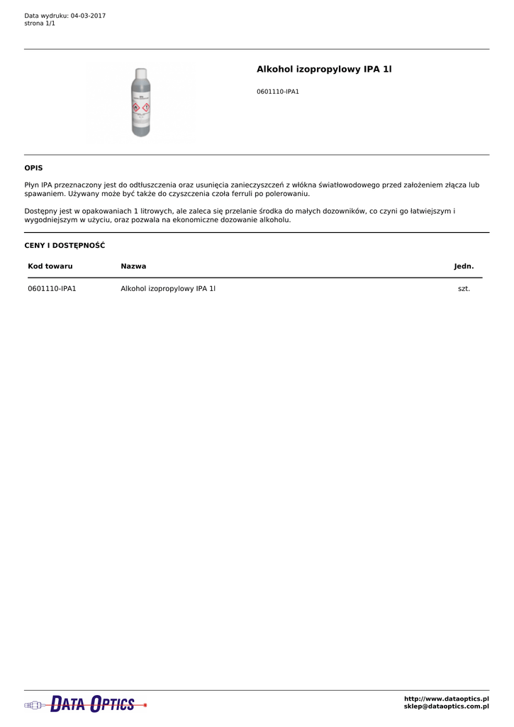 Data wydruku: 04-03-2017 strona 1/1 Alkohol izopropylowy IPA 1l 0601110-IPA1 OPIS Płyn IPA przeznaczony jest do odtłuszczenia oraz usunięcia zanieczyszczeń z włókna światłowodowego przed założeniem złącza lub spawaniem. Używany może być także do czyszczenia czoła ferruli po polerowaniu. Dostępny jest w opakowaniach 1 litrowych, ale zaleca się przelanie środka do małych dozowników, co czyni go łatwiejszym i wygodniejszym w użyciu, oraz pozwala na ekonomiczne dozowanie alkoholu. CENY I DOSTĘPNOŚĆ Kod towaru Nazwa 0601110-IPA1 Alkohol izopropylowy IPA 1l Jedn. szt. http://www.dataoptics.pl [email protected] Powered by TCPDF (www.tcpdf.org)