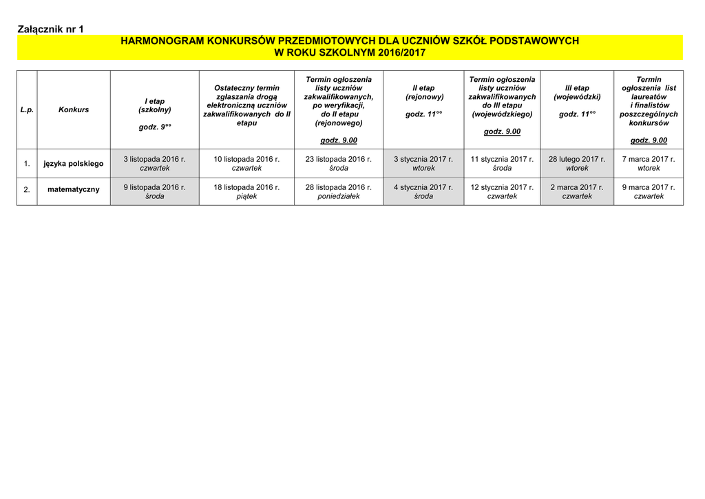 Załącznik nr 1 HARMONOGRAM KONKURSÓW PRZEDMIOTOWYCH DLA UCZNIÓW SZKÓŁ PODSTAWOWYCH W ROKU SZKOLNYM 2016/2017 L.p. Konkurs I etap (szkolny) godz. 9°° Ostateczny termin zgłaszania drogą elektroniczną uczniów zakwalifikowanych do II etapu Termin ogłoszenia listy uczniów zakwalifikowanych, po weryfikacji, do II etapu (rejonowego) II etap (rejonowy) godz. 11°° Termin ogłoszenia listy uczniów zakwalifikowanych do III etapu (wojewódzkiego) III etap (wojewódzki) godz. 11°° Termin ogłoszenia list laureatów i finalistów poszczególnych konkursów godz. 9.00 godz. 9.00 godz. 9.00 1. języka polskiego 3 listopada 2016 r. czwartek 10 listopada 2016 r. czwartek 23 listopada 2016 r. środa 3 stycznia 2017 r. wtorek 11 stycznia 2017 r. środa 28 lutego 2017 r. wtorek 7 marca 2017 r. wtorek 2. matematyczny 9 listopada 2016 r. środa 18 listopada 2016 r. piątek 28 listopada 2016 r. poniedziałek 4 stycznia 2017 r. środa 12 stycznia 2017 r. czwartek 2 marca 2017 r. czwartek 9 marca 2017 r. czwartek