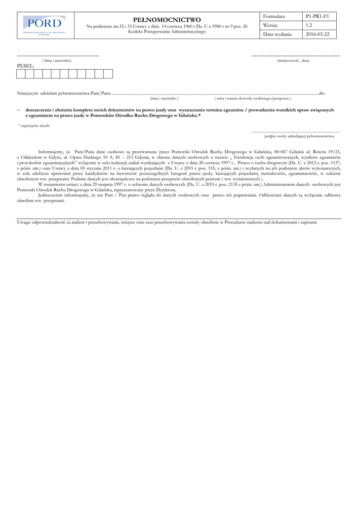 PEŁNOMOCNICTWO Na podstawie art.32 i 33 Ustawy z dnia 14 czerwca 1960 r Dz. U z 1980 r nr 9 poz. 26 Kodeks Postępowania Administracyjnego .................................................... Formularz P1-PR1-F1 Wersja 1.2 Data wydania 2016-03-22 ........................................................ ( Imię i nazwisko) (miejscowość , data) PESEL: Niniejszym udzielam pełnomocnictwa Pani/Panu .....................................................................................................................................................................................................do: (imię i nazwisko ) ( seria i numer dowodu osobistego/paszportu ) dostarczenia i złożenia kompletu moich dokumentów na prawo jazdy oraz wyznaczania terminu egzaminu / prowadzenia wszelkich spraw związanych z egzaminem na prawo jazdy w Pomorskim Ośrodku Ruchu Drogowego w Gdańsku.* * niepotrzebne skreślić .................................................................................... podpis osoby udzielającej pełnomocnictwa Informujemy, że Pani/Pana dane osobowe są przetwarzane przez Pomorski Ośrodek Ruchu Drogowego w Gdańsku, 80-067 Gdańsk ul. Równa 19/21, z Oddziałem w Gdyni, ul. Opata Hackiego 10 A, 81 – 213 Gdynia, w zbiorze danych osobowych o nazwie „ Ewidencja osób egzaminowanych, wyników egzaminów i protokołów egzaminacyjnych” wyłącznie w celu realizacji zadań wynikających z Ustawy z dnia 20 czerwca 1997 r., Prawo o ruchu drogowym (Dz. U. z 2012 r. poz. 1137, z późn. zm.) oraz Ustawy z dnia 05 stycznia 2011 r. o kierujących pojazdami (Dz. U. z 2015 r. poz. 155, z późn. zm.) i wydanych na ich podstawie aktów wykonawczych, w celu zdobycia uprawnień przez kandydatów na kierowców poszczególnych kategorii prawa jazdy, kierujących pojazdami, instruktorów, egzaminatorów, w zakresie określonym ww. przepisami. Podanie danych jest obowiązkowe na podstawie przepisów określonych prawem ( ww. wymienionych ). W rozumieniu ustawy z dnia 29 sierpnia 1997 r. o ochronie danych osobowych (Dz. U. z 2015 r. poz. 2135 z późn. zm.) Administratorem danych osobowych jest Pomorski Ośrodek Ruchu Drogowego w Gdańsku, reprezentowany przez Dyrektora. Jednocześnie informujemy, że ma Pani / Pan prawo wglądu do danych osobowych oraz prawo ich poprawiania. Odbiorcami danych są wyłącznie odbiorcy określeni ww. przepisami. Uwaga: odpowiedzialność za nadzór i przechowywanie, miejsce oraz czas przechowywania zostały określone w Procedurze nadzoru nad dokumentami i zapisami.