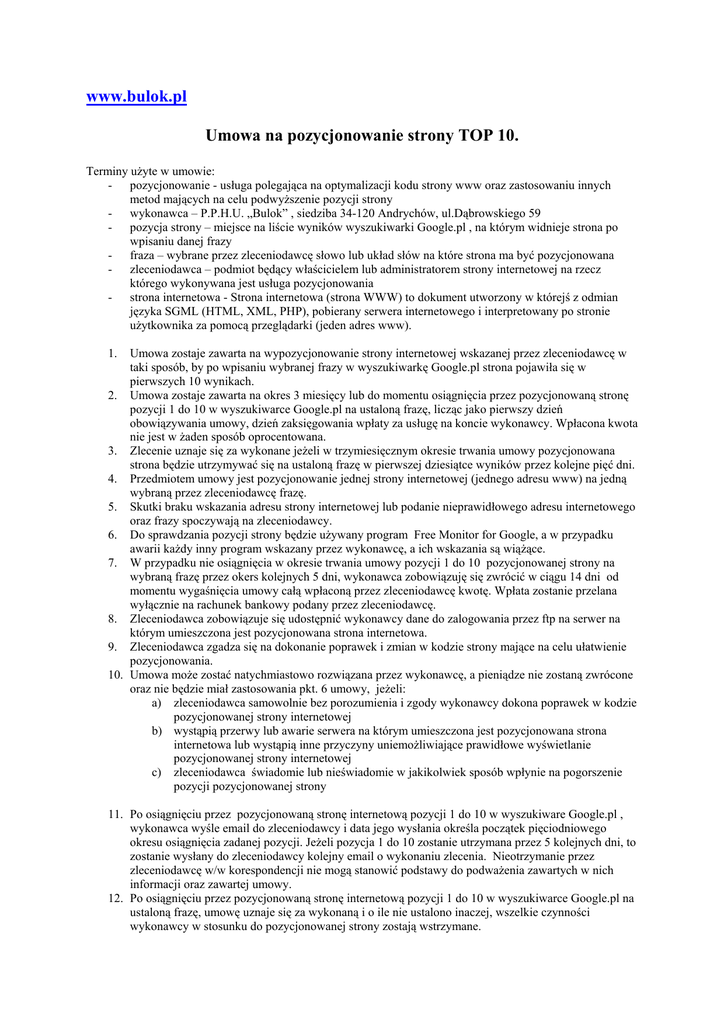 www.bulok.pl Umowa na pozycjonowanie strony TOP 10.