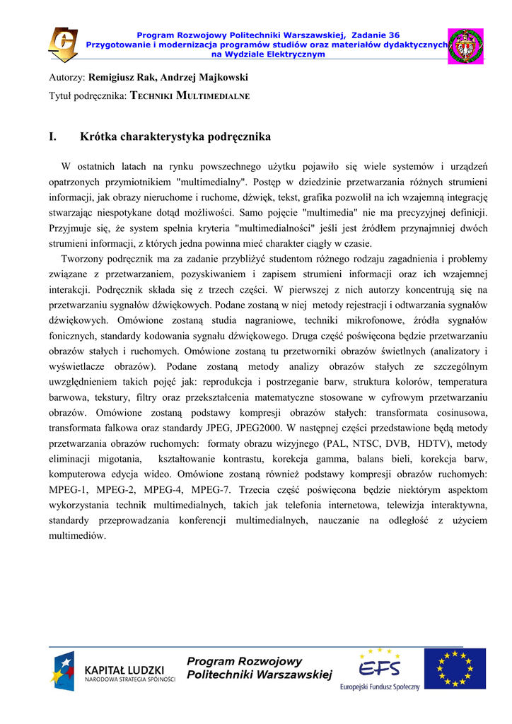 Program Rozwojowy Politechniki Warszawskiej, Zadanie 36 Przygotowanie i modernizacja programów studiów oraz materiałów dydaktycznych na Wydziale Elektrycznym Autorzy: Remigiusz Rak, Andrzej Majkowski Tytuł podręcznika: TECHNIKI MULTIMEDIALNE I. Krótka charakterystyka podręcznika W ostatnich latach na rynku powszechnego użytku pojawiło się wiele systemów i urządzeń opatrzonych przymiotnikiem "multimedialny". Postęp w dziedzinie przetwarzania różnych strumieni informacji, jak obrazy nieruchome i ruchome, dźwięk, tekst, grafika pozwolił na ich wzajemną integrację stwarzając niespotykane dotąd możliwości. Samo pojęcie "multimedia" nie ma precyzyjnej definicji. Przyjmuje się, że system spełnia kryteria "multimedialności" jeśli jest źródłem przynajmniej dwóch strumieni informacji, z których jedna powinna mieć charakter ciągły w czasie. Tworzony podręcznik ma za zadanie przybliżyć studentom różnego rodzaju zagadnienia i problemy związane z przetwarzaniem, pozyskiwaniem i zapisem strumieni informacji oraz ich wzajemnej interakcji. Podręcznik składa się z trzech części. W pierwszej z nich autorzy koncentrują się na przetwarzaniu sygnałów dźwiękowych. Podane zostaną w niej metody rejestracji i odtwarzania sygnałów dźwiękowych. Omówione zostaną studia nagraniowe, techniki mikrofonowe, źródła sygnałów fonicznych, standardy kodowania sygnału dźwiękowego. Druga część poświęcona będzie przetwarzaniu obrazów stałych i ruchomych. Omówione zostaną tu przetworniki obrazów świetlnych (analizatory i wyświetlacze obrazów). Podane zostaną metody analizy obrazów stałych ze szczególnym uwzględnieniem takich pojęć jak: reprodukcja i postrzeganie barw, struktura kolorów, temperatura barwowa, tekstury, filtry oraz przekształcenia matematyczne stosowane w cyfrowym przetwarzaniu obrazów. Omówione zostaną podstawy kompresji obrazów stałych: transformata cosinusowa, transformata falkowa oraz standardy JPEG, JPEG2000. W następnej części przedstawione będą metody przetwarzania obrazów ruchomych: formaty obrazu wizyjnego (PAL, NTSC, DVB, HDTV), metody eliminacji migotania, kształtowanie kontrastu, korekcja gamma, balans bieli, korekcja barw, komputerowa edycja wideo. Omówione zostaną również podstawy kompresji obrazów ruchomych: MPEG-1, MPEG-2, MPEG-4, MPEG-7. Trzecia część poświęcona będzie niektórym aspektom wykorzystania technik multimedialnych, takich jak telefonia internetowa, telewizja interaktywna, standardy przeprowadzania konferencji multimedialnych, nauczanie na odległość z użyciem multimediów. Program Rozwojowy Politechniki Warszawskiej, Zadanie 36 Przygotowanie i modernizacja programów studiów oraz materiałów dydaktycznych na Wydziale Elektrycznym II. Spis treści Przetwarzanie sygnałów dźwiękowych 1. a) b) c) d) Rejestracja sygnałów dźwiękowych wyposażenie sprzętowe studia nagrań dźwiękowych mikrofony i techniki mikrofonowe metody zapisu i obróbki sygnałów fonicznych karty dźwiękowe 2. Odtwarzanie sygnałów dźwiękowych a) analogowe i cyfrowe źródła sygnałów fonicznych b) przedwzmacniacze i wzmacniacze foniczne 3. Standardy kodowania i kompresji sygnału dźwiękowego Przetwarzanie obrazów 1. Przetworniki obrazów świetlnych a) analizatory obrazów CCD, CMOS b) wyświetlacze obrazów: ekrany plazmowe, ekrany ciekłokrystaliczne 2. Obrazy stałe a) Analiza obrazów cyfrowych - reprodukcja i postrzeganie barw, struktura kolorów - przekształcenia matematyczne stosowane w cyfrowym przetwarzaniu obrazów b) Kompresja obrazów stałych - transformata kosinusowa - JPEG, JPEG2000 3. Obrazy ruchome a) Cyfrowe przetwarzanie sekwencji obrazów - formaty obrazu wizyjnego: PAL, NTSC, DVB, HDTV - kształtowanie kontrastu, korekcja gamma, balans bieli, korekcja barw, eliminacja migotania - komputerowa edycja wideo b) Kompresja obrazów ruchomych - MPEG-1, MPEG-2, MPEG-4, MPEG-7 Wykorzystanie technik multimedialnych 1. 2. 3. 4. 5. 6. 7. Kino domowe Projektowanie prezentacji multimedialnych Fotografia cyfrowa Media strumieniowe Telefonia internetowa Standardy przeprowadzania konferencji multimedialnych Multimedia w edukacji Program Rozwojowy Politechniki Warszawskiej, Zadanie 36 Przygotowanie i modernizacja programów studiów oraz materiałów dydaktycznych na Wydziale Elektrycznym III. Literatura uzupełniająca 1. Jerry Gibson, Multimedia Communications, Academic Press, 2001 2. Ling Guan, Sun-Yuam Kung, Jan Larsen, Multimedia Image and Video Processing, CRC Press, 2001 3. Ian Sincler, Audio and Hi-Fi Handbook, Newnes, 1998 4. Philip A. Laplante, Image and video compression for multimedia engineering, CRC Press, 2000 5. Atul Puri, Multimedia Systems Standards and Networks, Marcel Dekker, New York, 2000 6. Lajos Hanzo, Peter Cherriman, Jurgen Streit, Video Compression and Communications, John Wiley & Sons, 2007 7. Andreas Spanias, Ted Painter, Venkatraman Atti, Audio signal processing and coding, John Wiley & Sons, 2007 8. Smart Ganguly, Sudeept Bhatnager, VoIP, John Wiley & Sons, 2008